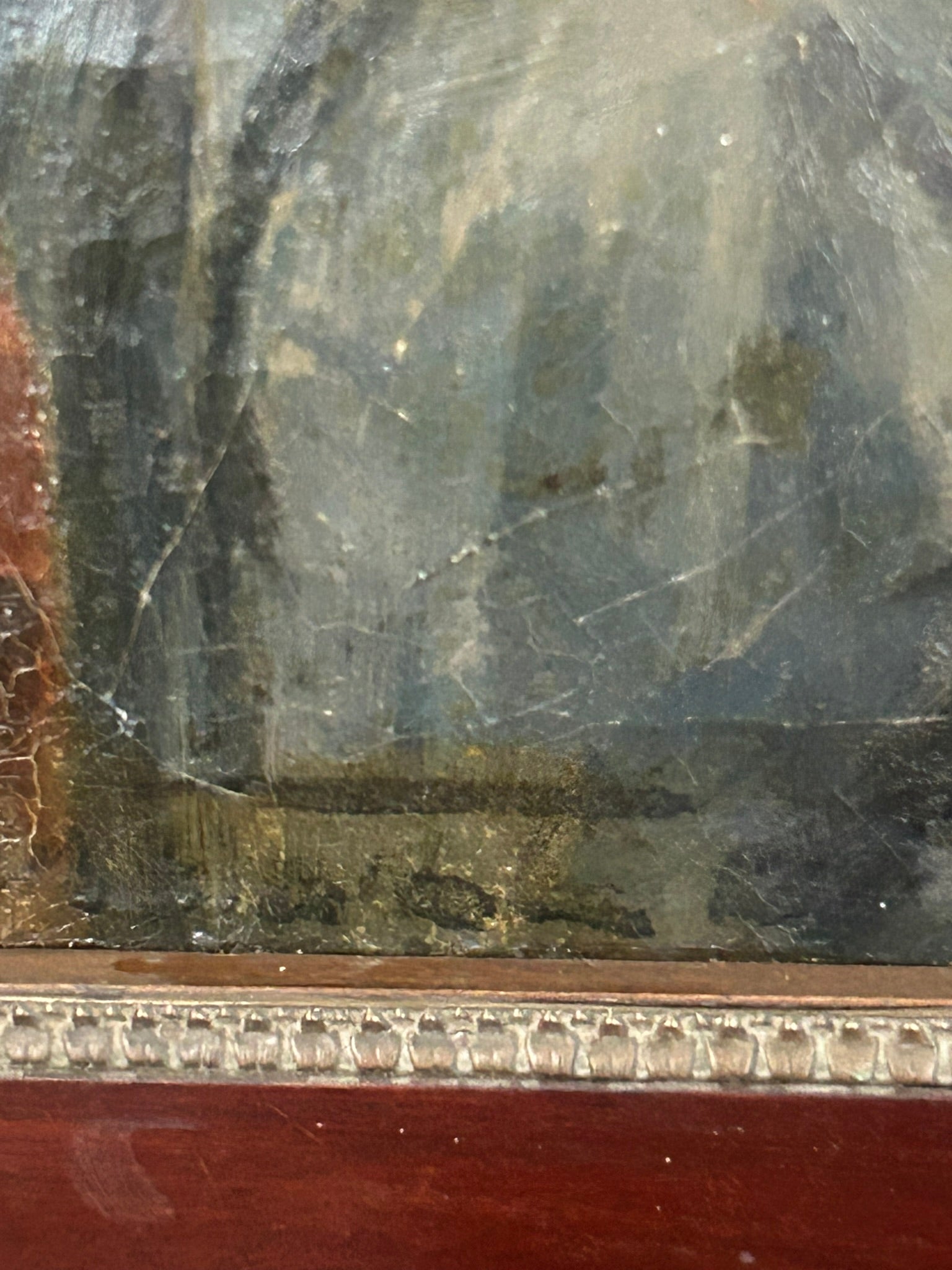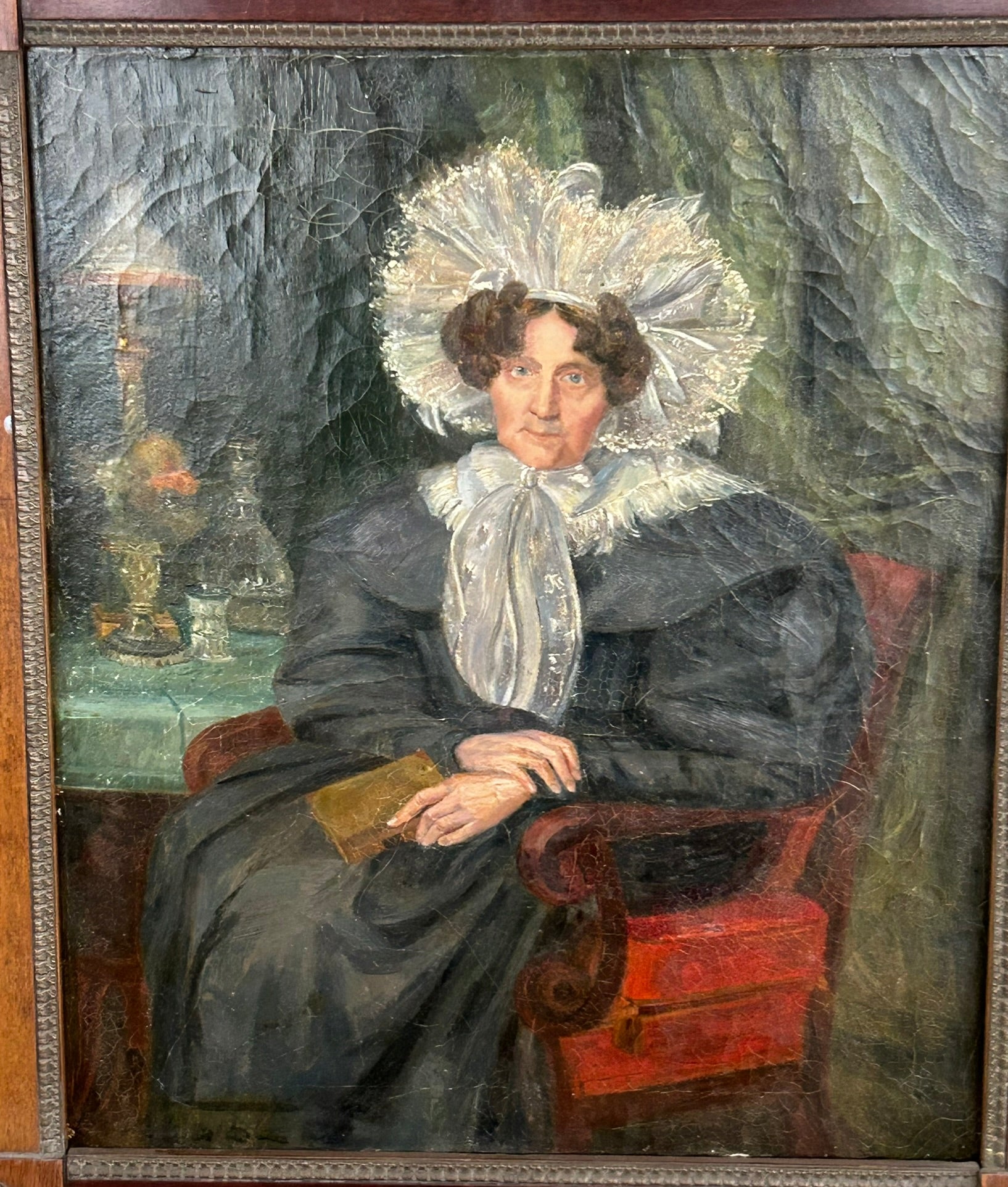 ANTIQUE PORTRAIT PAINTING OF MID 1800's FANCY DRESSED WOMAN IN PERIOD FRAME 22" X 19" INCLUDING FRAME. CALL OR TEXT FOR MORE INFORMATION