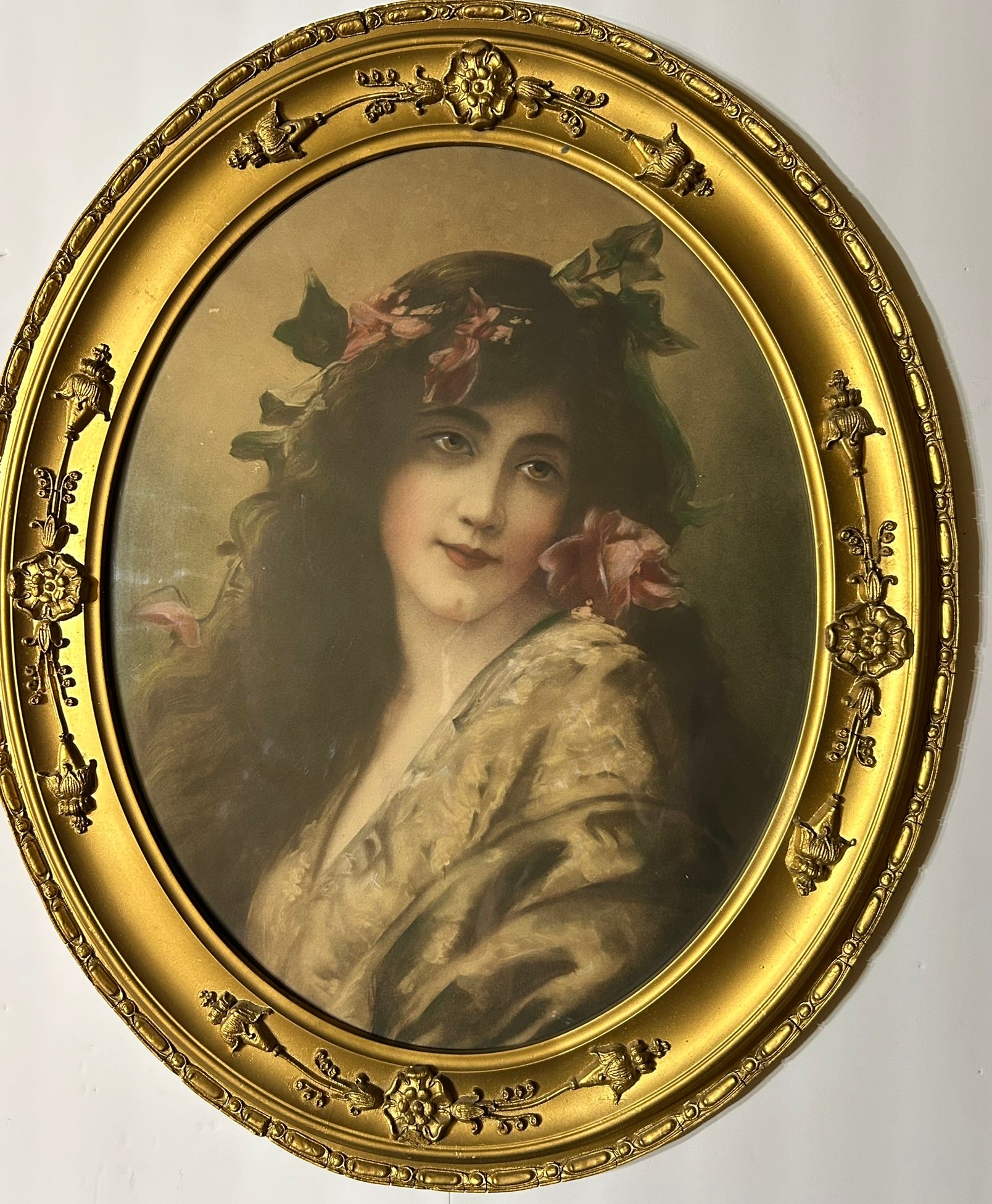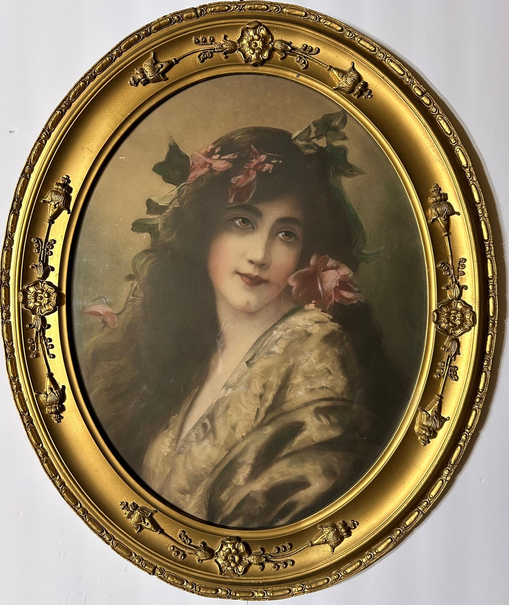 ANTIQUE HAND TINTED PORTRAIT OF PRETTY GIRL WITH FLORAL ACCENTS 25" X 21" OVERALL. ALL OR TEXT FOR MORE INFORMATION