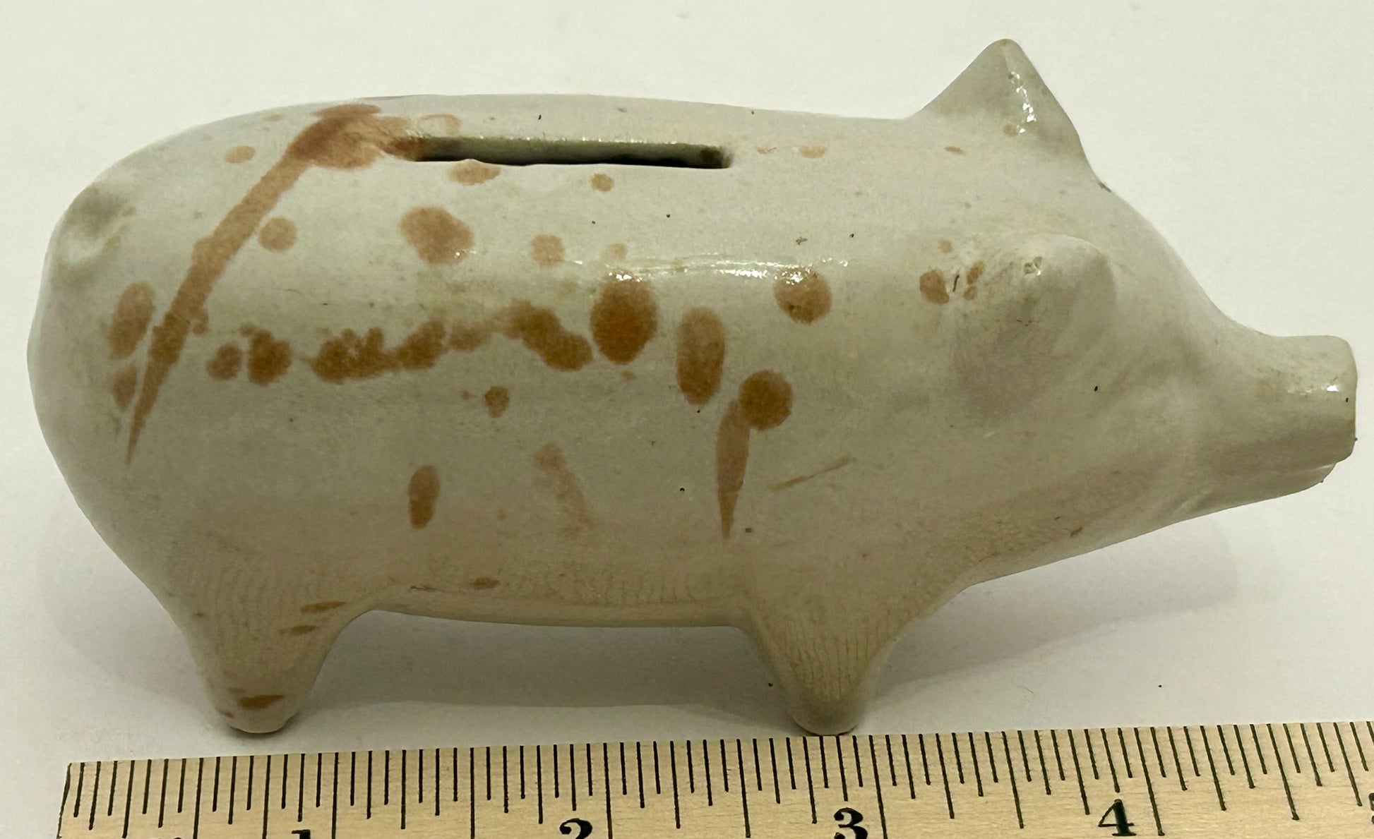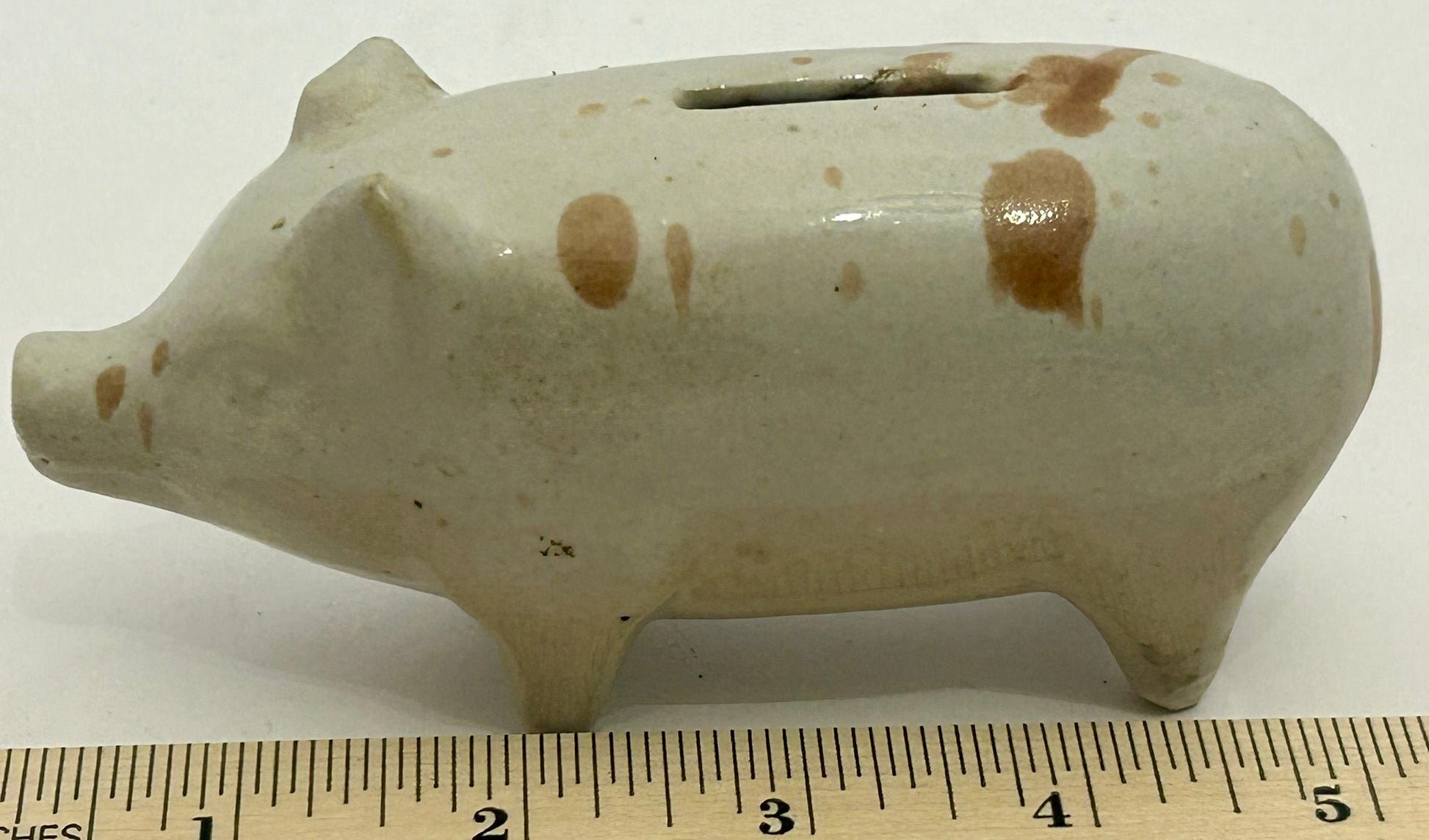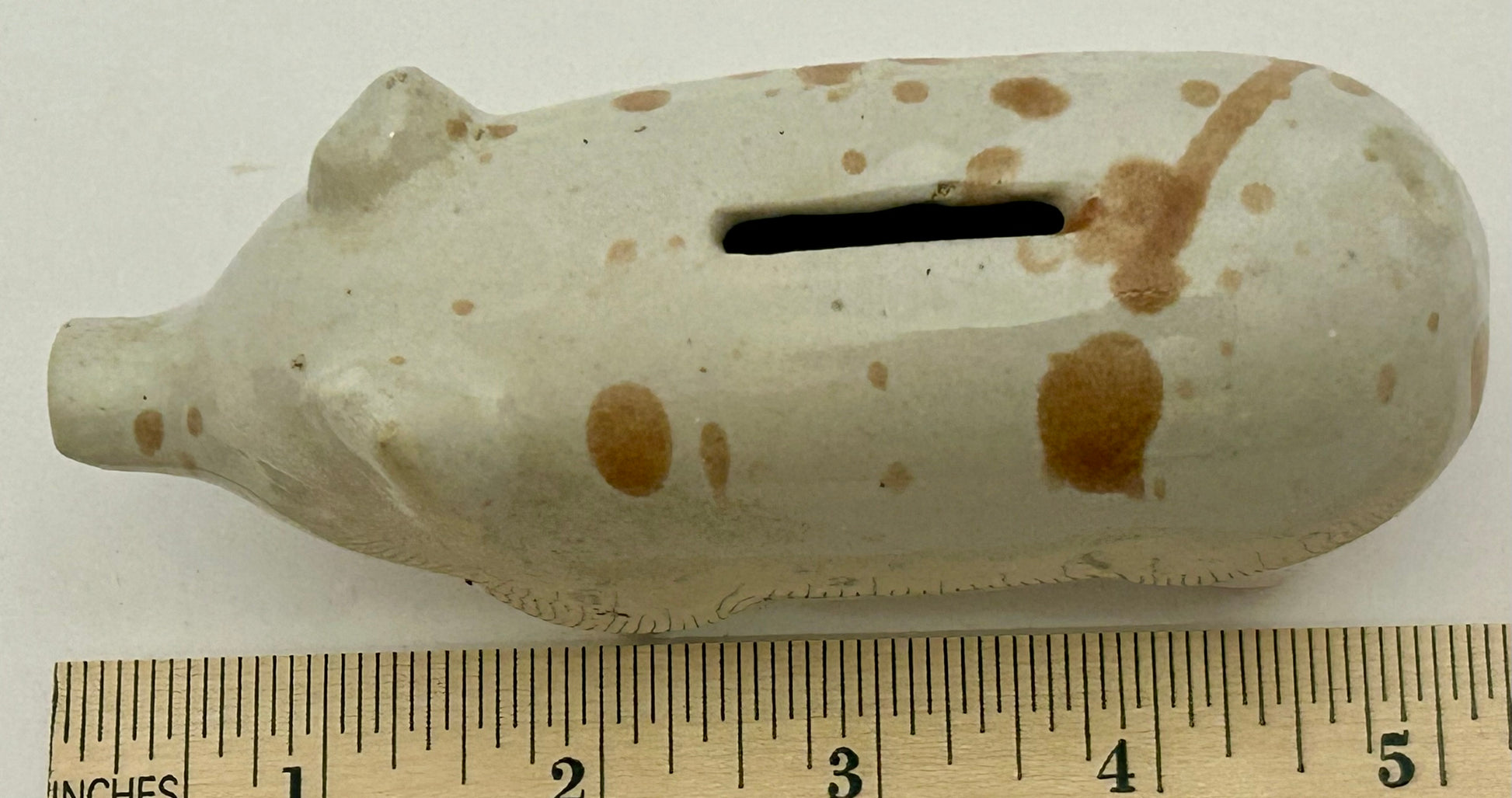 ANTIQUE POTTERY PIG BANK 5" LONG X 2 1/2" TALL. CALL OR TEXT FOR MORE INFORMATION