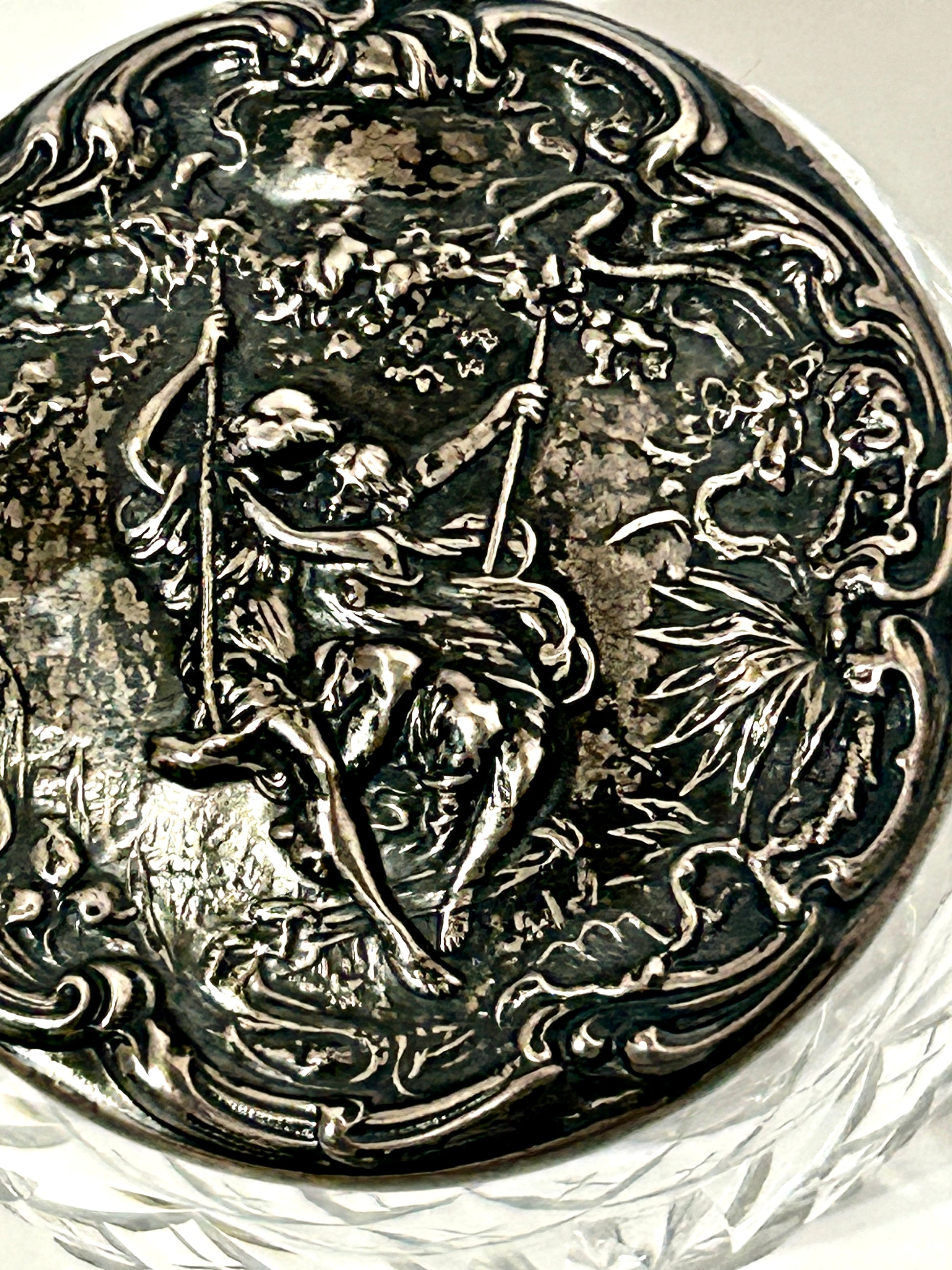 ANTIQUE POWDER JAR STERLING "LOVERS" LID ON GLASS