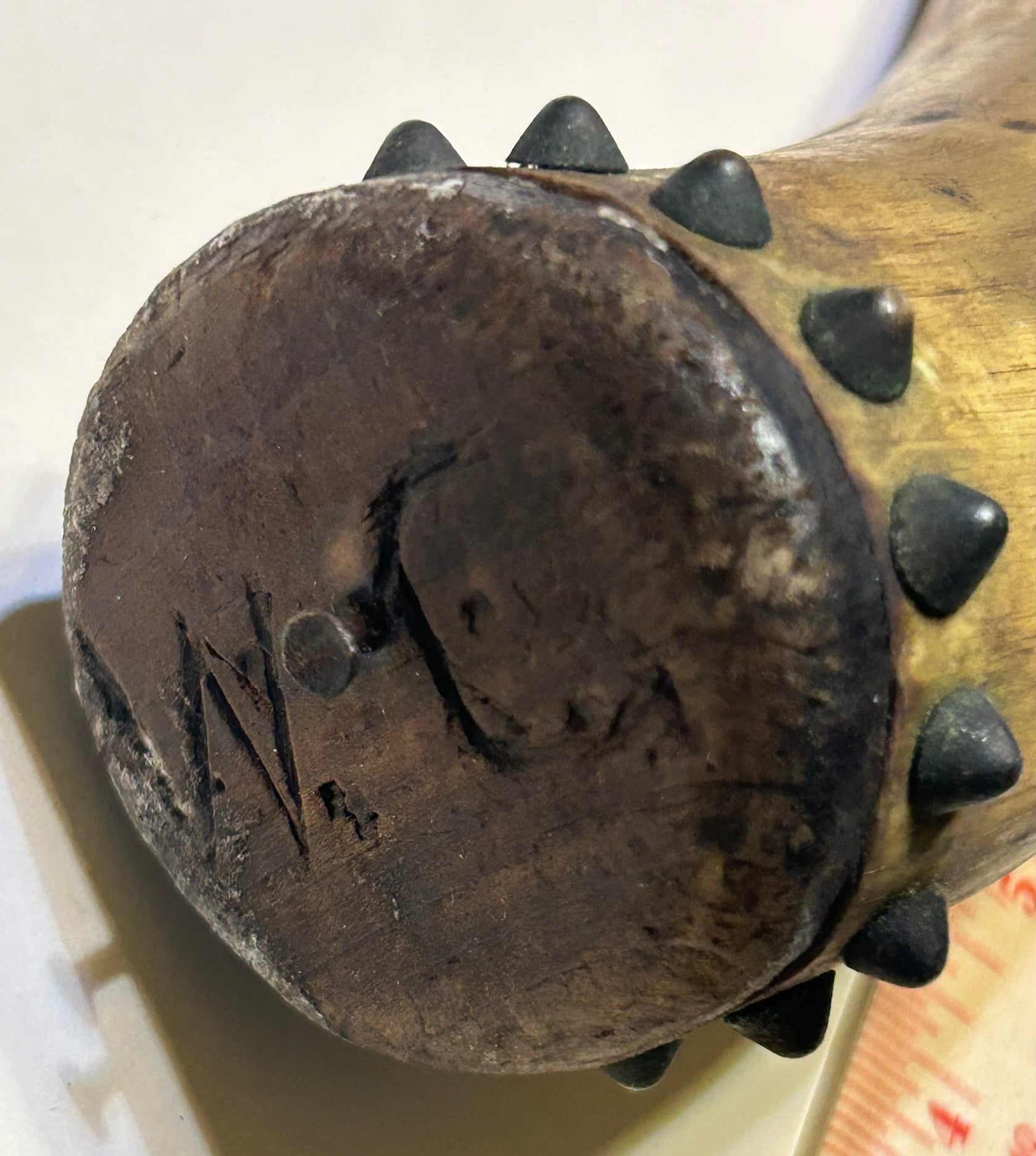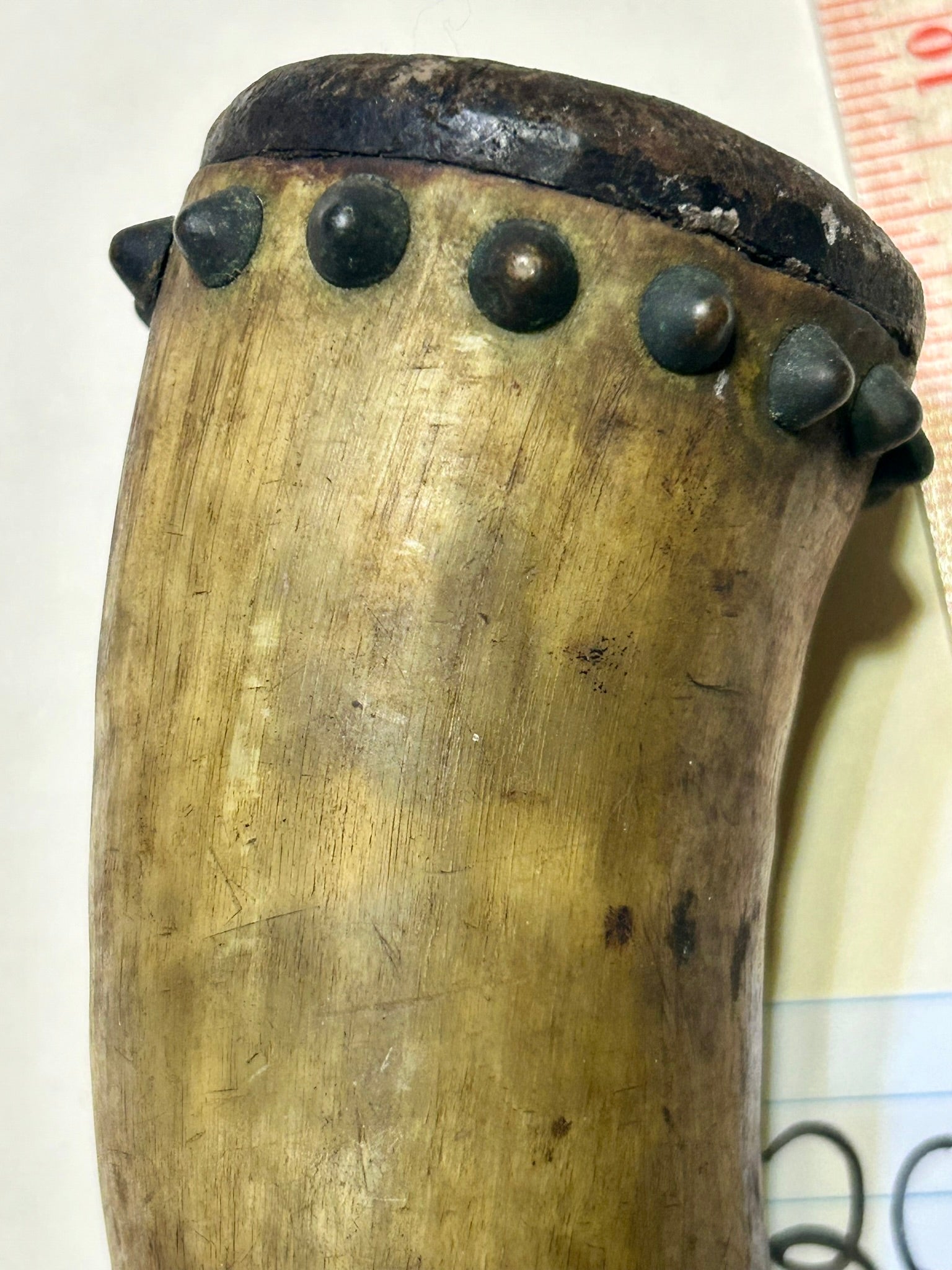 ANTIQUE POWDER HORN WITH TACKS AND INITIALS. CALL OR TEXT FOR MORE INFORMATION