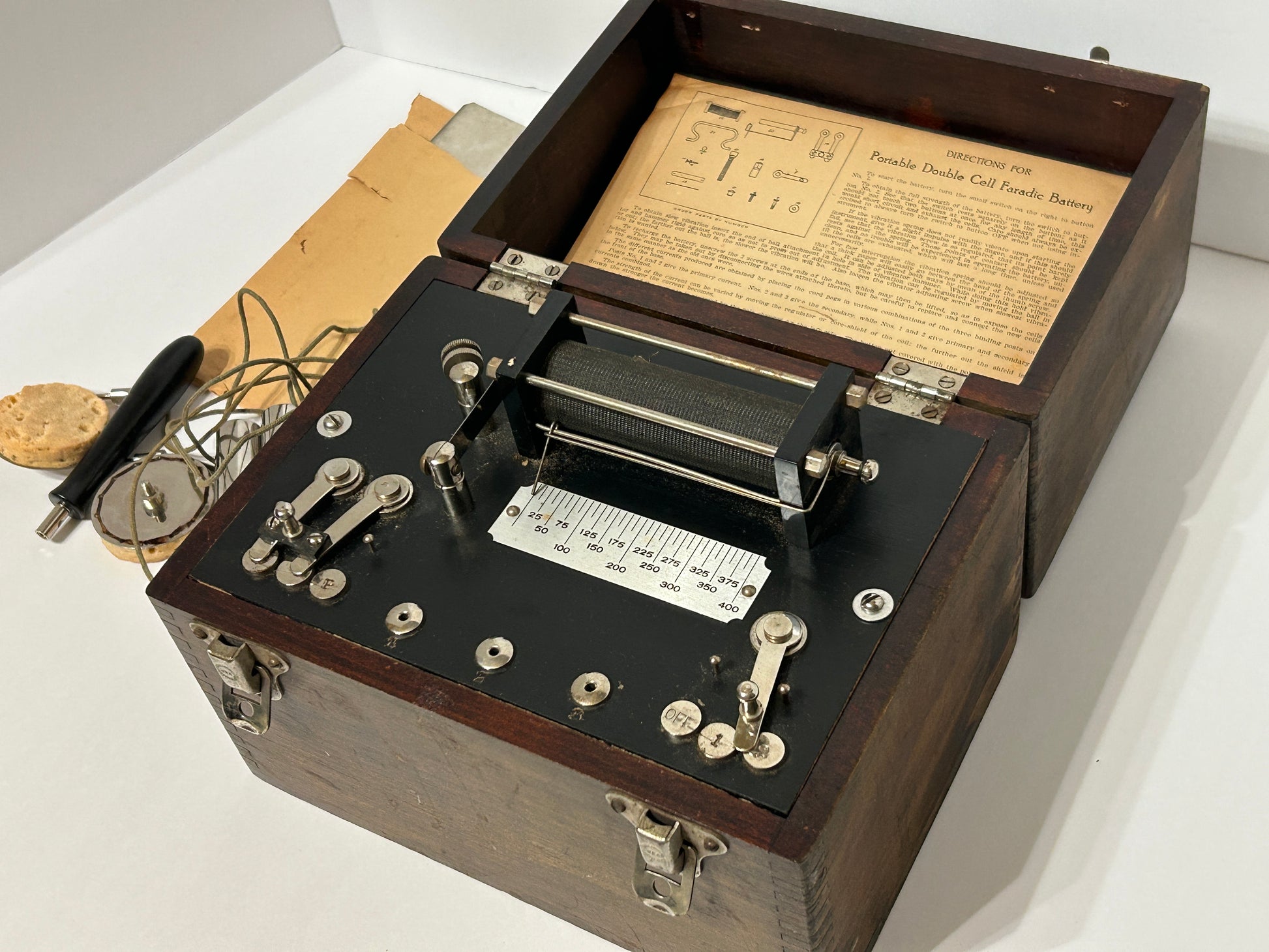 ANTIQUE PORTABLE DOUBLE CELL FARADIC BATTERY QUACK ELECTROPATHY MEDICAL DEVICE 8 1/2" TALL X 9" WIDE. SHIPPING IS EXTRA SO CALL OR TEXT TO FIND OUT HOW MUCH SHIPPING WILL COST