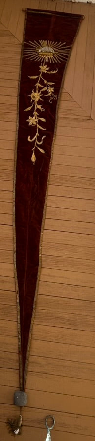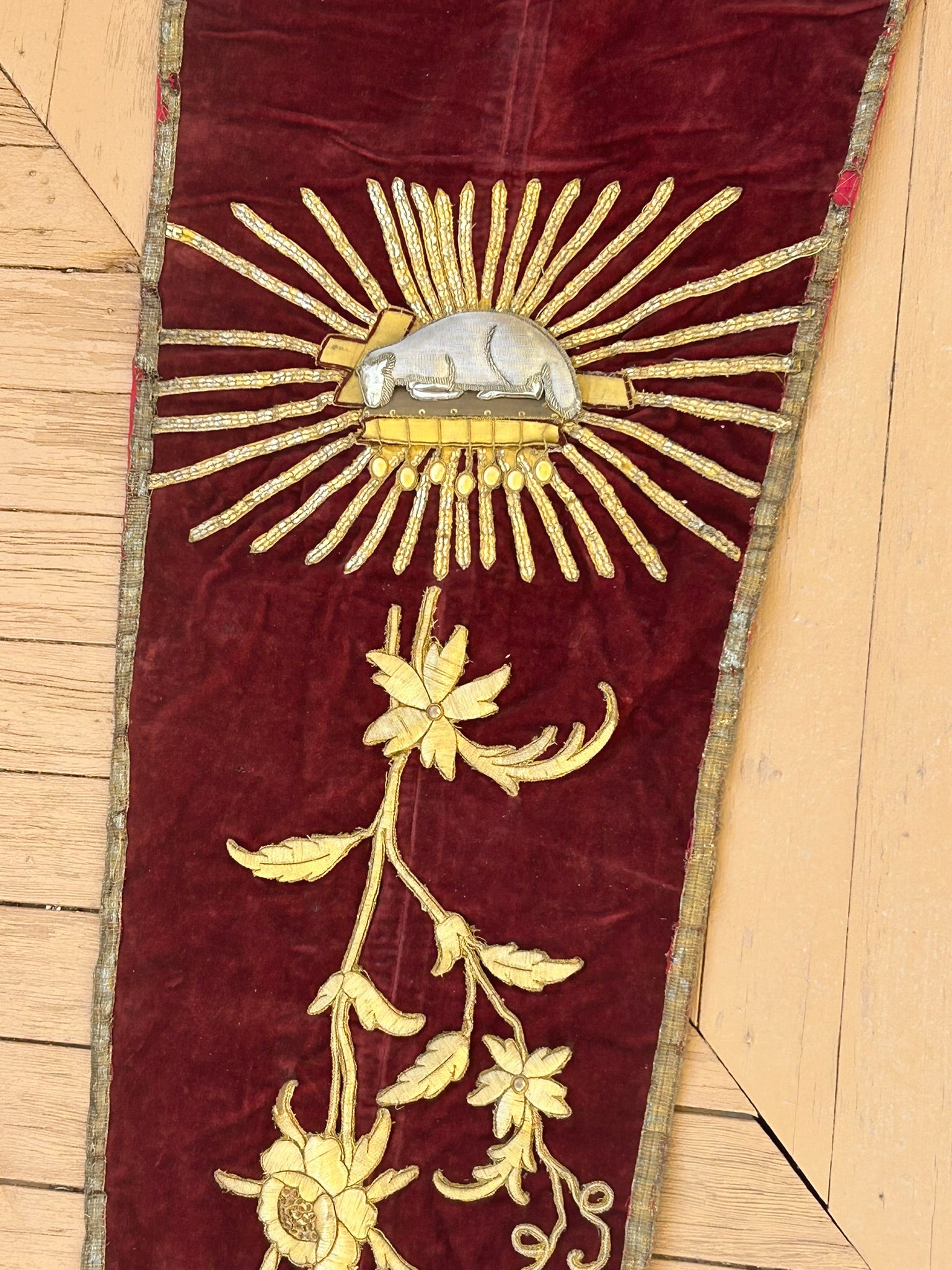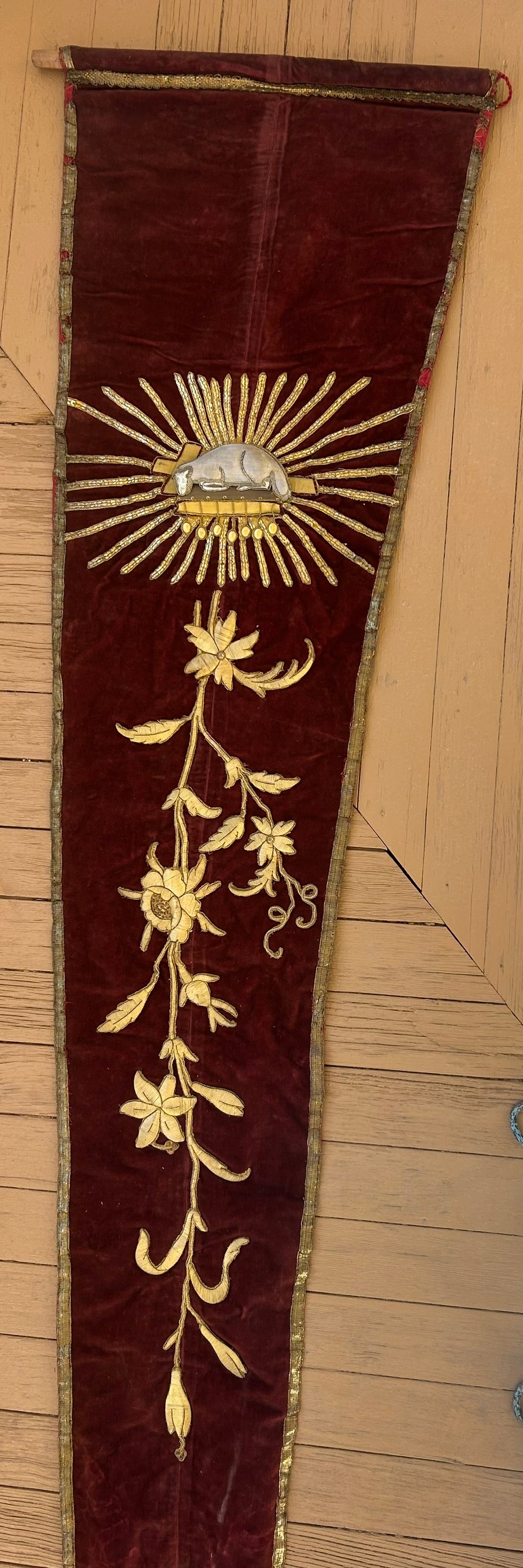 ANTIQUE FANCY RELIGIOUS BANNER WITH LAMB 126" LONG. CALL OR TEXT FOR MORE INFORMATION