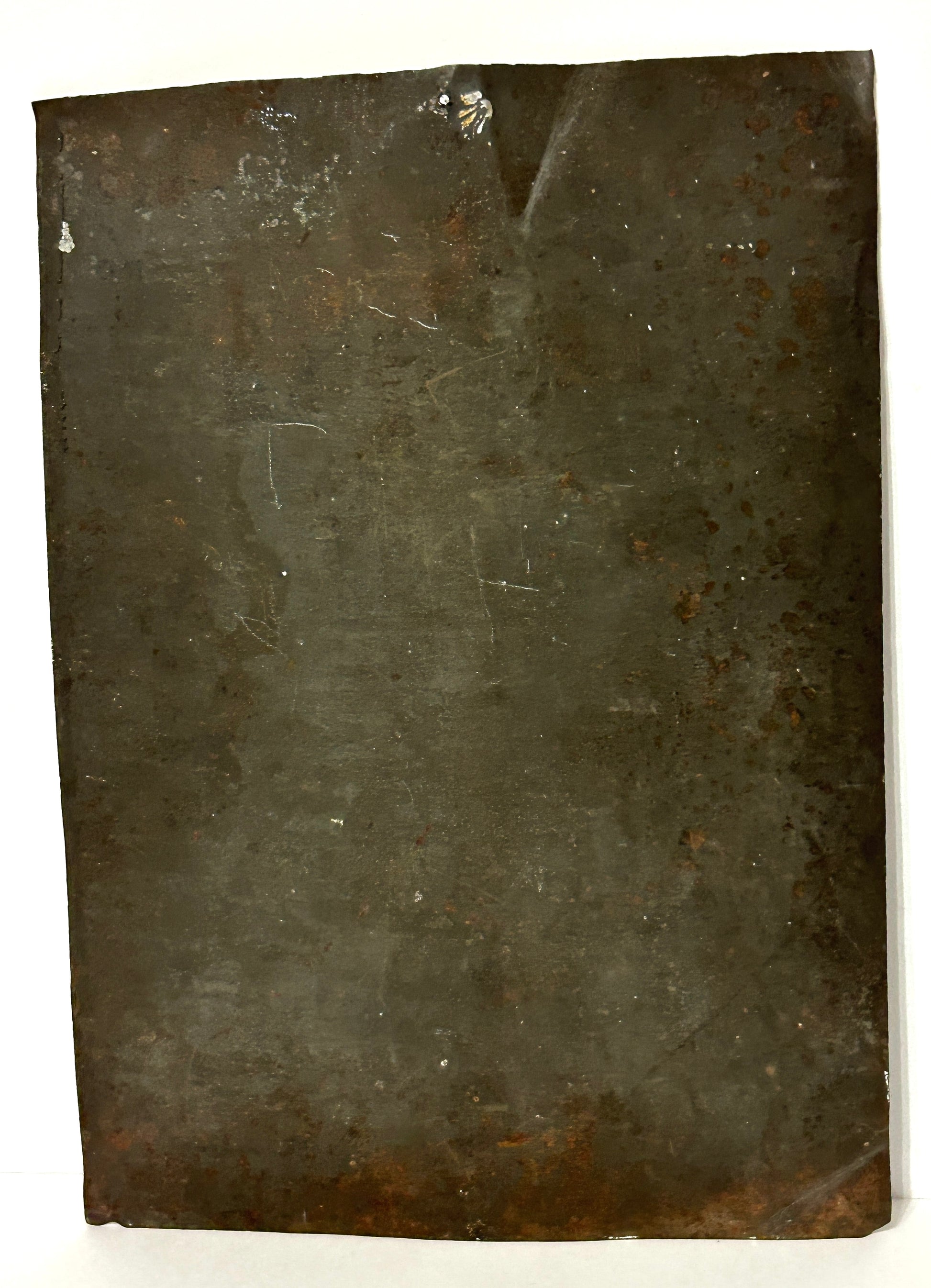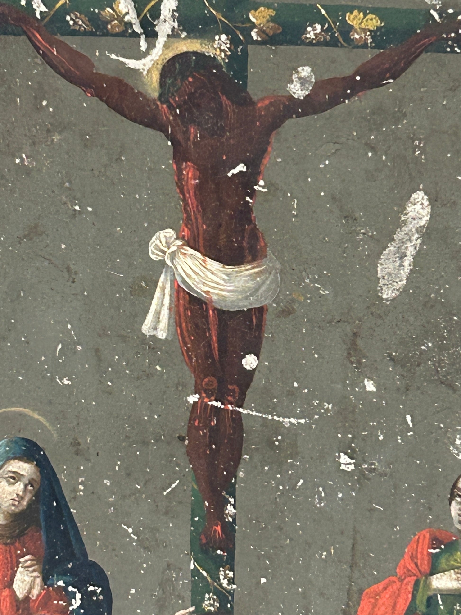 ANTIQUE RETABLO PAINTING ON TIN OF DEATH OF CHRIST 14" TALL X 10". SHIPPING IS EXTRA CHARGE CALL OR TEXT TO FIND OUT HOW MUCH SHIPPING WILL COST