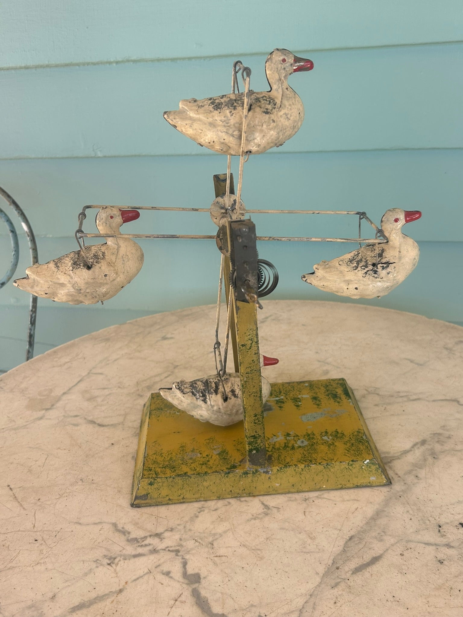 ANTIQUE WIND UP REVOLVING DUCKS EARLY 1900'S TIN TOY 15" TALL. CALL OR TEXT FOR MORE INFORMATION