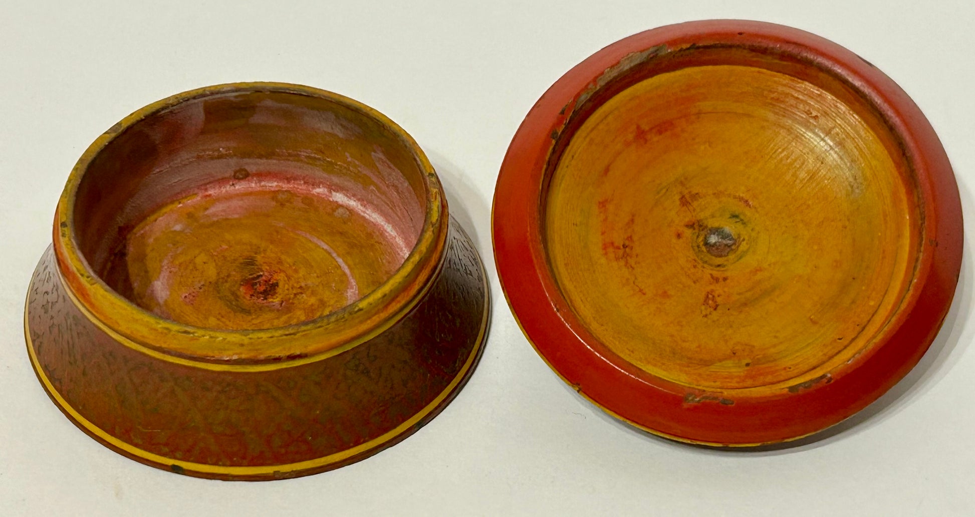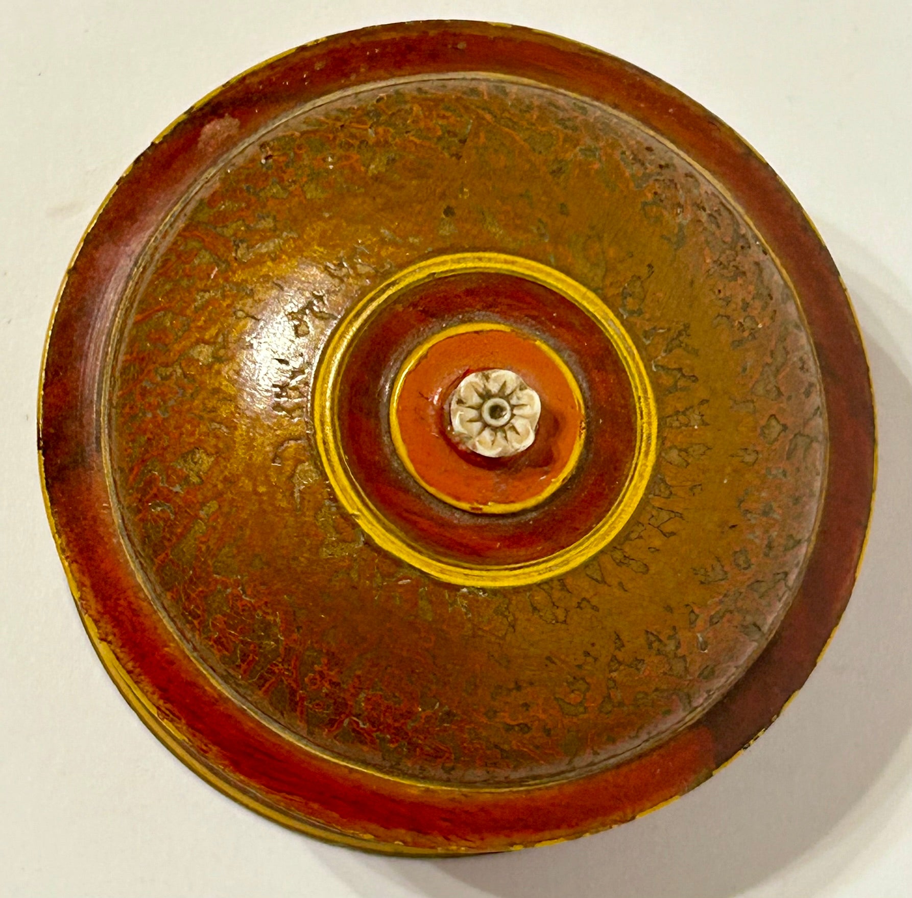 ANTIQUE ROUND WOOD DECORATED COVERED BOX WITH IVORY KNOB 3" DIA. CALL OR TEXT FOR MORE INFORMATION