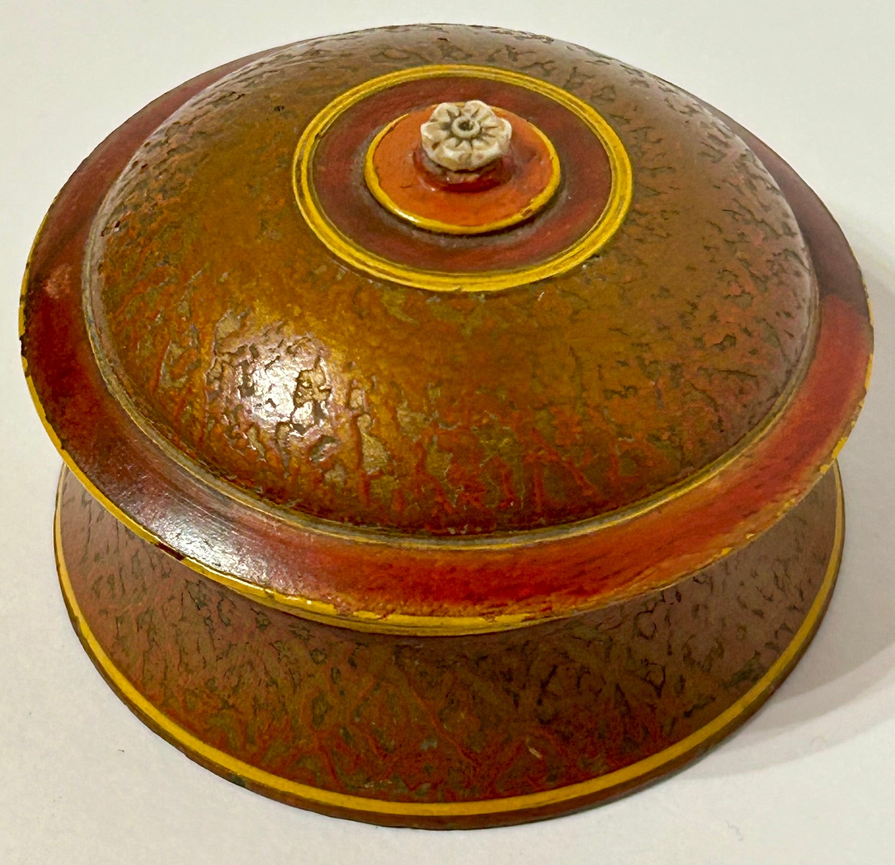 ANTIQUE ROUND DECORATED WOOD COVERED BOX WITH IVORY KNOB