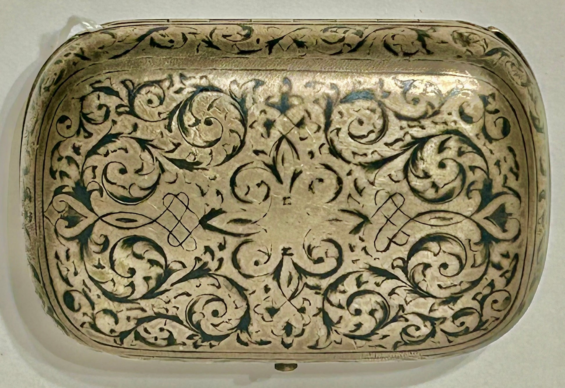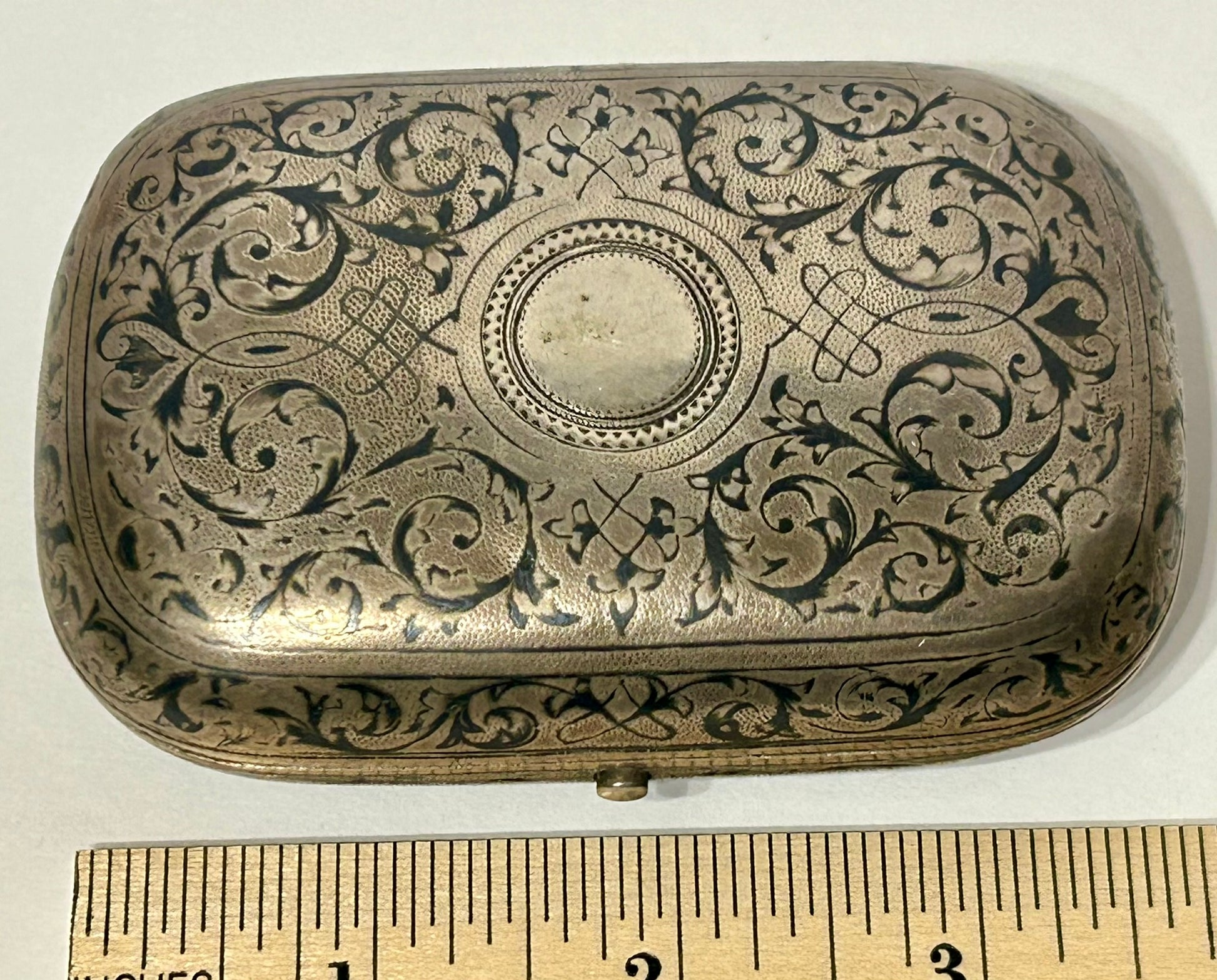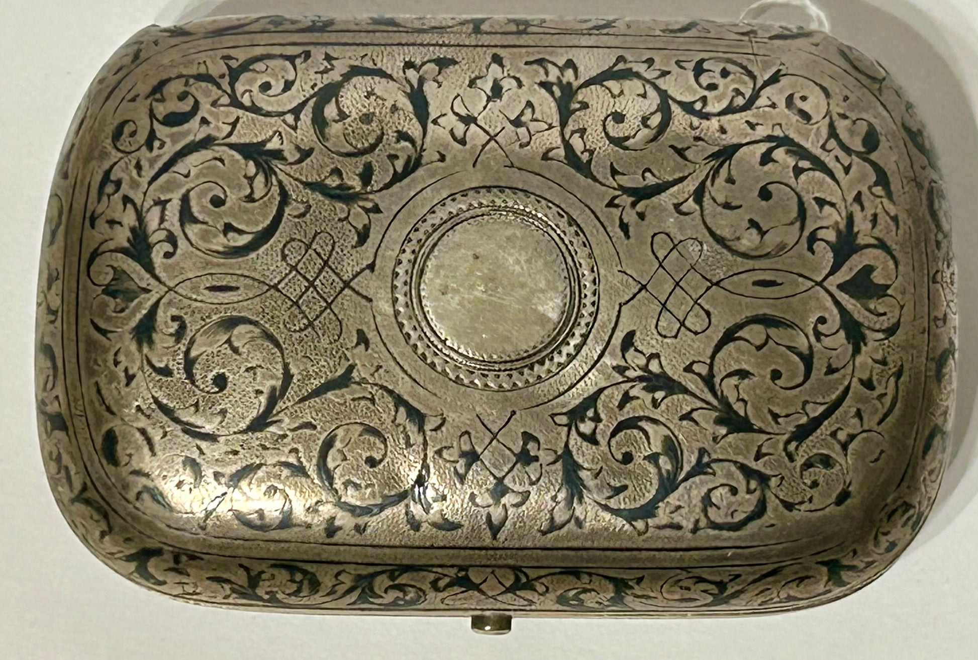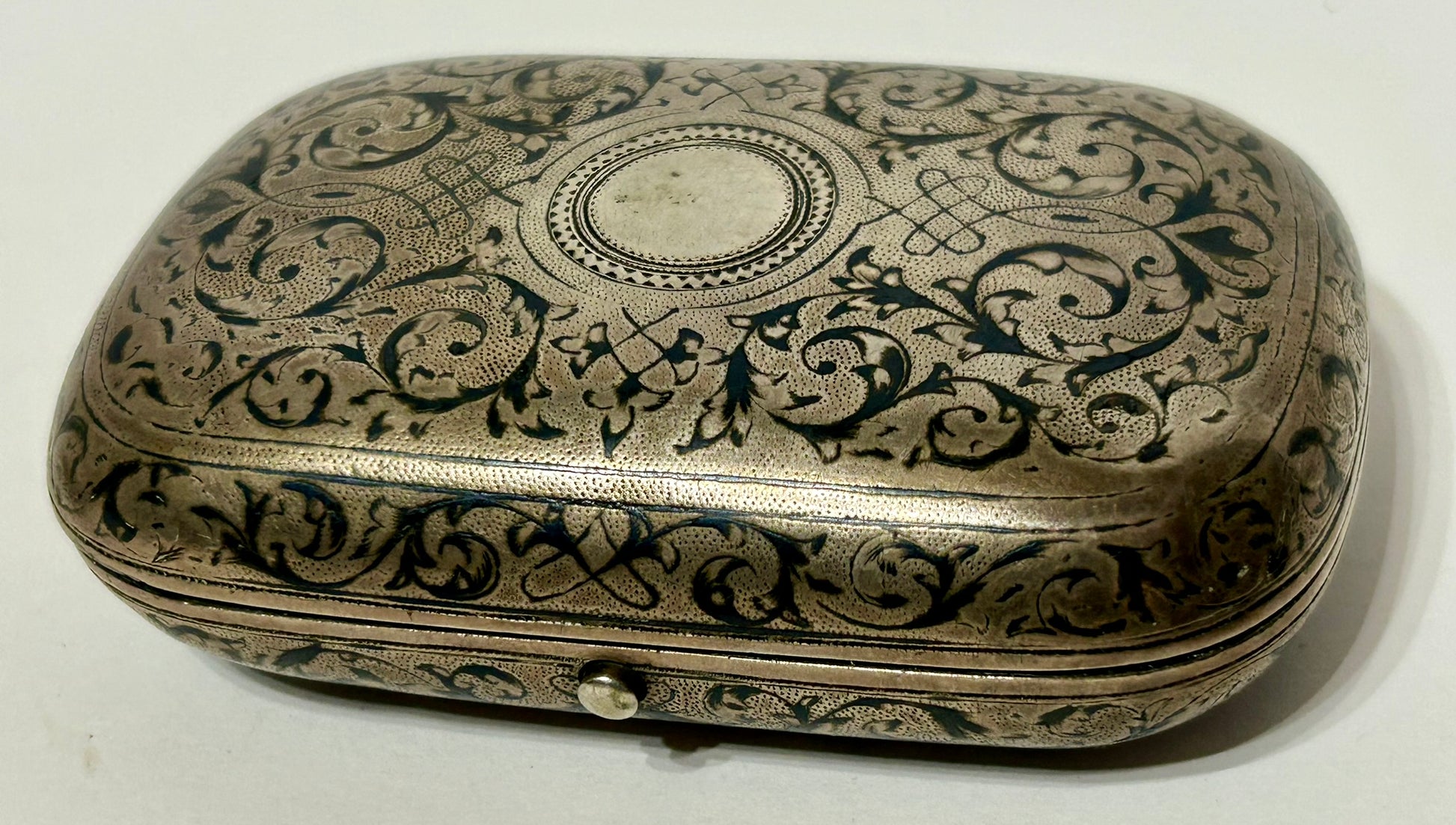 ANTIQUE RUSSIAN SILVER DECORATED CIGARETTE CASE 4" LONG. CALL OR TEXT FOR MORE INFORMATION