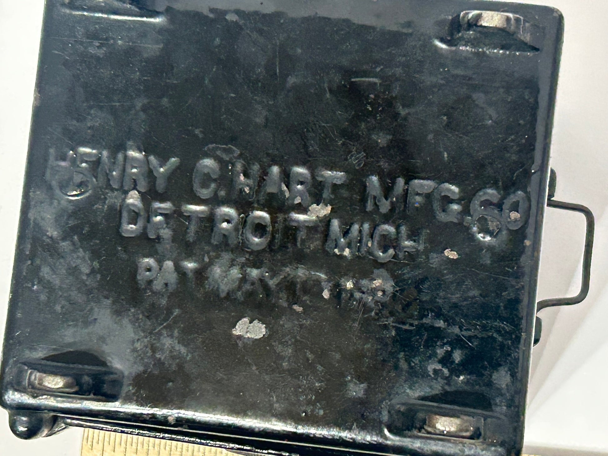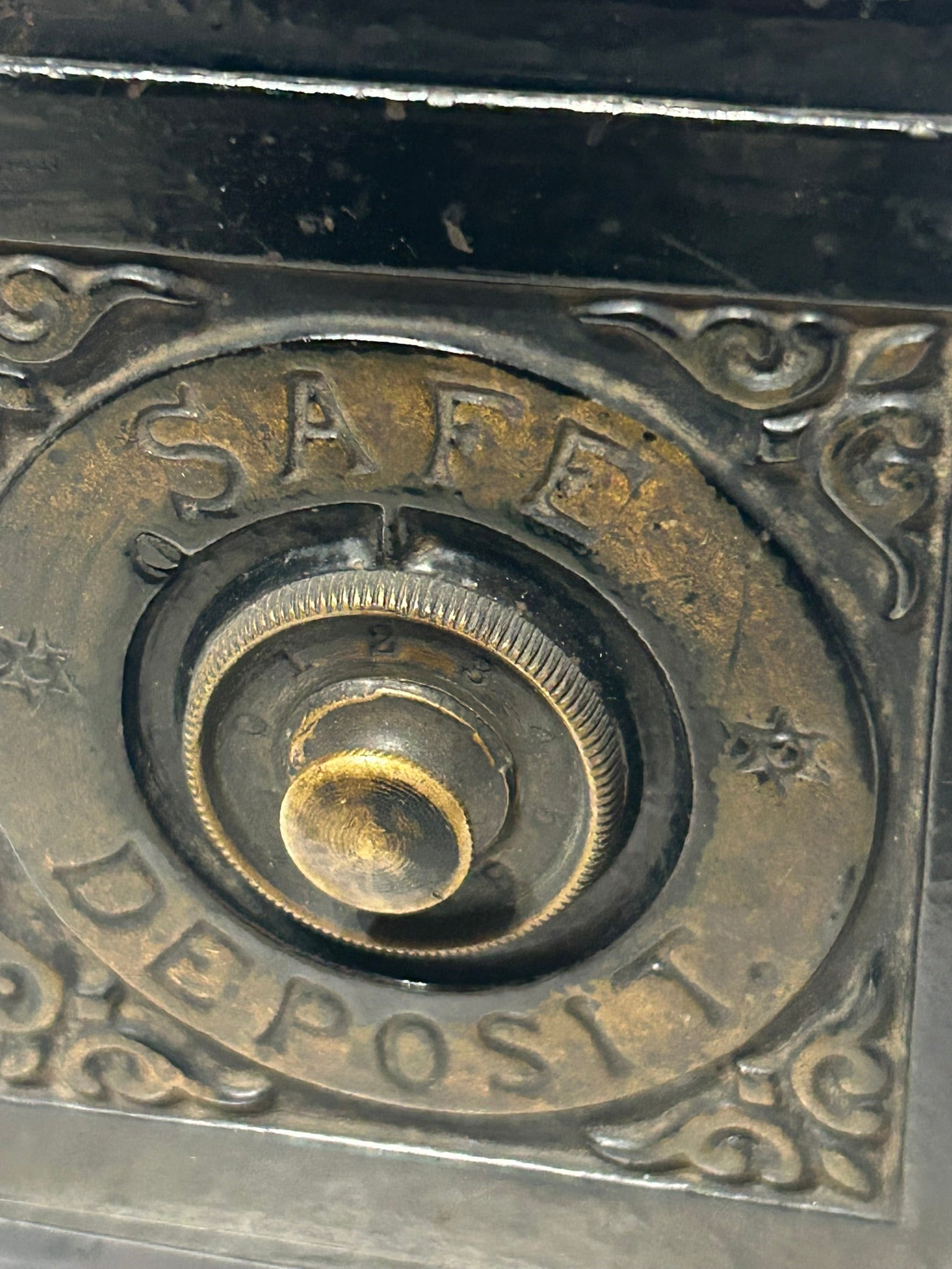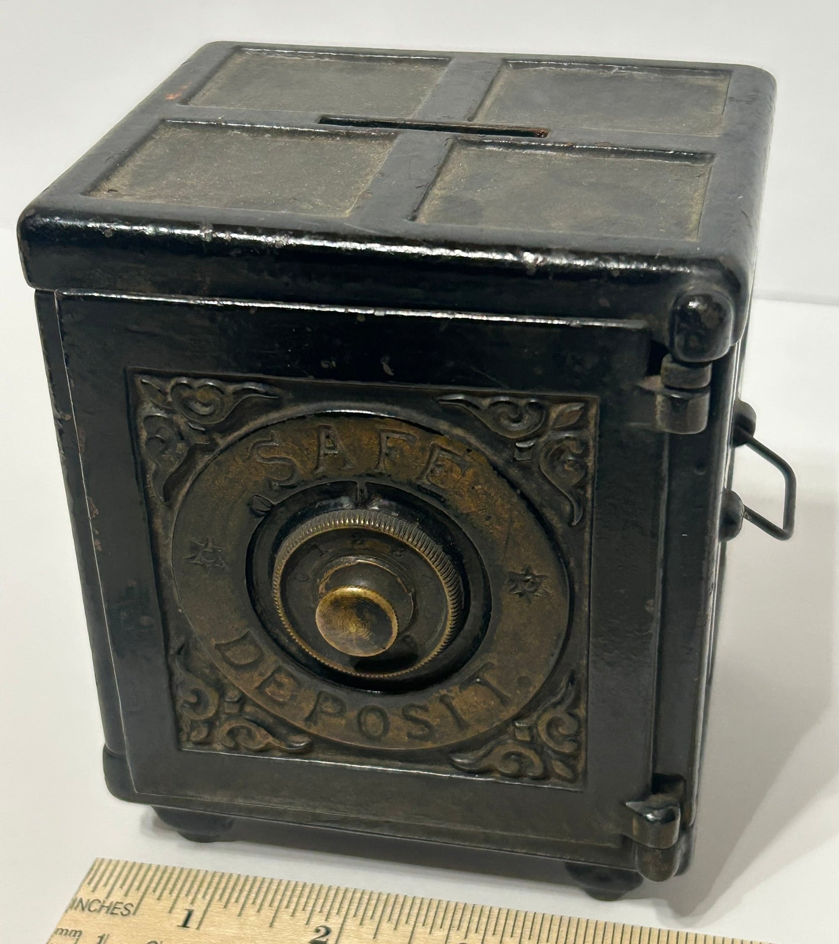 ANTIQUE SAFE DEPOSIT IRON COMBINATION BANK 5" TALL X 4" X 4 1/2". CALL OR TEXT FOR MORE INFORMATION