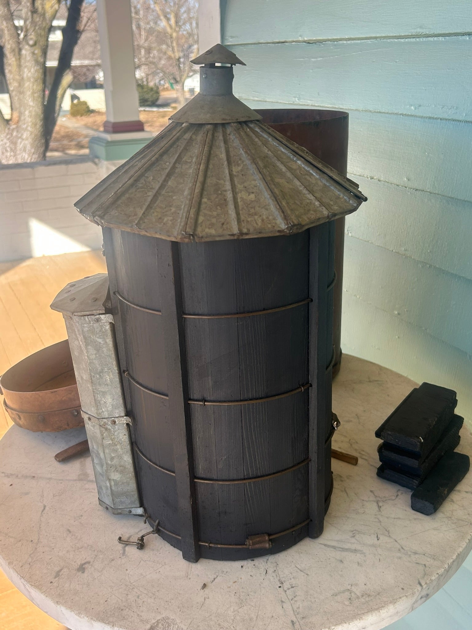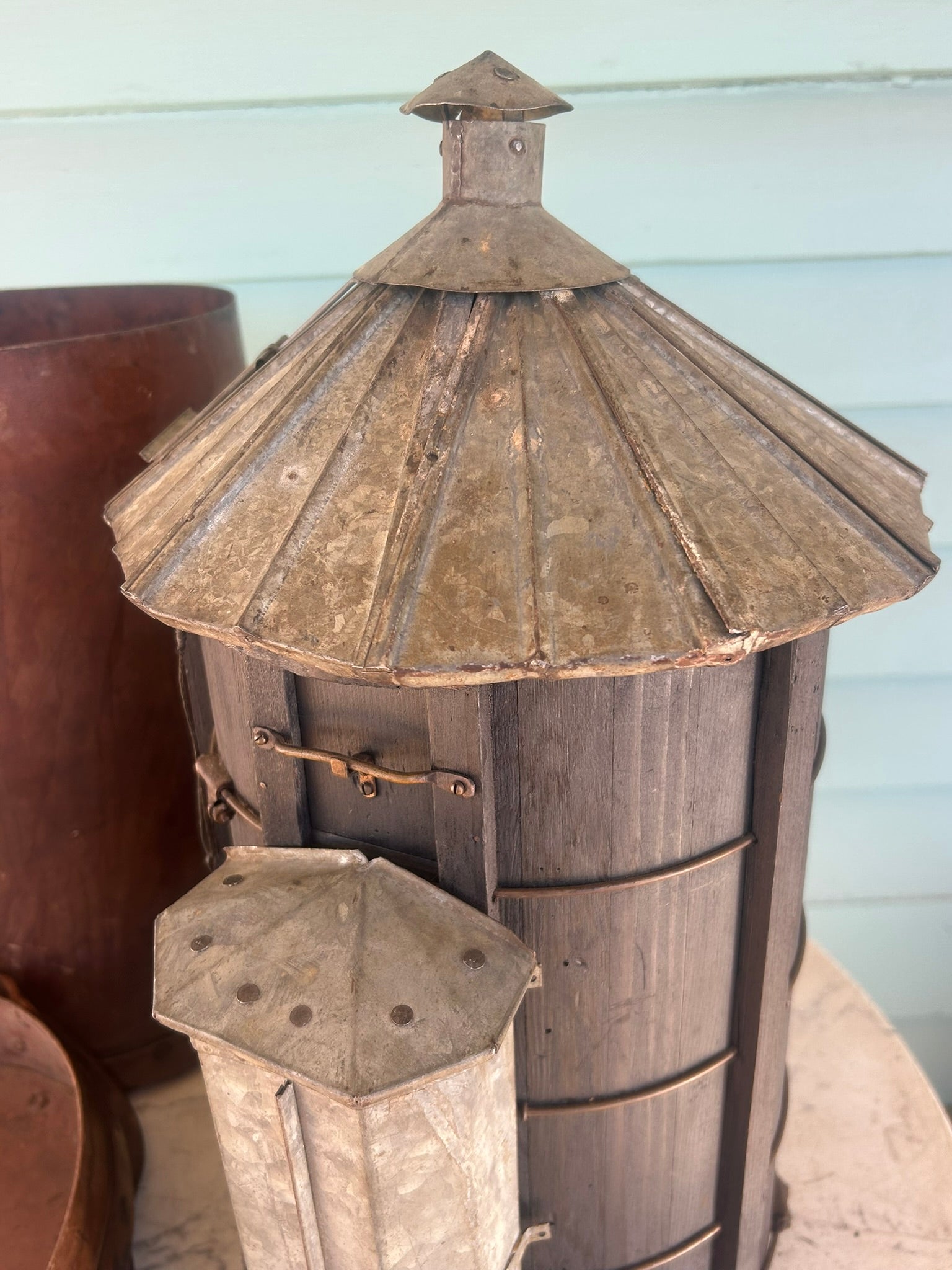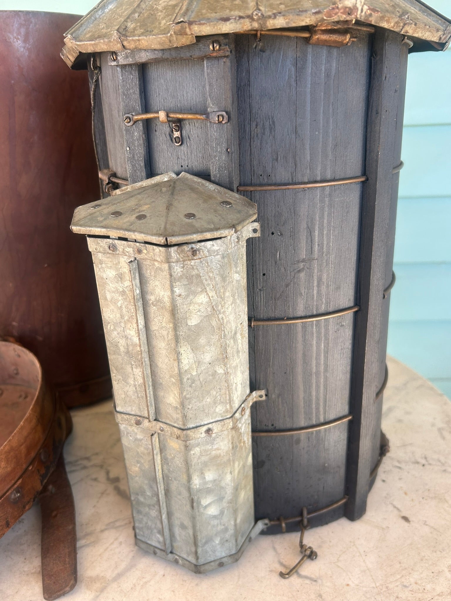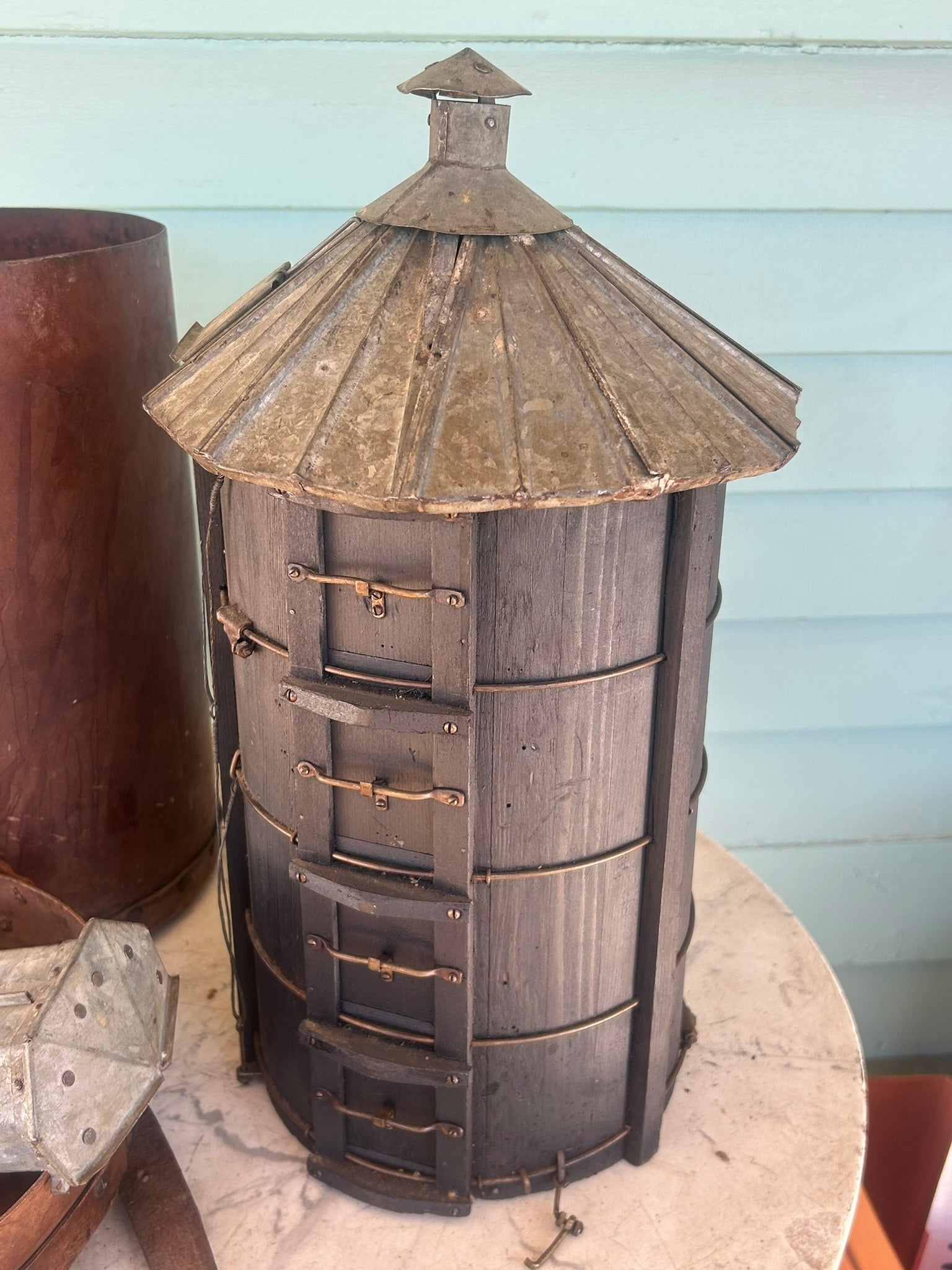 ANTIQUE SALESMAN SAMPLE FARM SILO WITH ORIGINAL LEATHER CASE. CALL OR TEXT FOR MORE INFORMATION