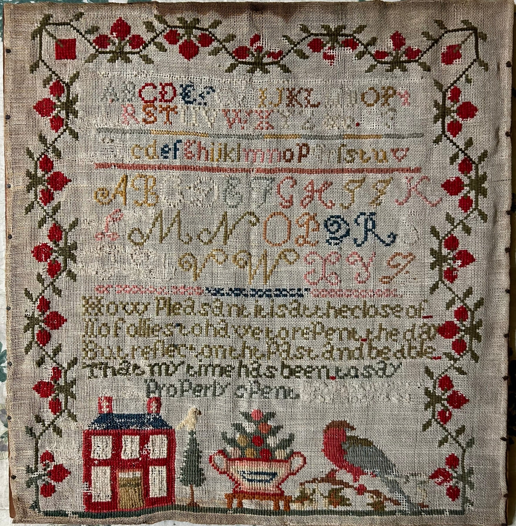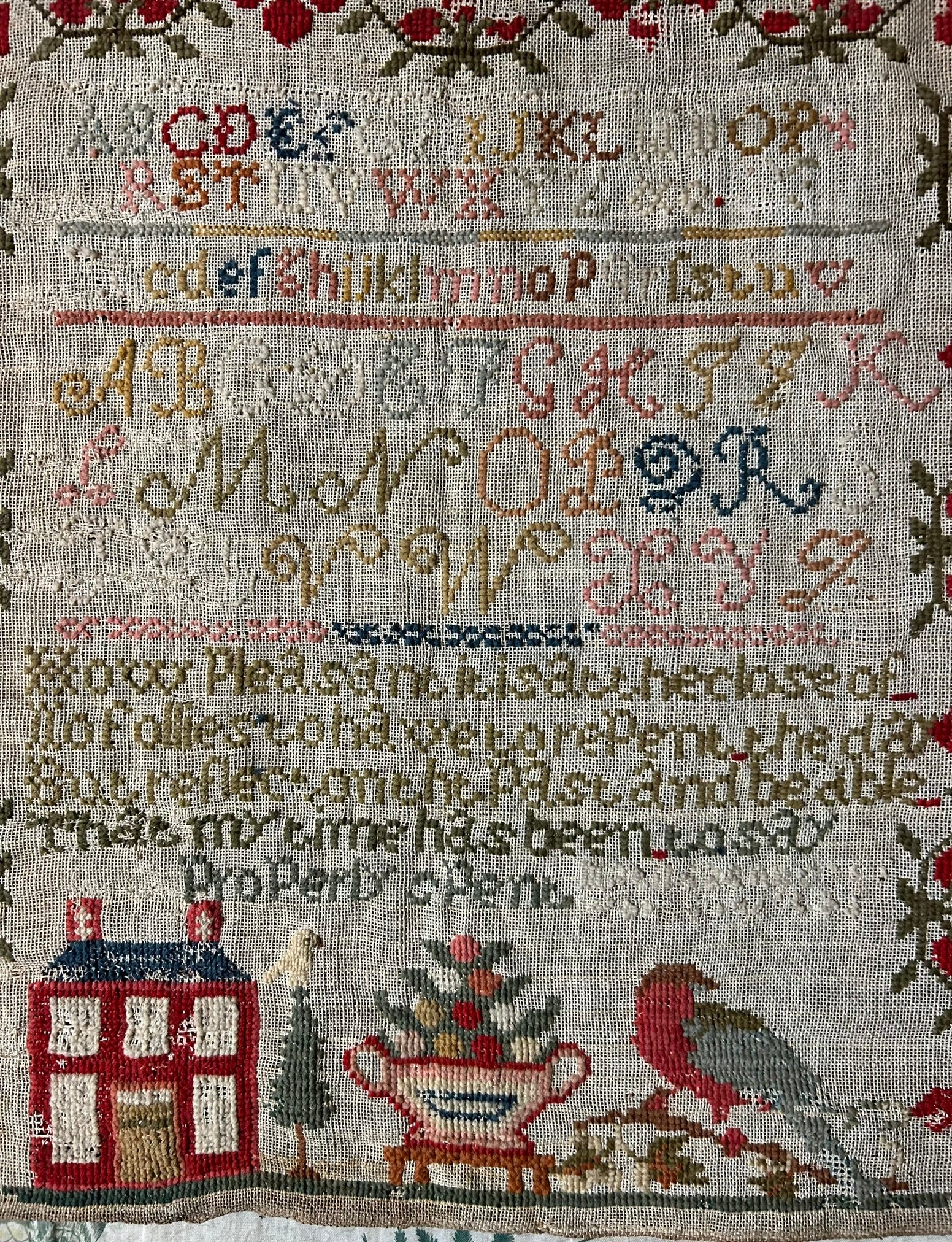 ANTIQUE SAMPLER WITH BIRDS, FLOWERS AND HOUSE