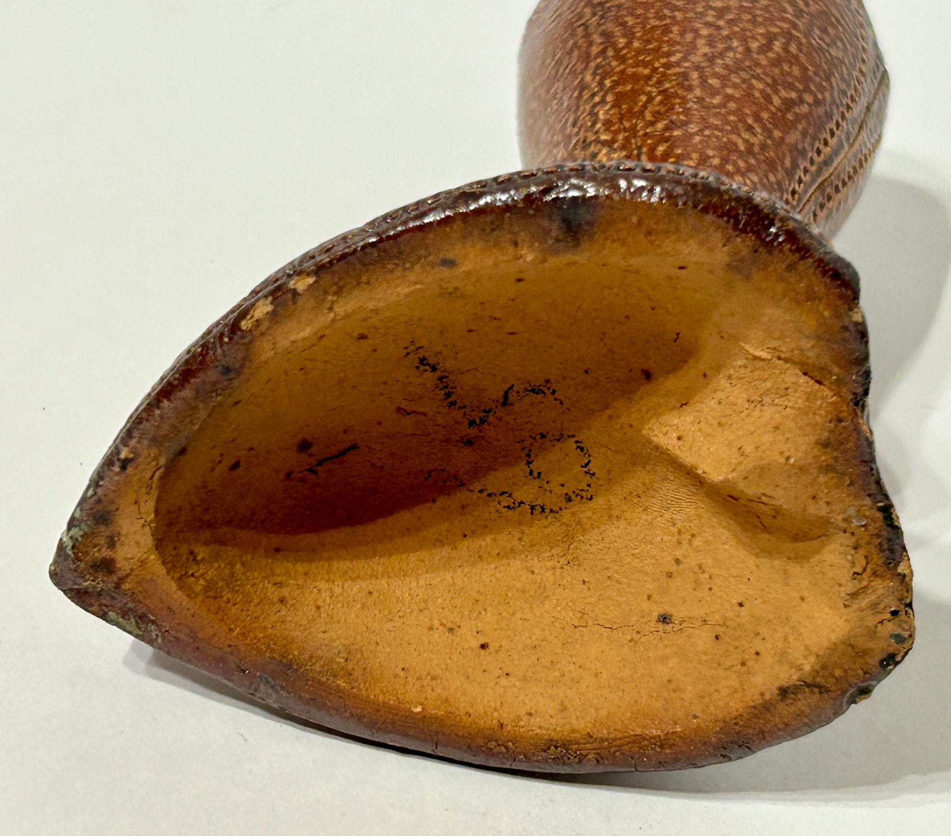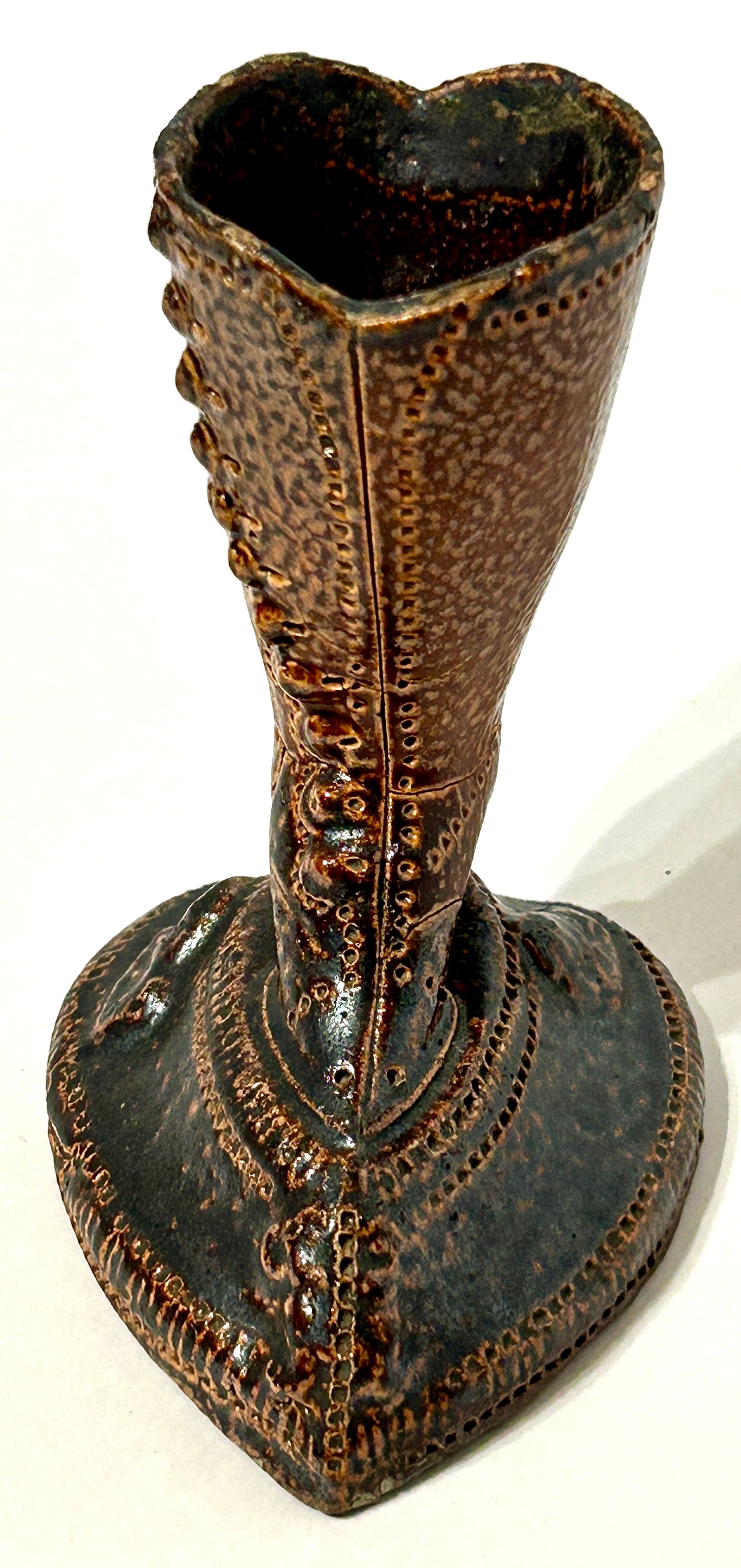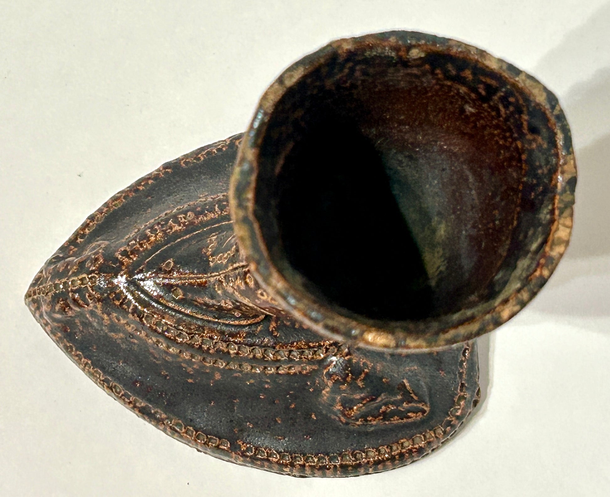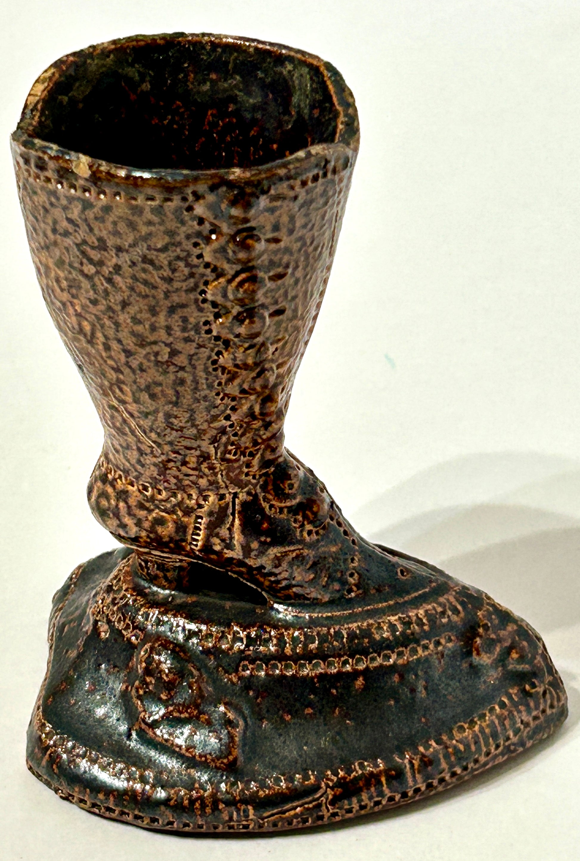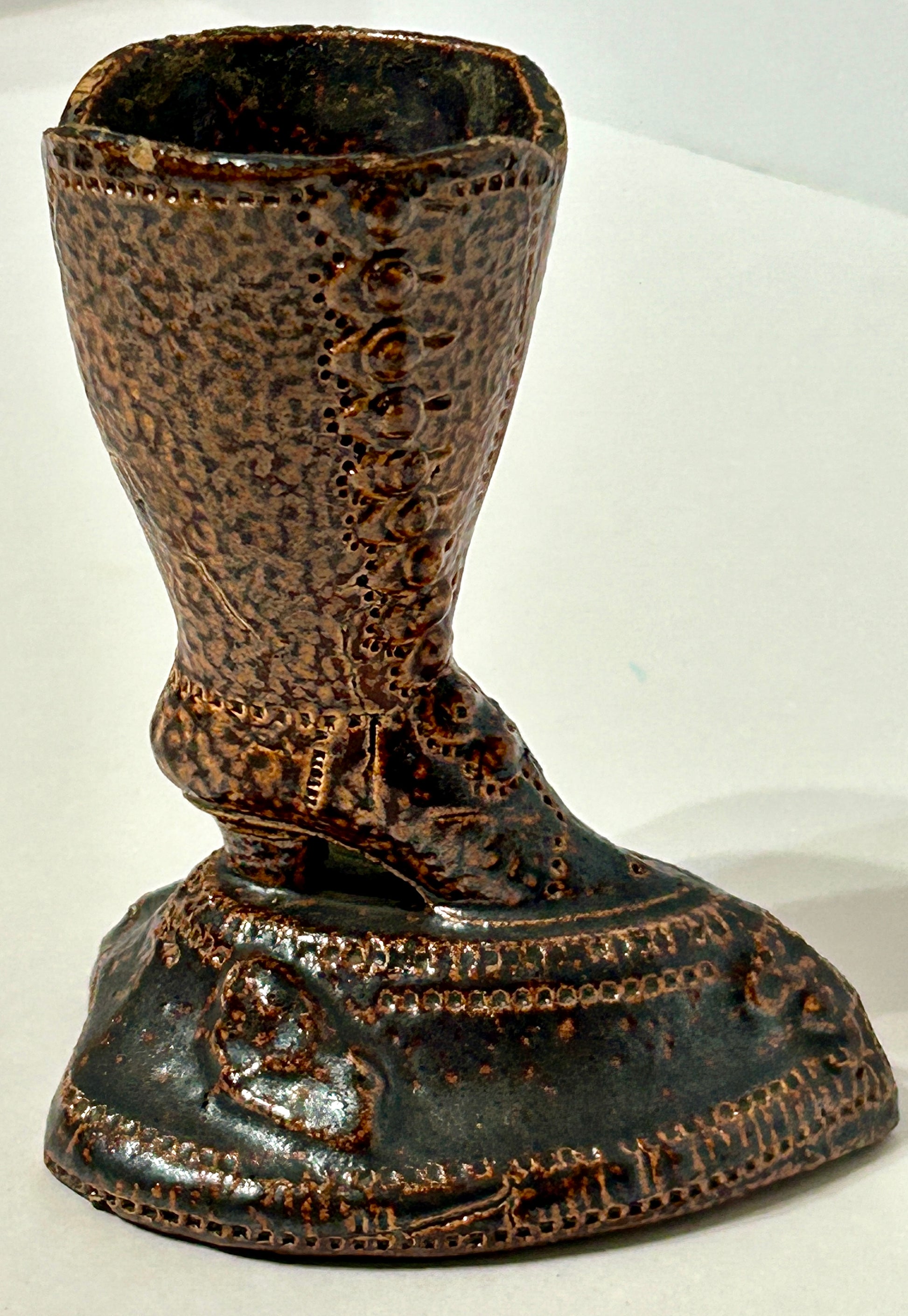 SEWER TILE ANTIQUE HIGHTOP SHOE MATCH HOLDER OR TOOTHPICK HOLDER - TINY MINUTE CHIP ON TOP EDGE 5" TALL X 4" WIDE. SHIPPING IS NOT INCLUDED IN PRICE SO CALL OR TEXT FOR COST OF SHIPPING TO YOUR ADDRESS