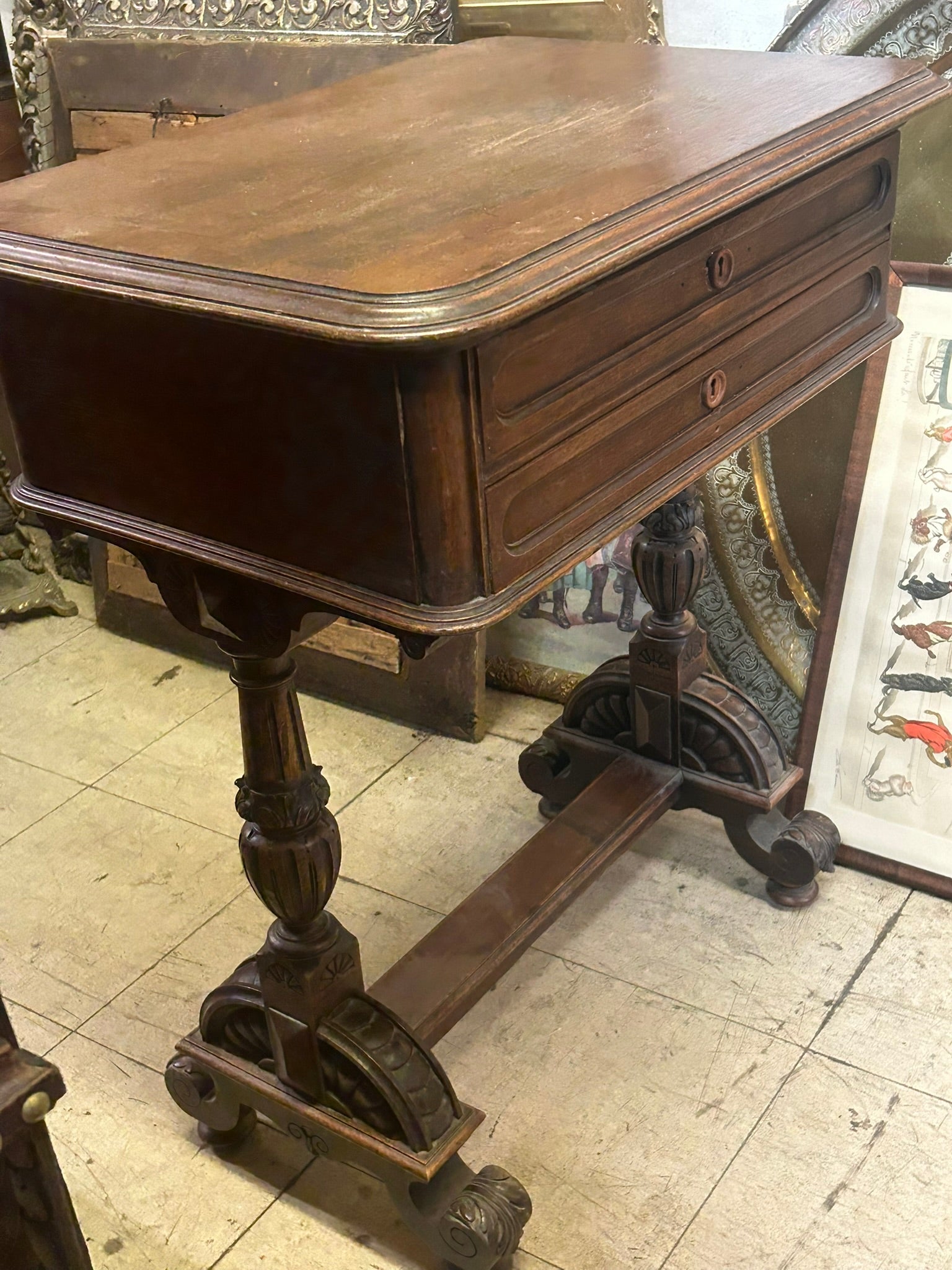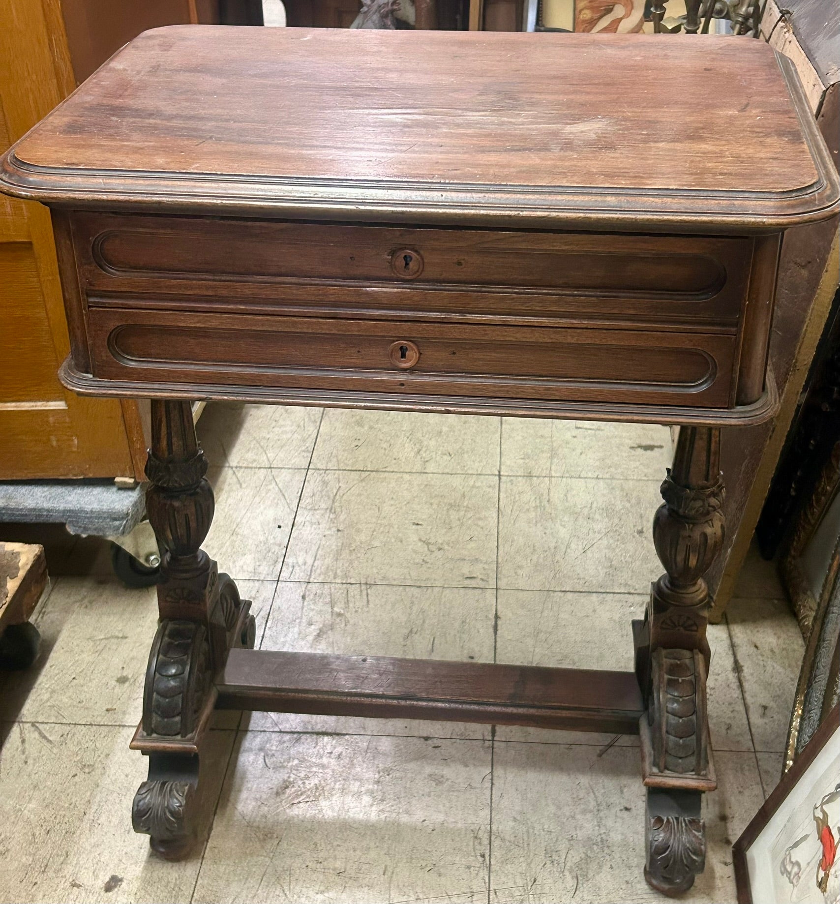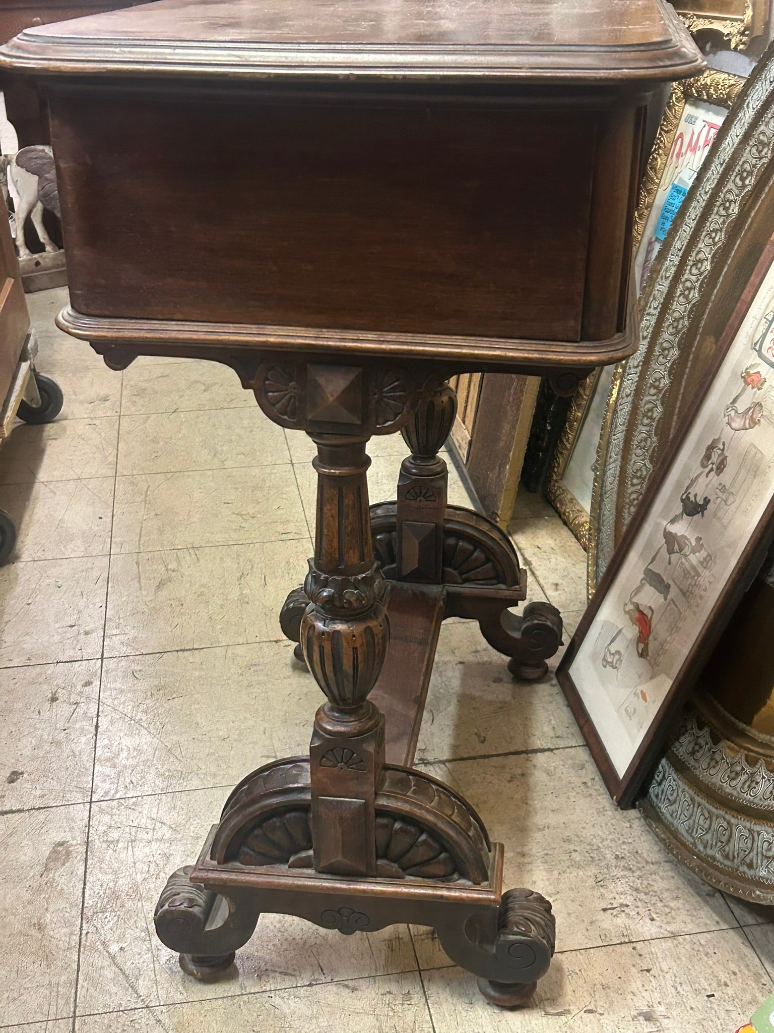 ANTIQUE SEWING STAND WITH TWO DRAWERS AND FANCY BASE FROM 1800'S. CALL OR TEXT FOR MORE INFORMATION