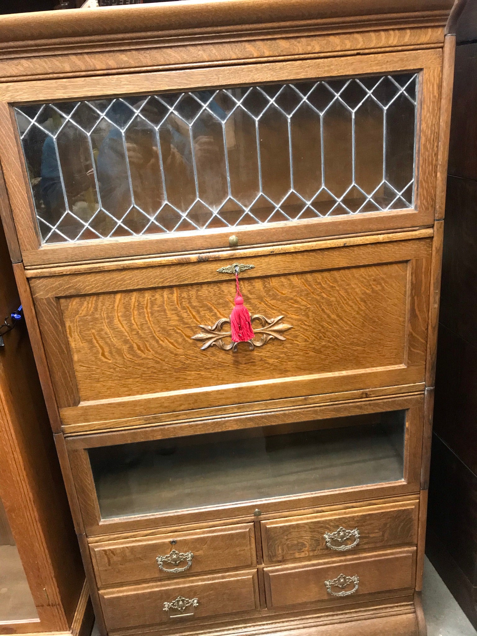 ANTIQUE OAK BARRISTER BOOKCASE WITH DESK SECTION, FOUR DRAWER SECTION, AND LEADED GLASS TOP. CALL, TEXT, OR E-MAIL FOR MORE INFORMATION