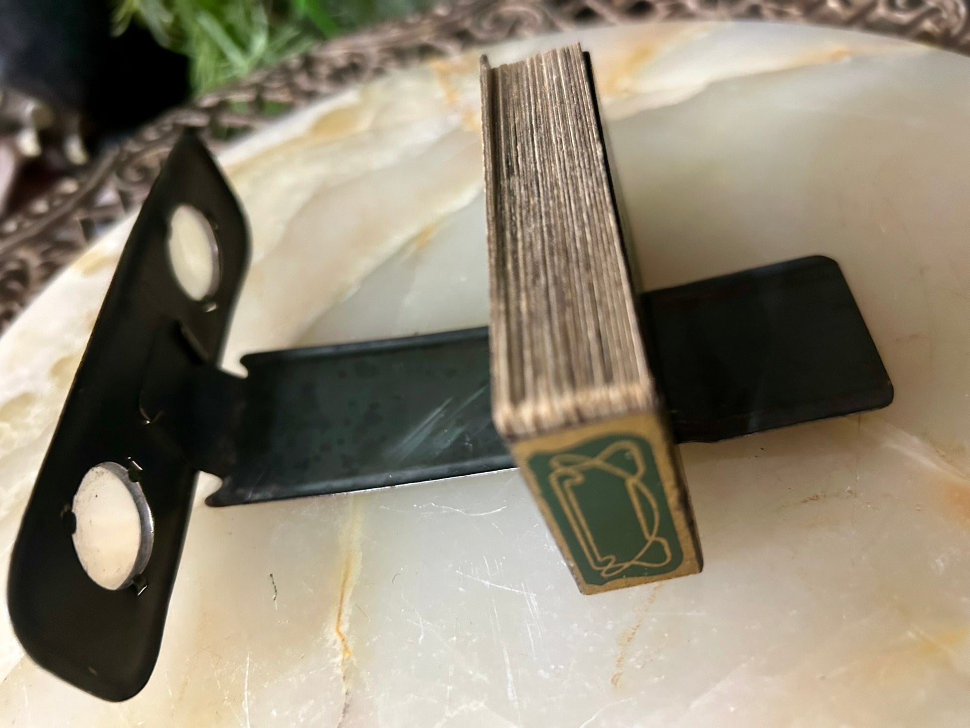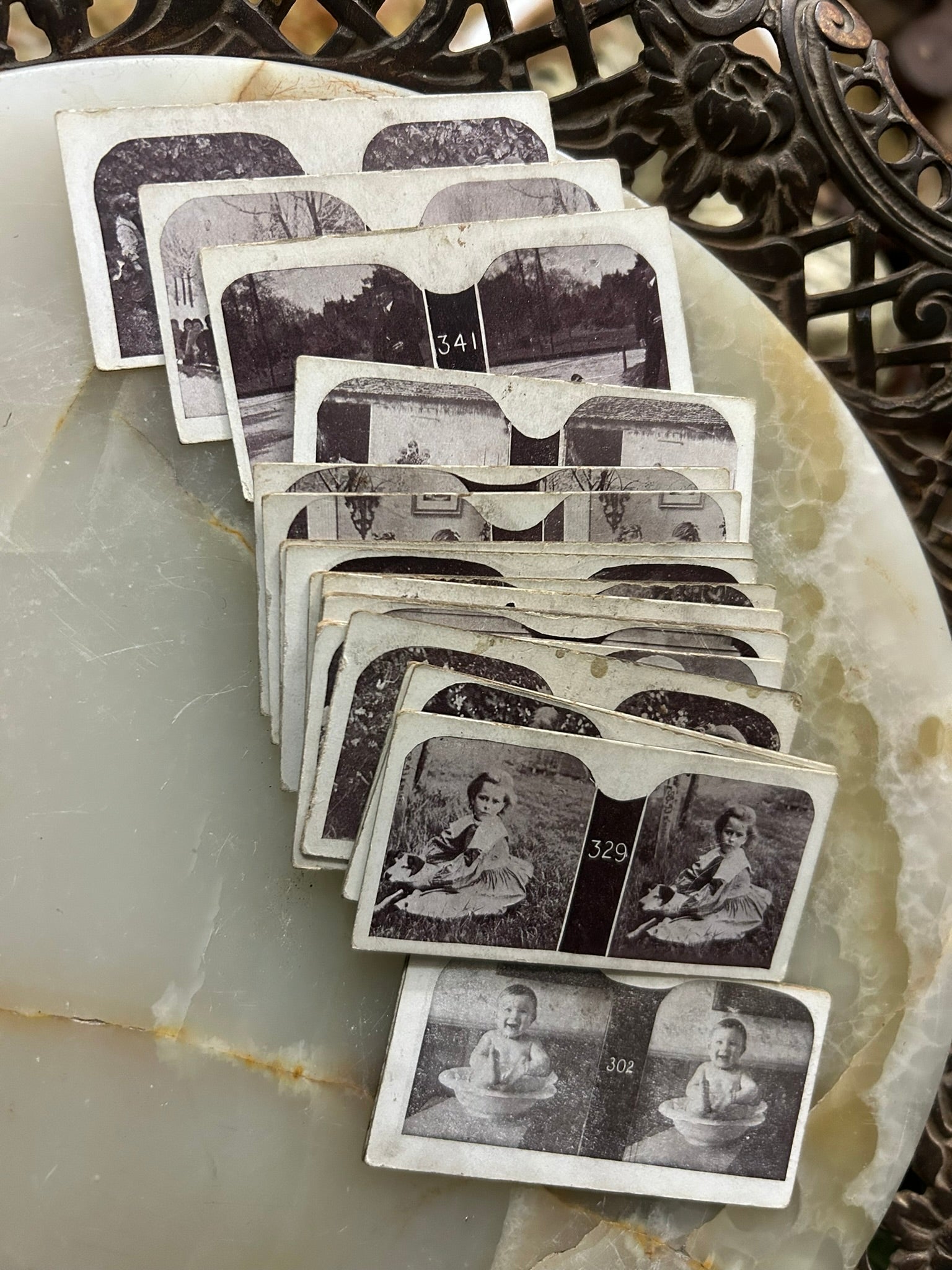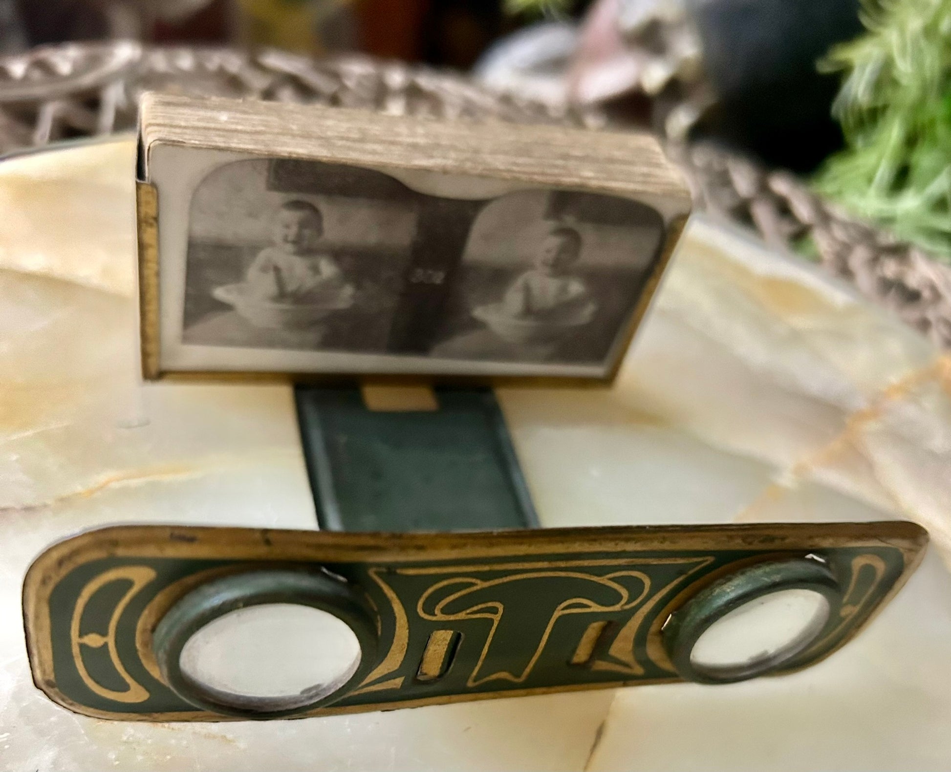 ANTIQUE SMALL CHILDS TIN STEREO VIEWER WITH DOUBLE SIDED VIEW CARDS, 4 1/2" LONG. CALL OR TEXT FOR MORE INFORMATION