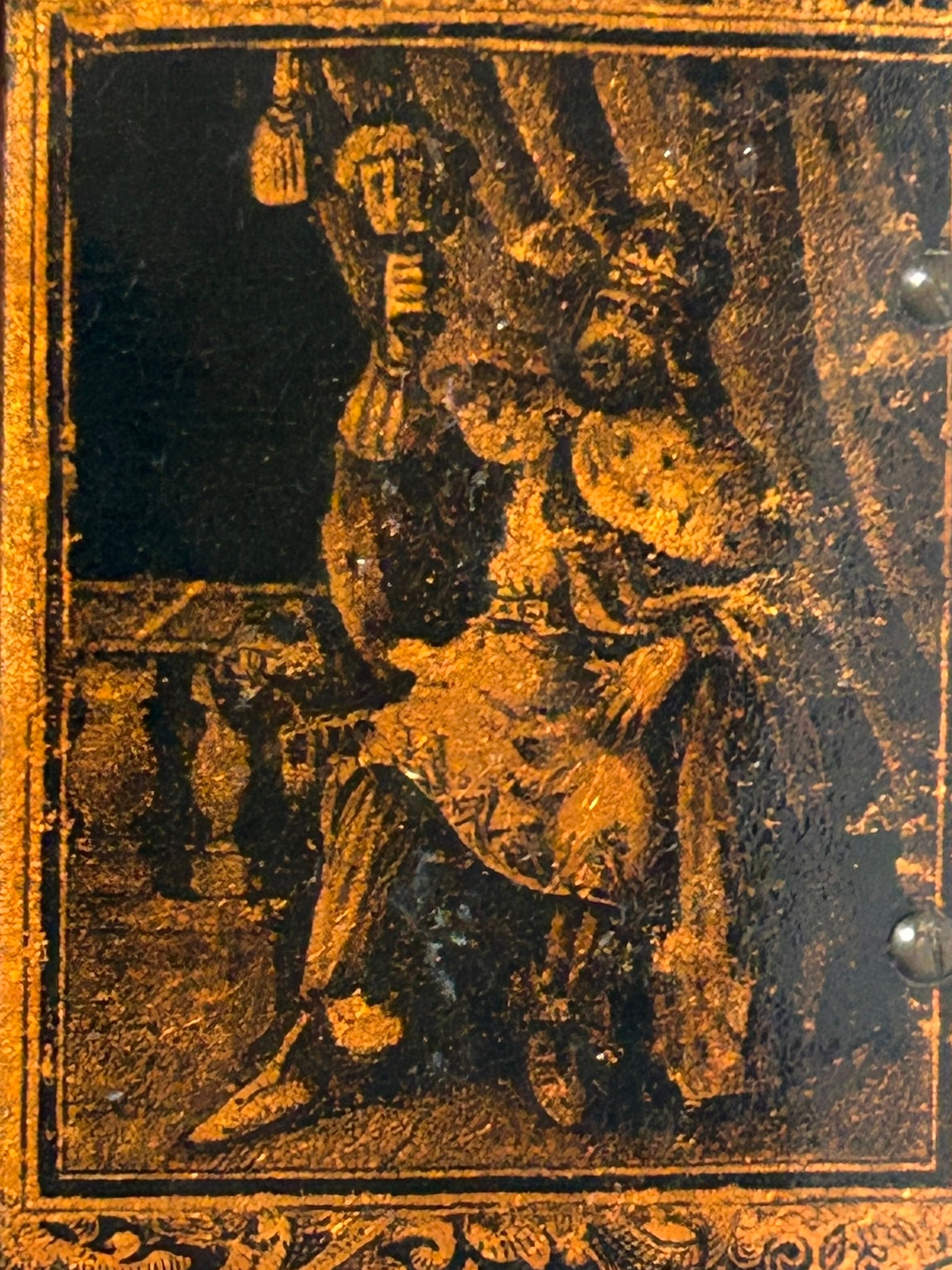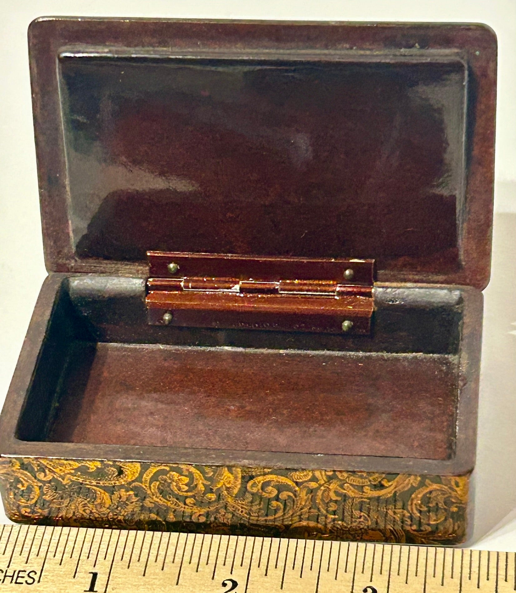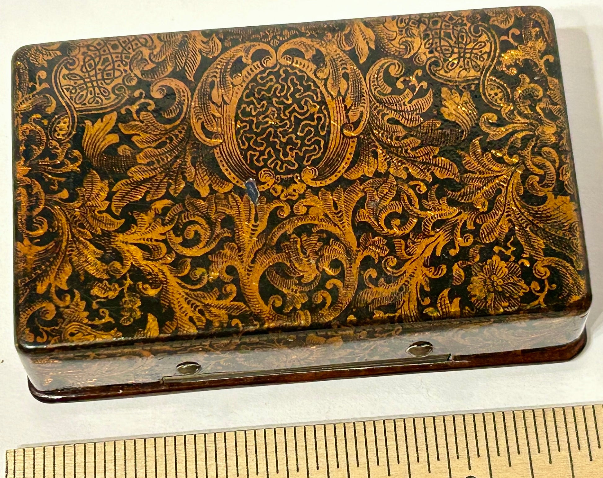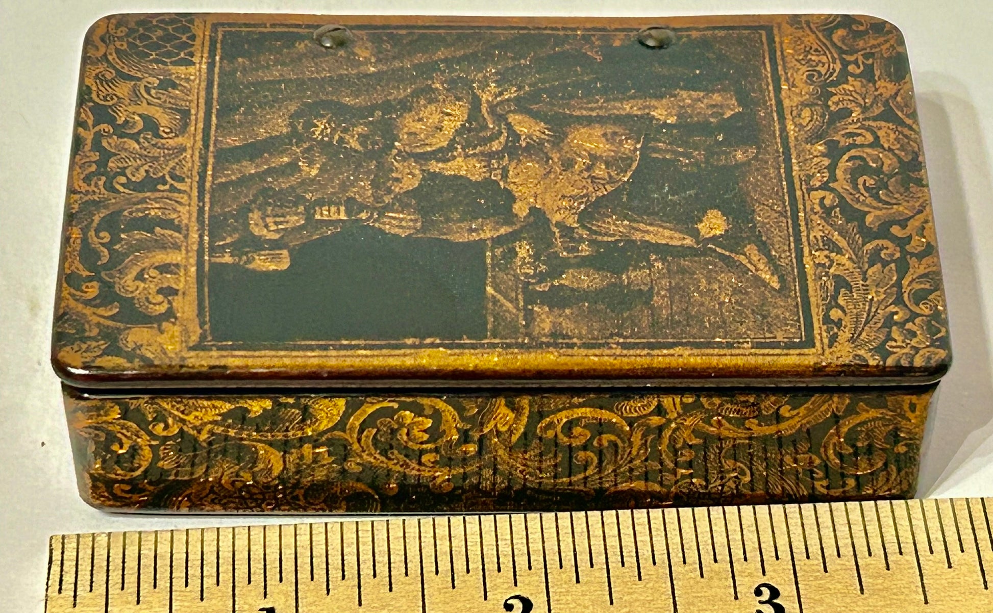 ANTIQUE KING DESIGN PAPER MACHE SNUFF BOX 3 1/2" LONG. CALL OR TEXT FOR MORE INFORMATION