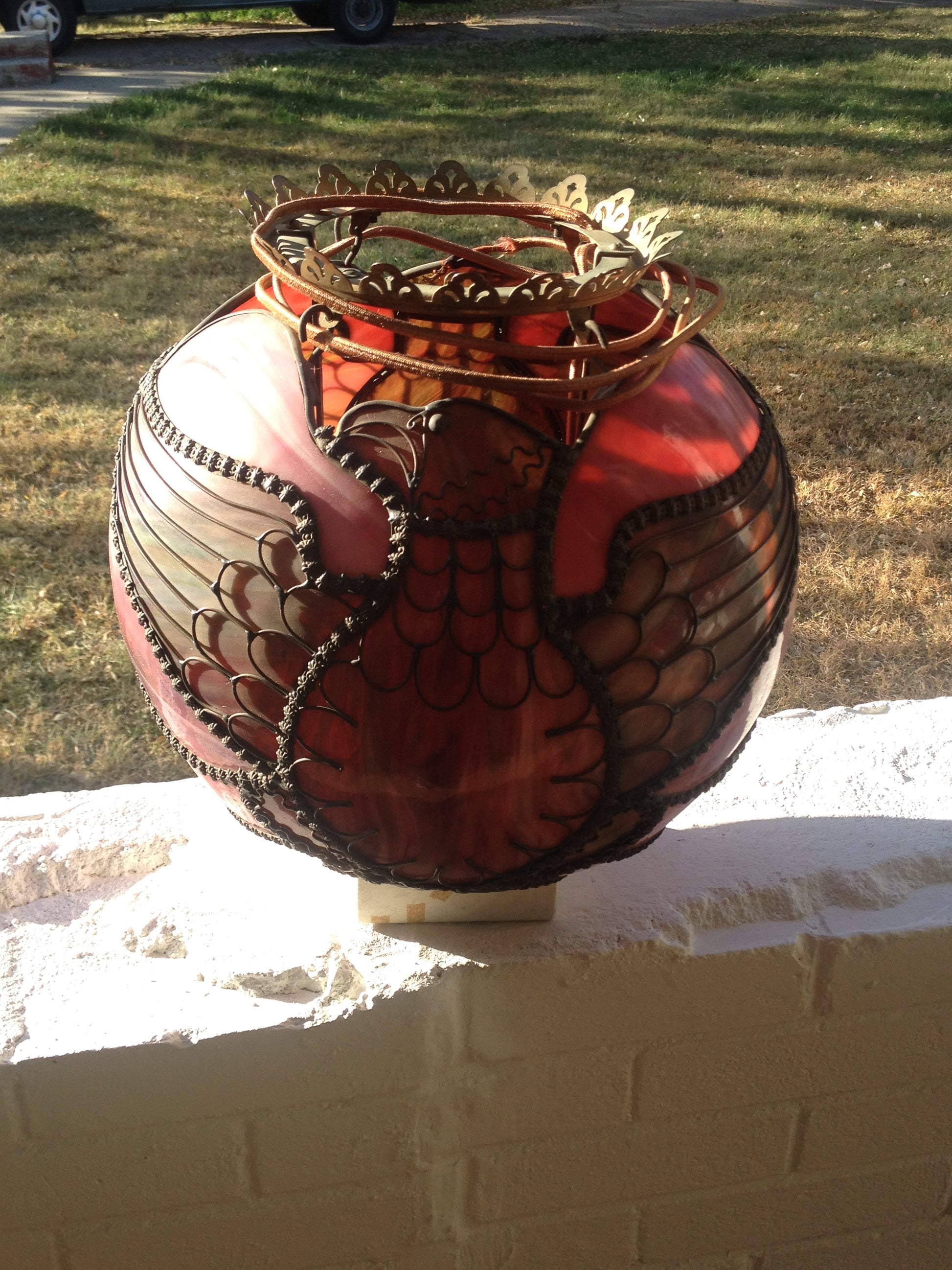 ANTIQUE STAINED GLASS BALL SHAPE LEADED GLASS EAGLE DESIGN HANGING LAMP. CALL OR TEXT FOR MORE INFORMATION