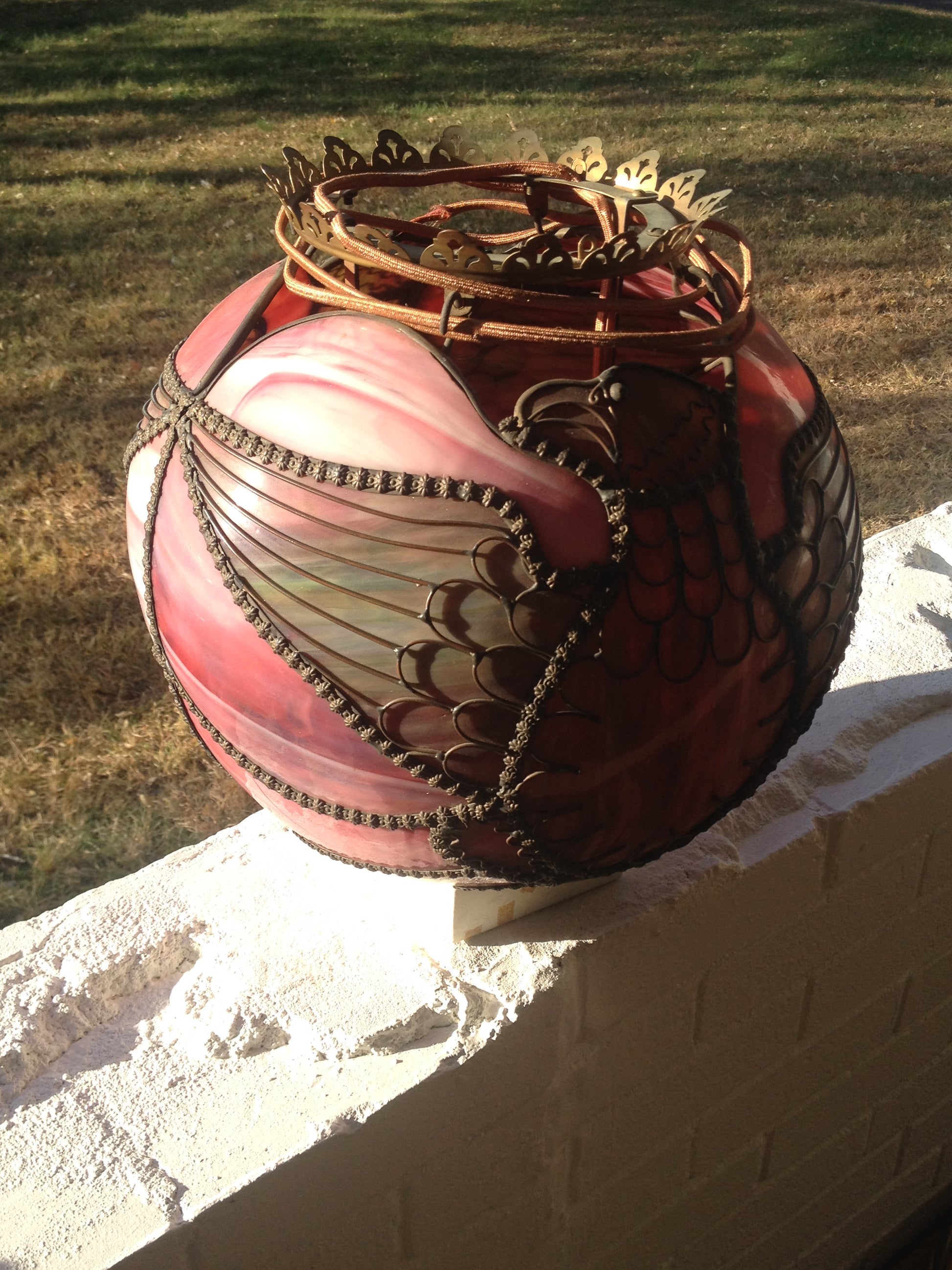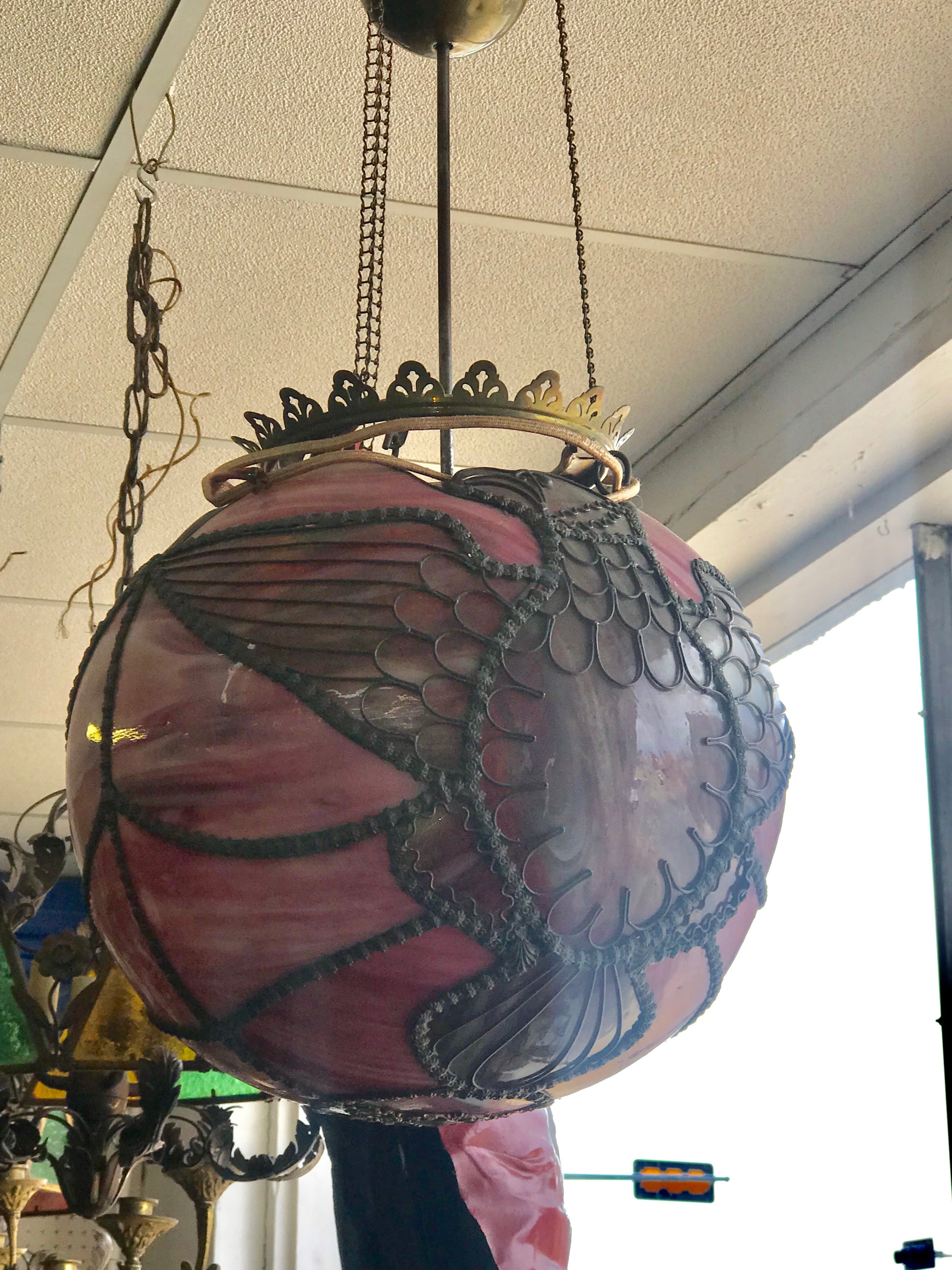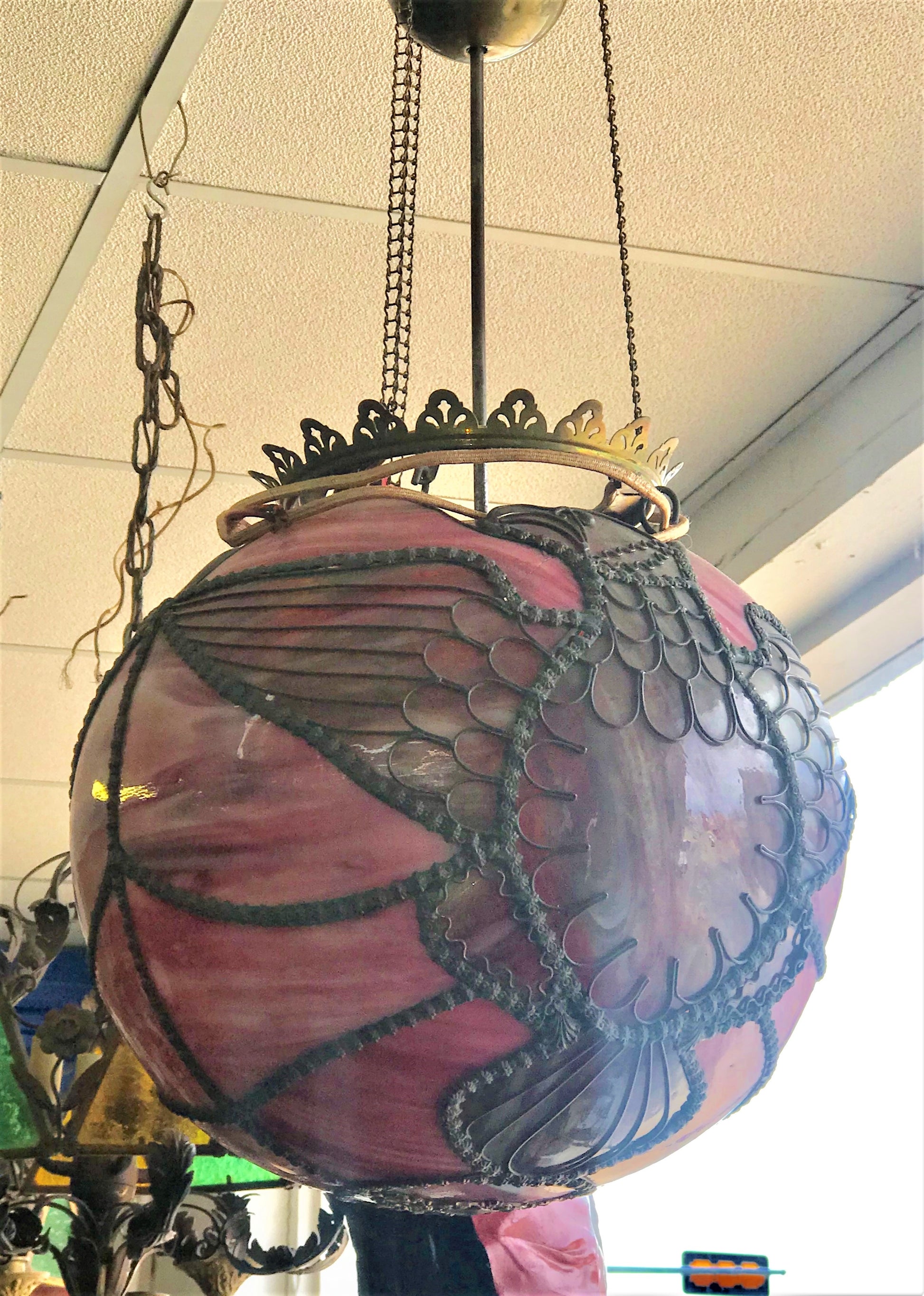 ANTIQUE STAINED GLASS BALL SHAPE LEADED GLASS EAGLE DESIGN HANGING LAMP. RARE