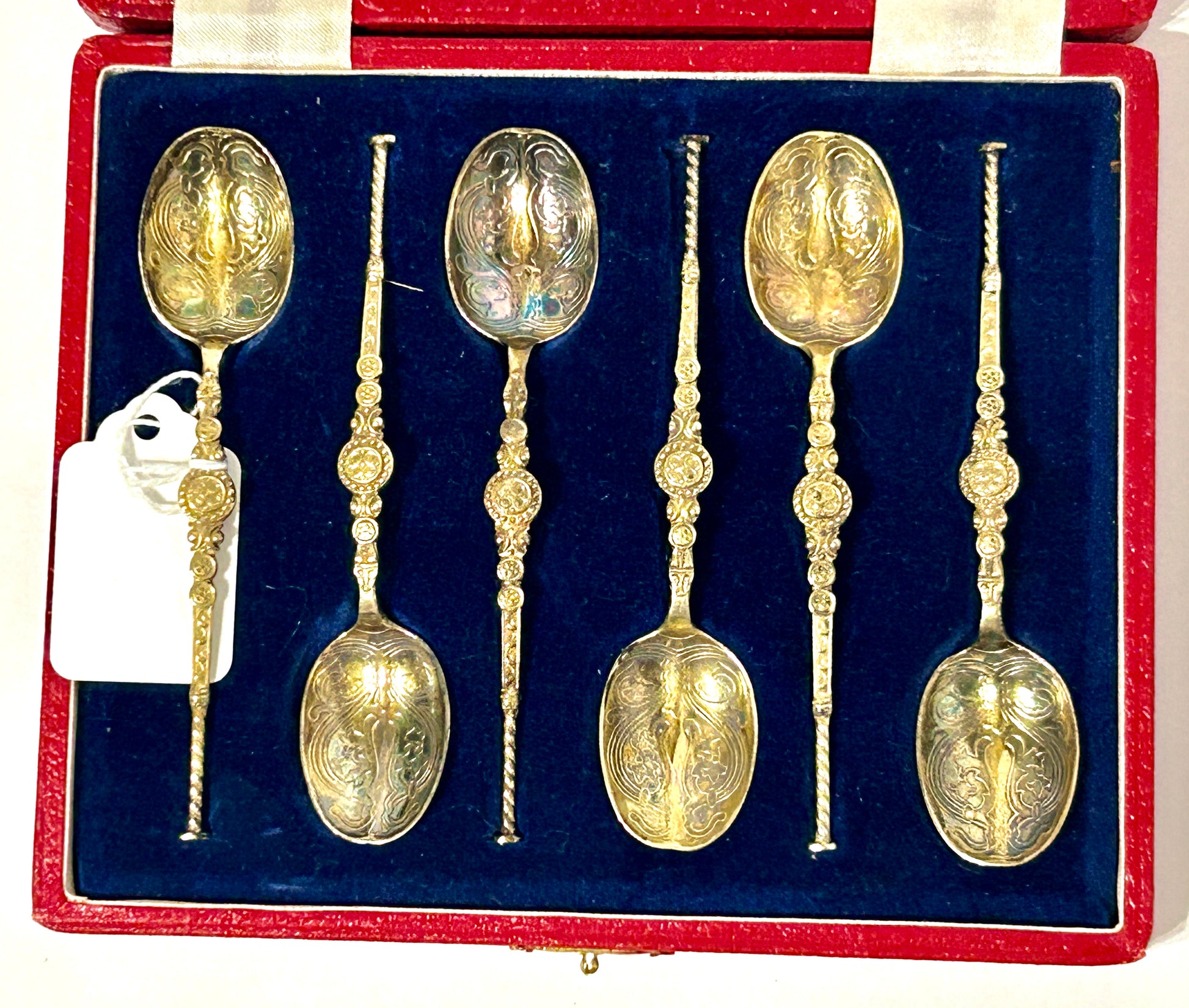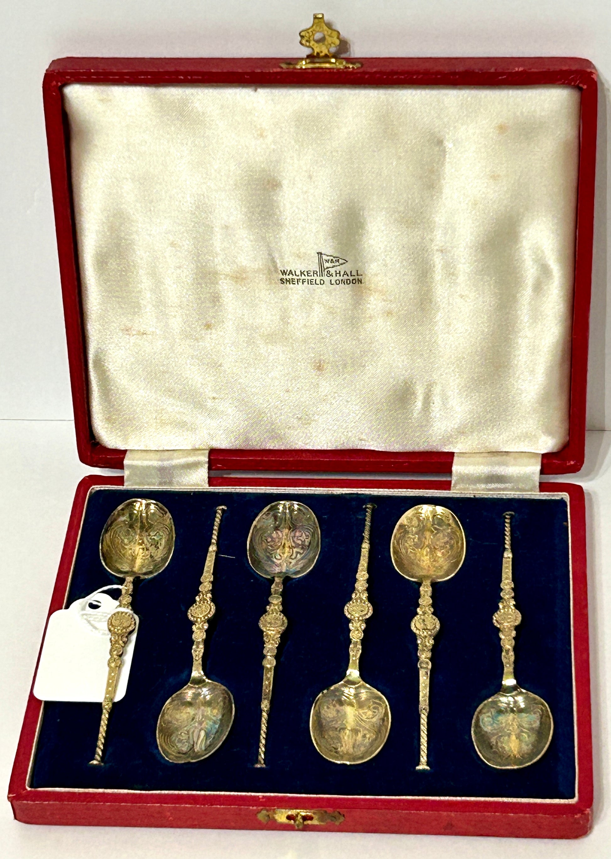 ANTIQUE STERLING SET OF SIX FANCY COFFEE SPOONS CIRCA 1900 BY WALKER & HALL LONDON IN ORIGINAL CASE, SPOONS EACH 4 1/4" LONG. SHIPPING COSTS ARE EXTRA SO CALL OR TEXT TO GET COST OF SHIPPING TO YOUR LOCATION