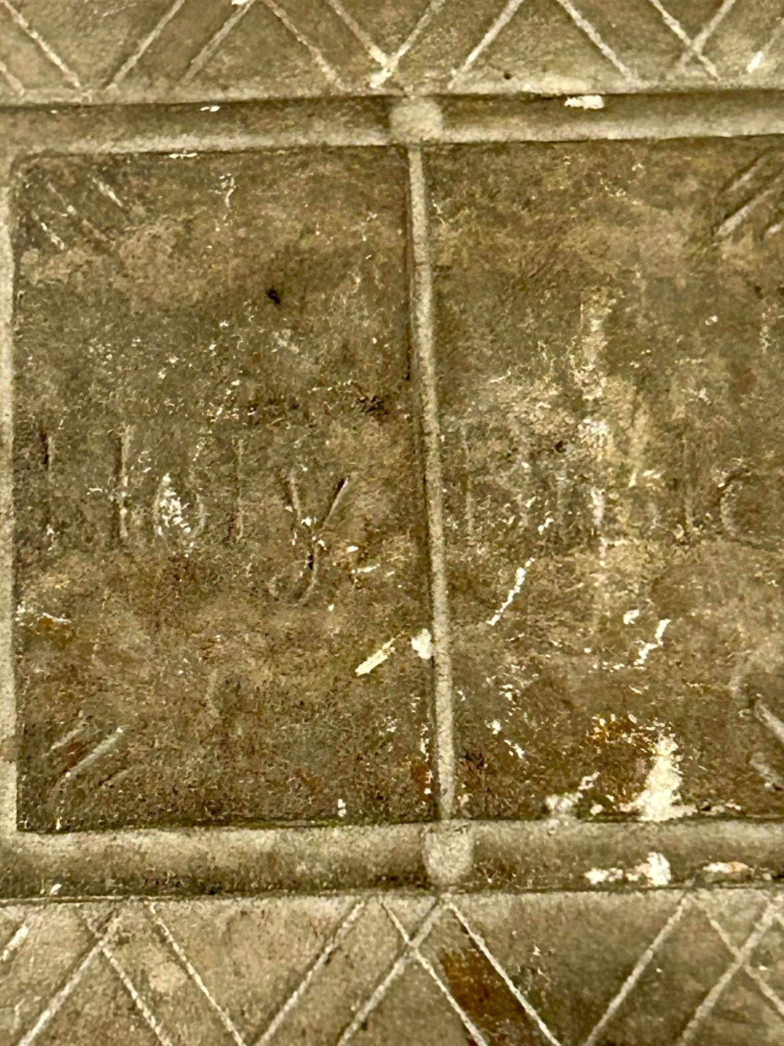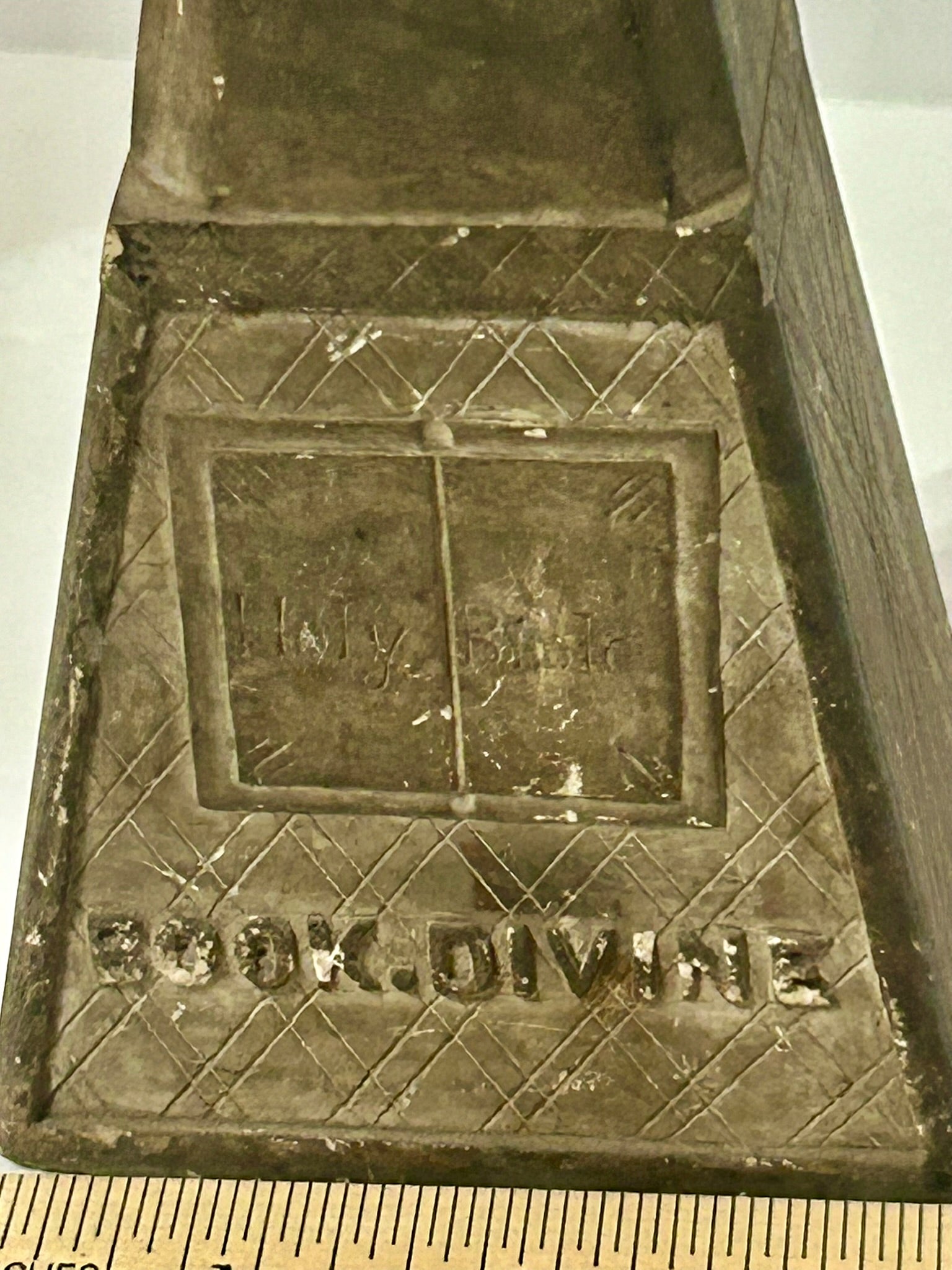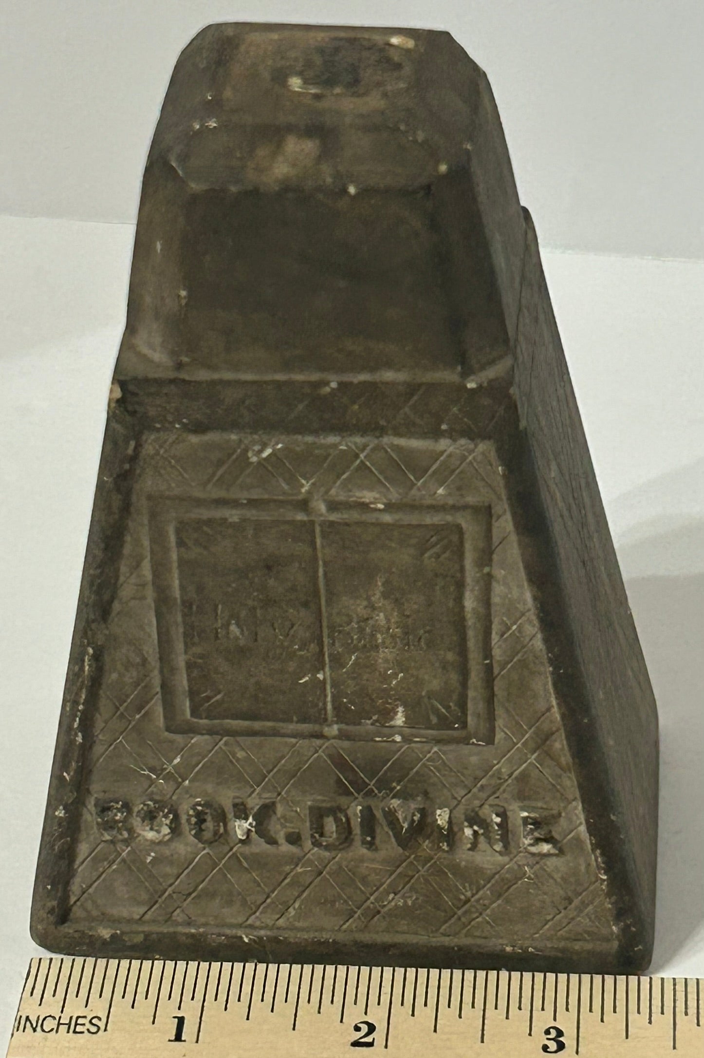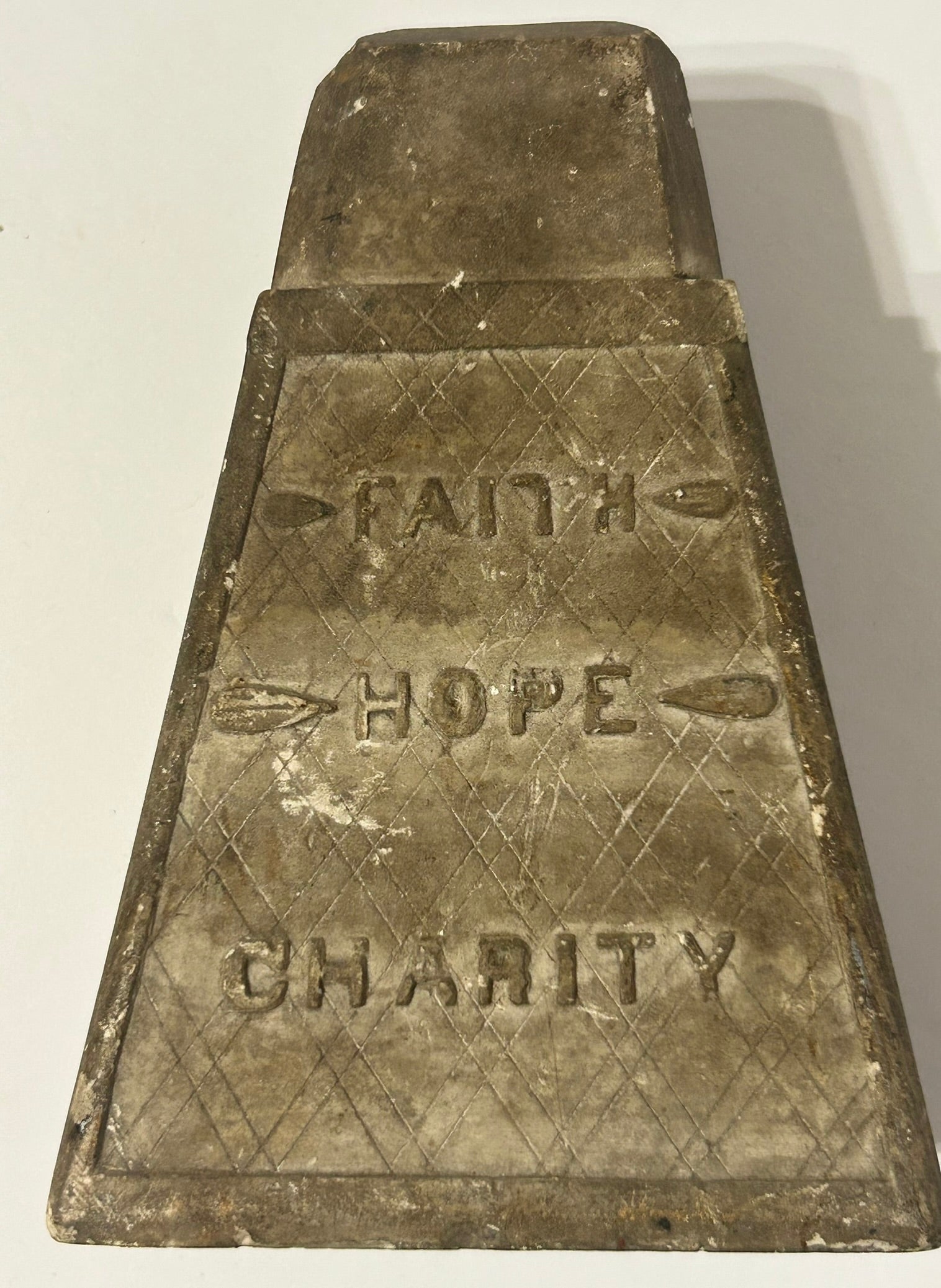 ANTIQUE STONE CARVING OF "FAITH. HOPE, & CHARITY" WITH OPPOSITE SIDE CARVED HOLY BIBLE AND "BOOK DIVINE" 5" TALL. CALL OR TEXT FOR MORE INFORMATION
