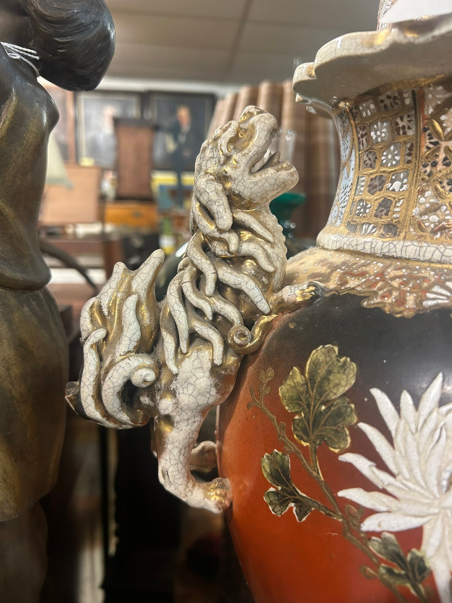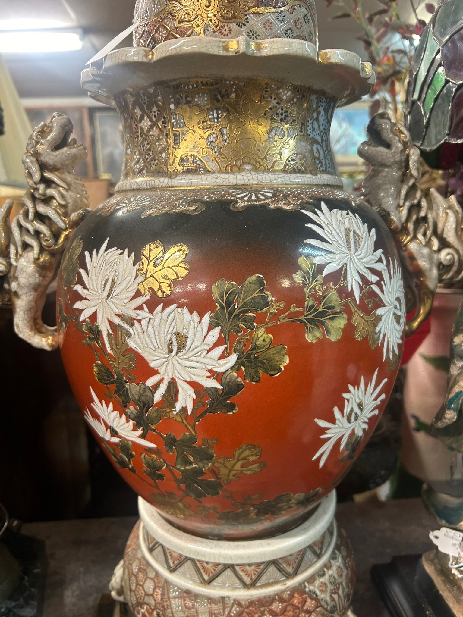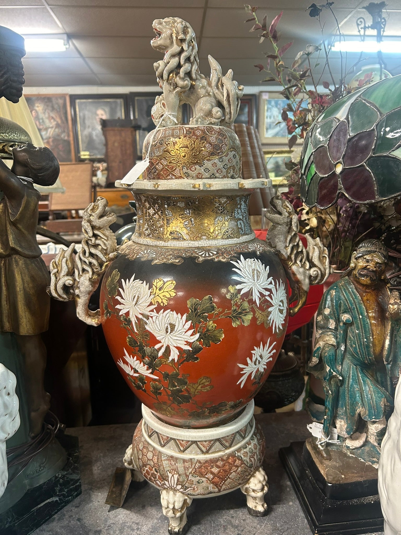 ANTIQUE 27" TALL SATSUMA CIRCA 1900 THREE FACE URN. CALL, TEXT, OR E-MAIL FOR MORE INFORMATION