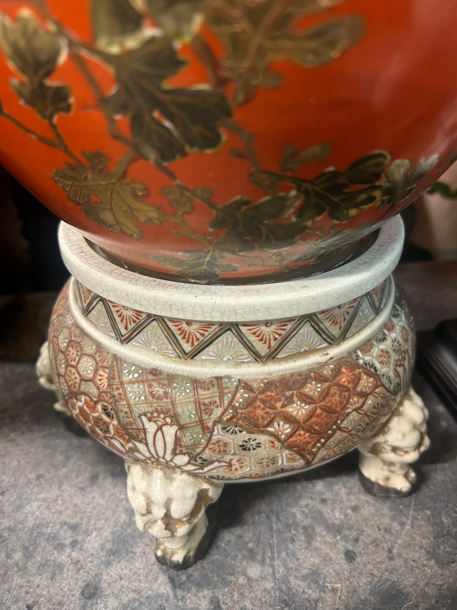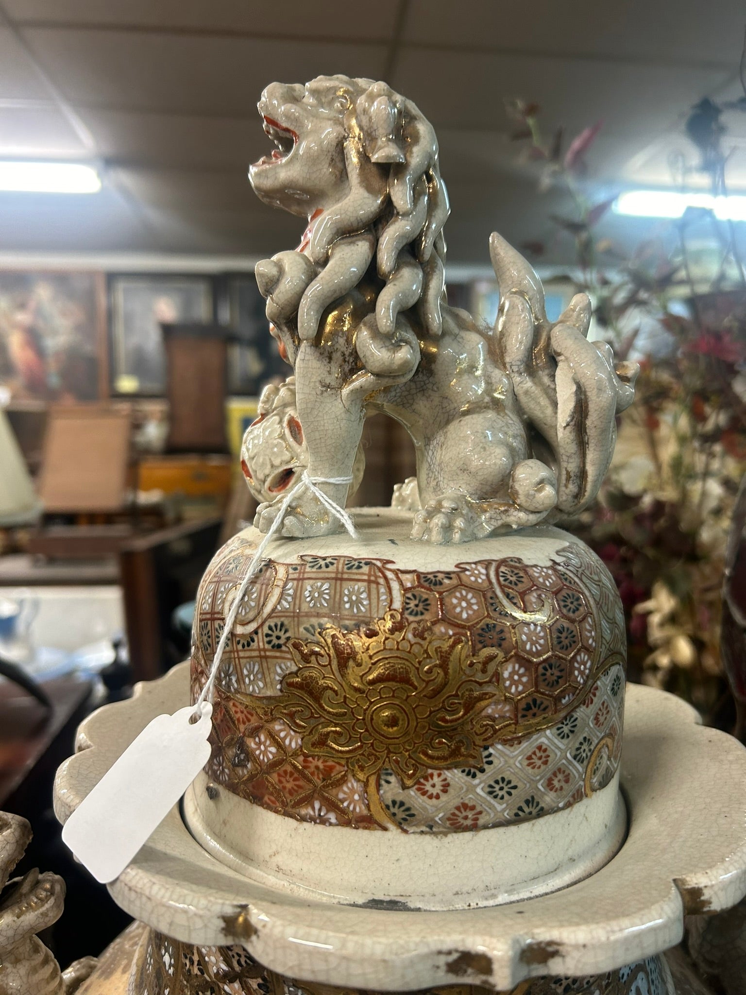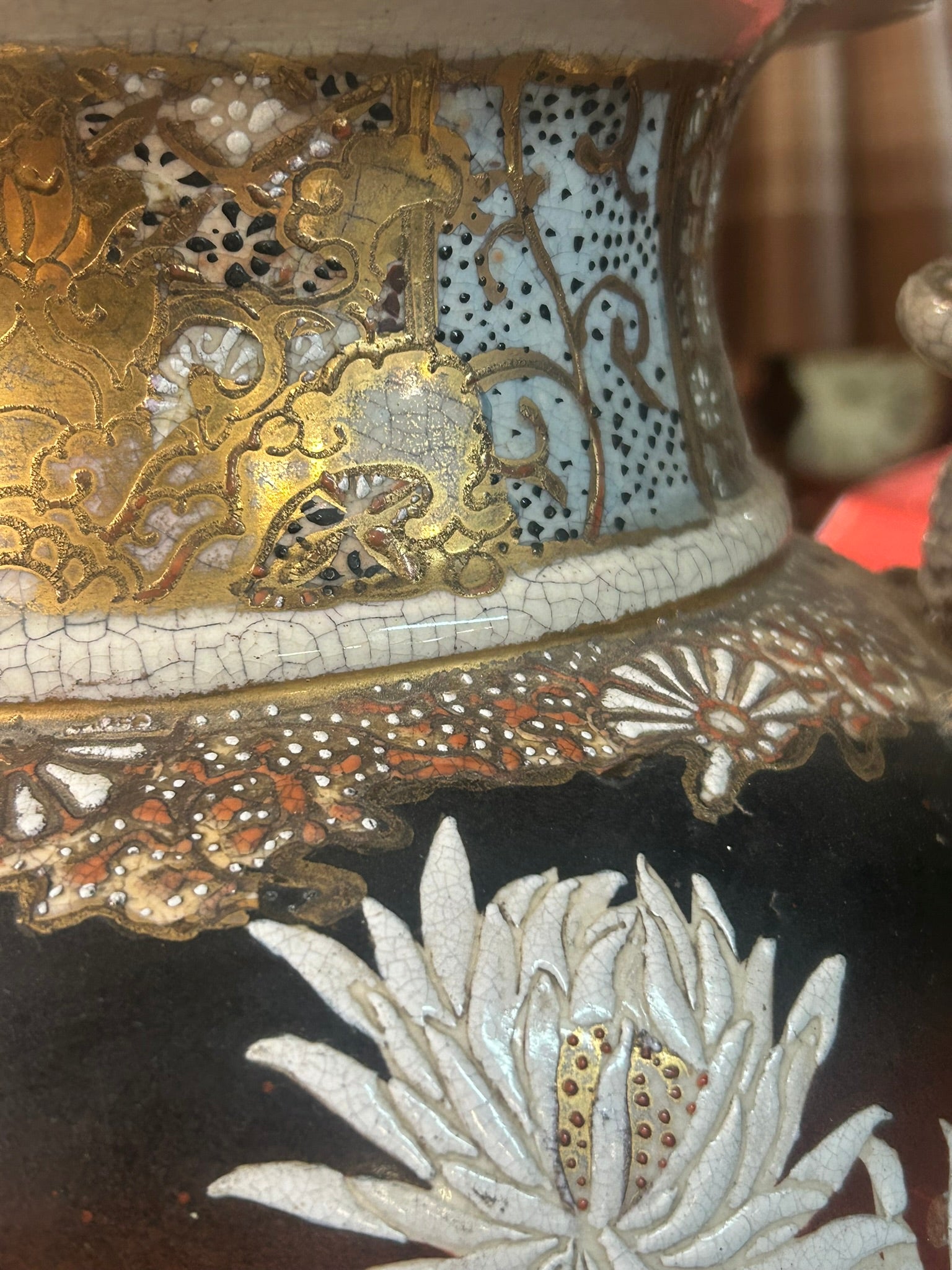 ANTIQUE 27" TALL SATSUMA CIRCA 1900 THREE FACE URN. CALL, TEXT, OR E-MAIL FOR MORE INFORMATION