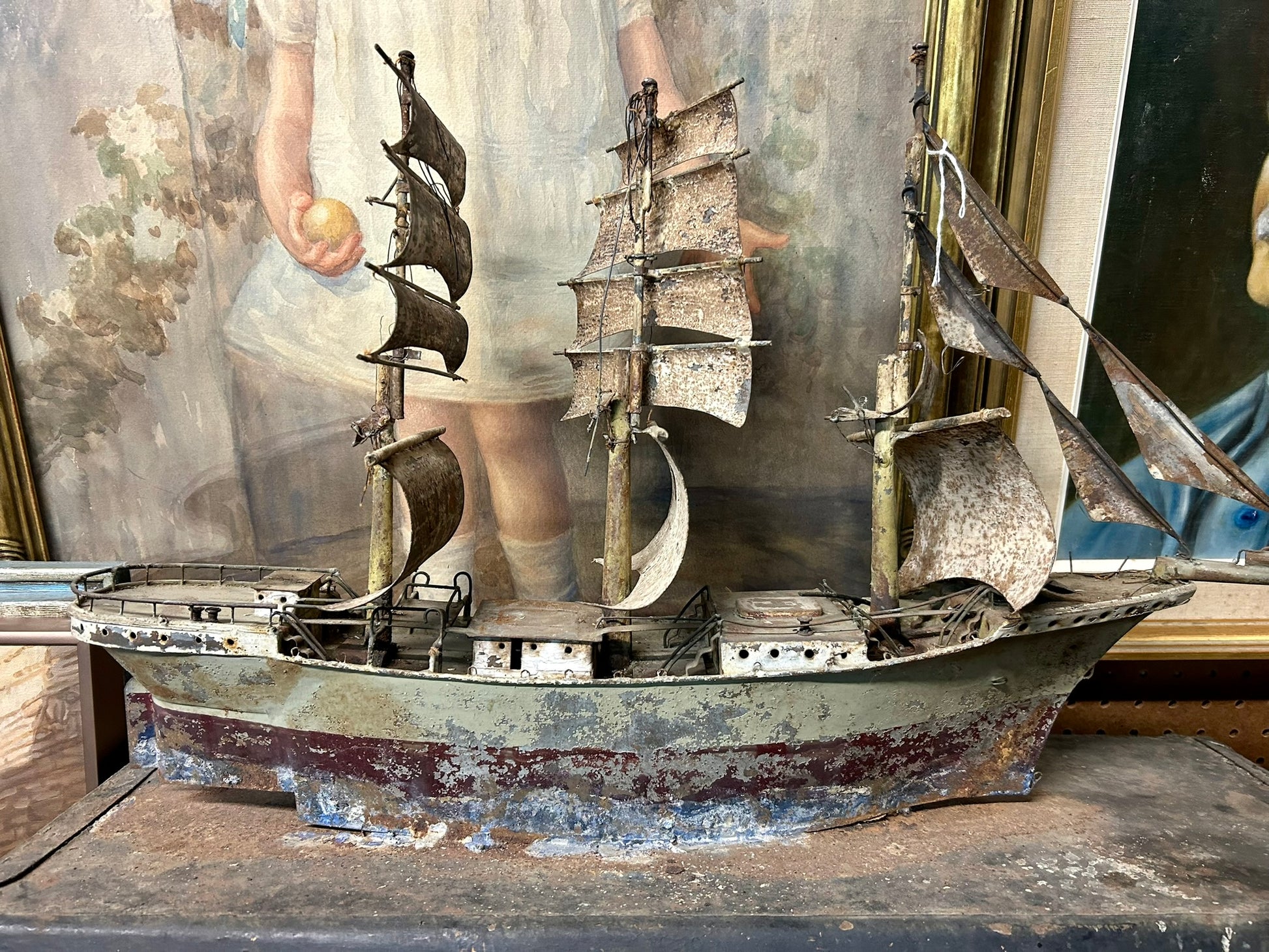 ANTIQUE TIN FOLK ART SAILING SHIP 28" LONG X 18" HIGH. CALL OR TEXT FOR MORE INFORMATION