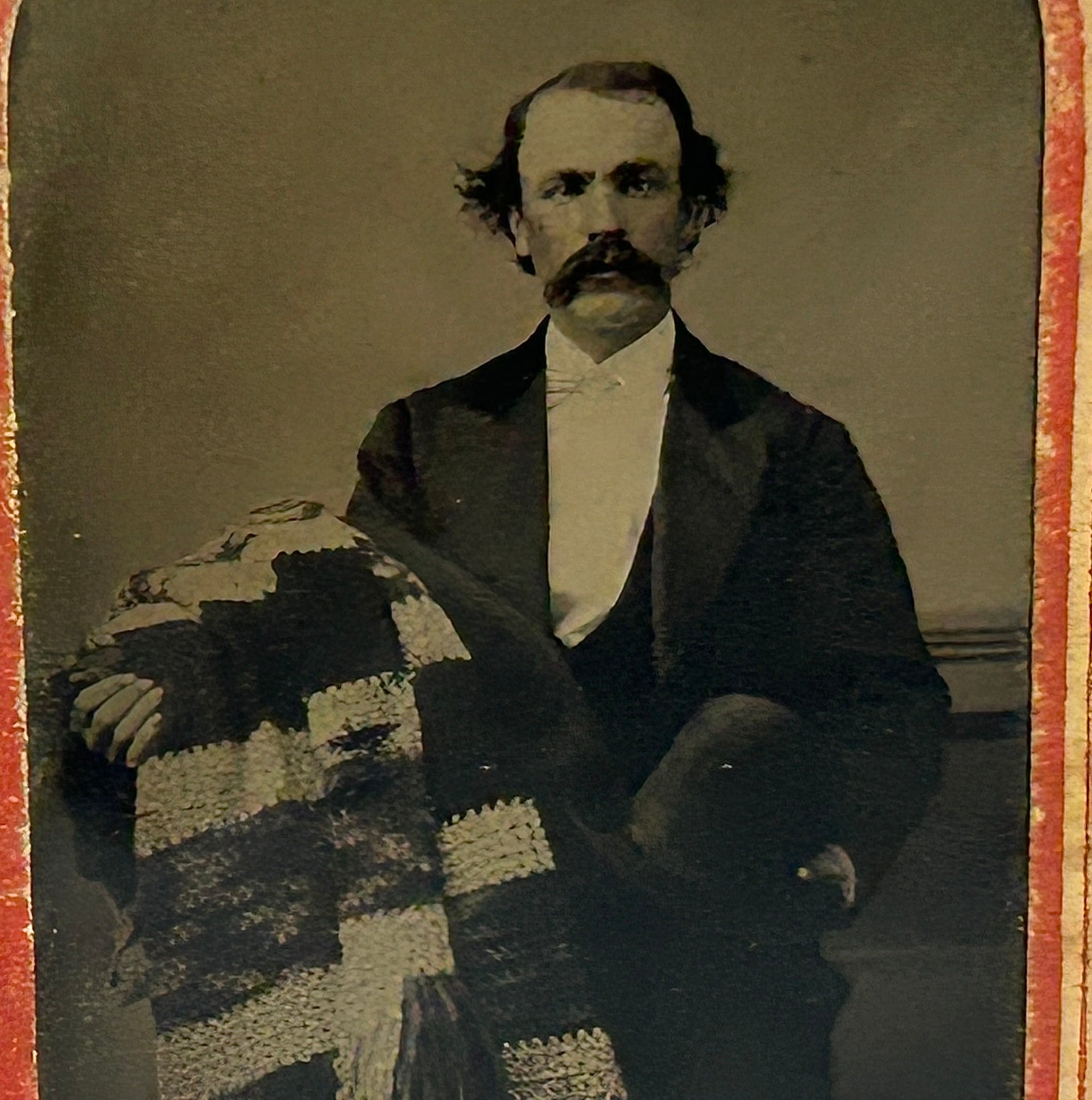 ANTIQUE TINTYPE PHOTO OF MAN WITH CROCHET BLANKET