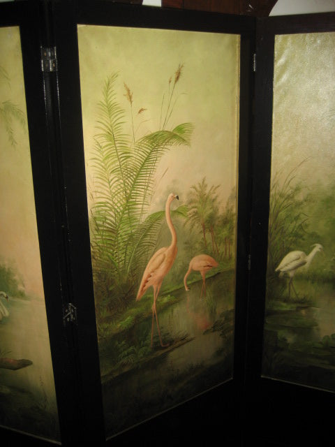 ANTIQUE TRIPLE PANEL FOLDING SCREEN WITH HAND PAINTED BIRDS AND FOLIAGE 63" TALL WITH THREE PANELS EACH 25". CALL, TEXT, OR E-MAIL FOR MORE INFORMATION