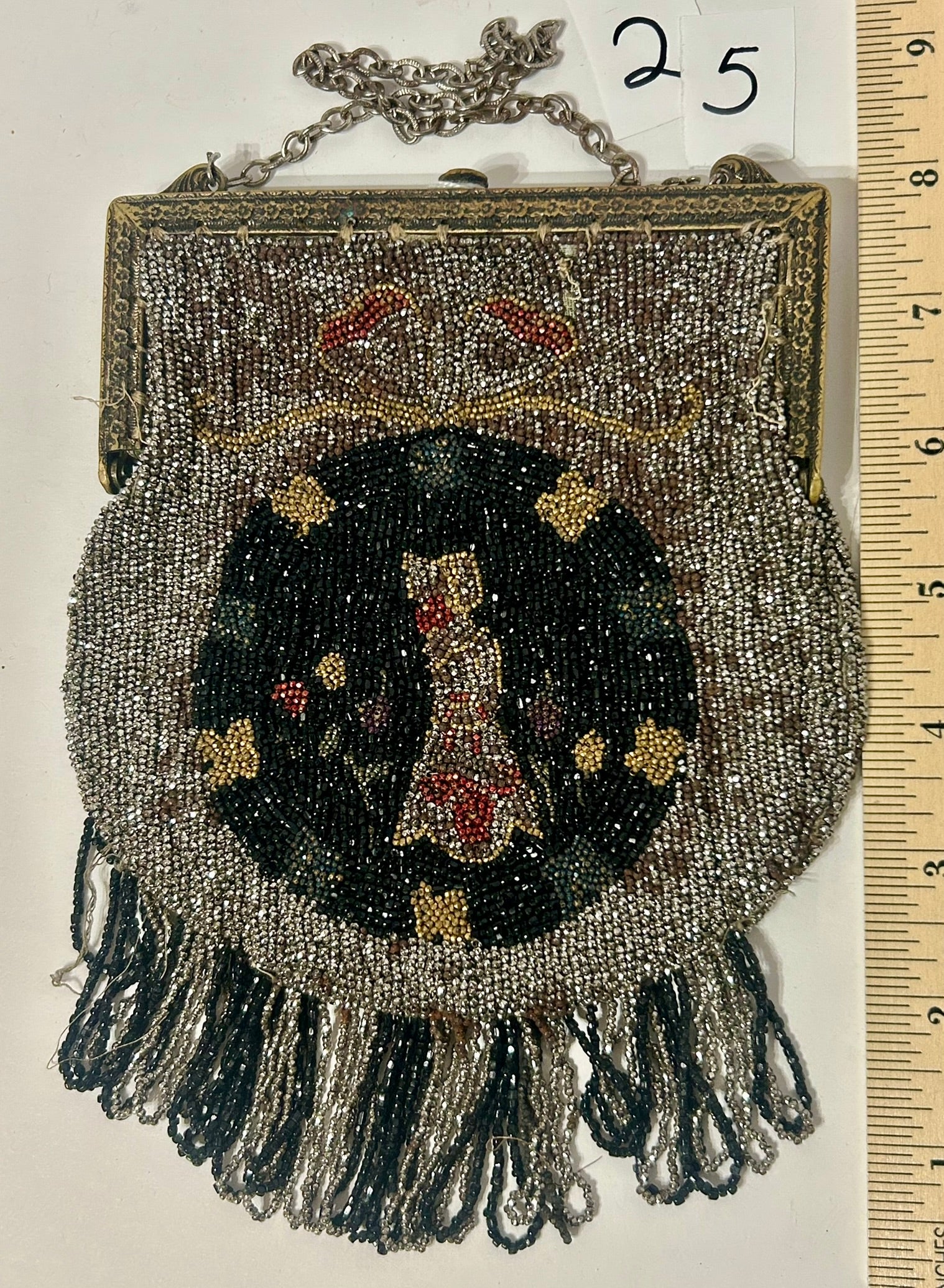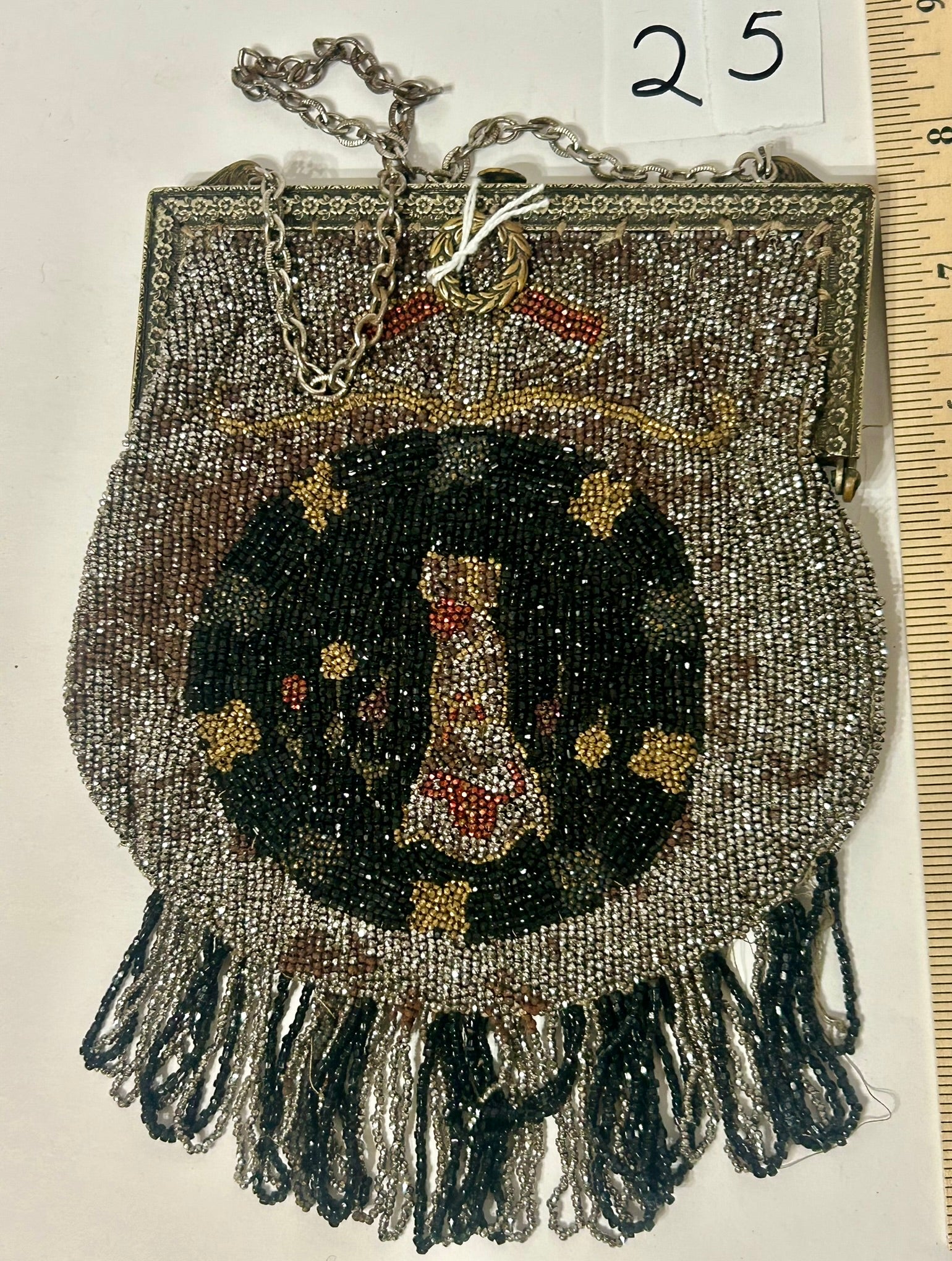 ANTIQUE BEADED "BONNET GIRL" UNUSUAL DESIGN 8" LONG PURSE, NOTE BEAD LOSS ALONG BOTTOM FRINGE. CALL OR TEXT FOR MORE INFORMATION