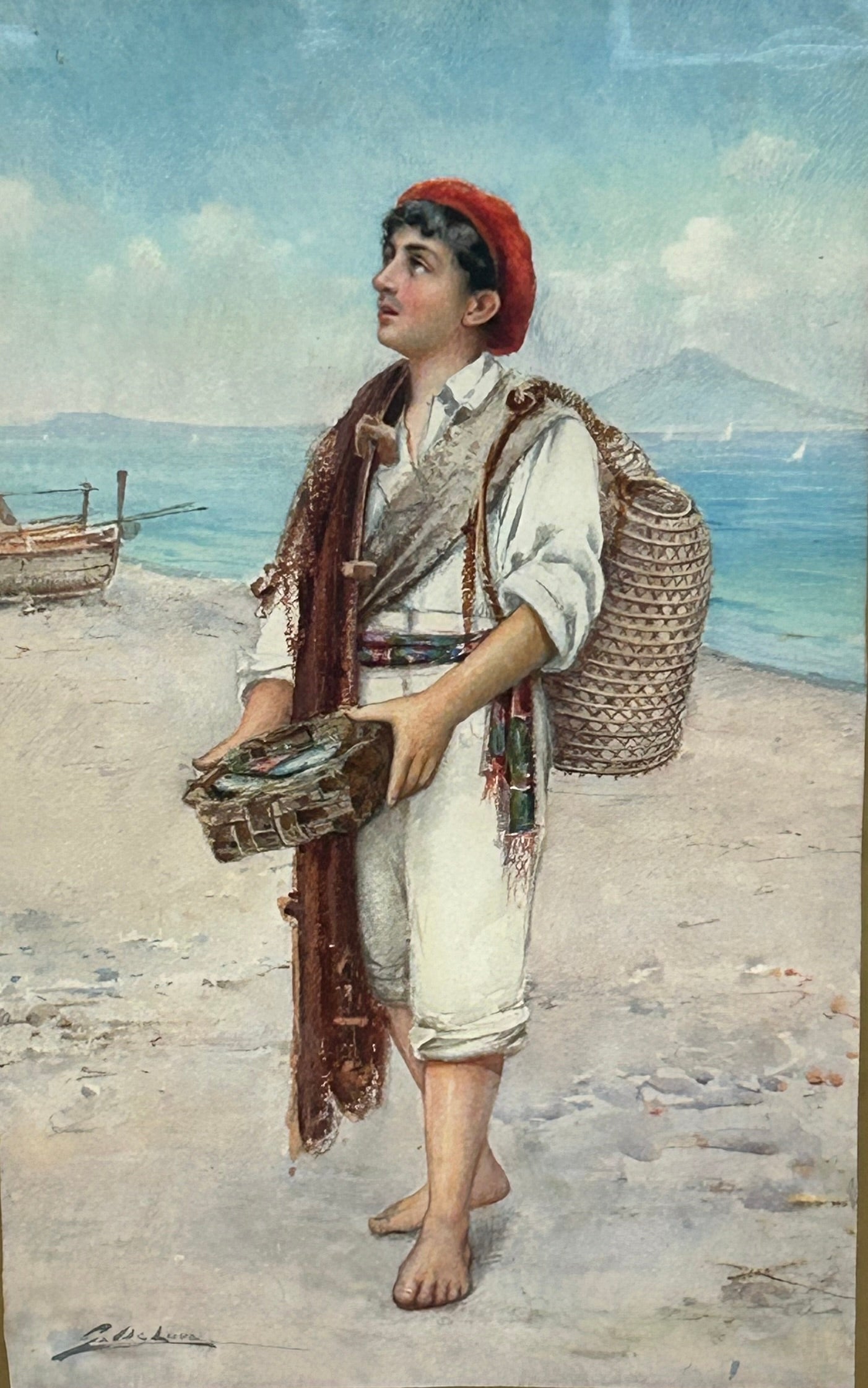 ANTIQUE WATERCOLOR PAINTING BY G. DELUCA OF BOY ON SHORE