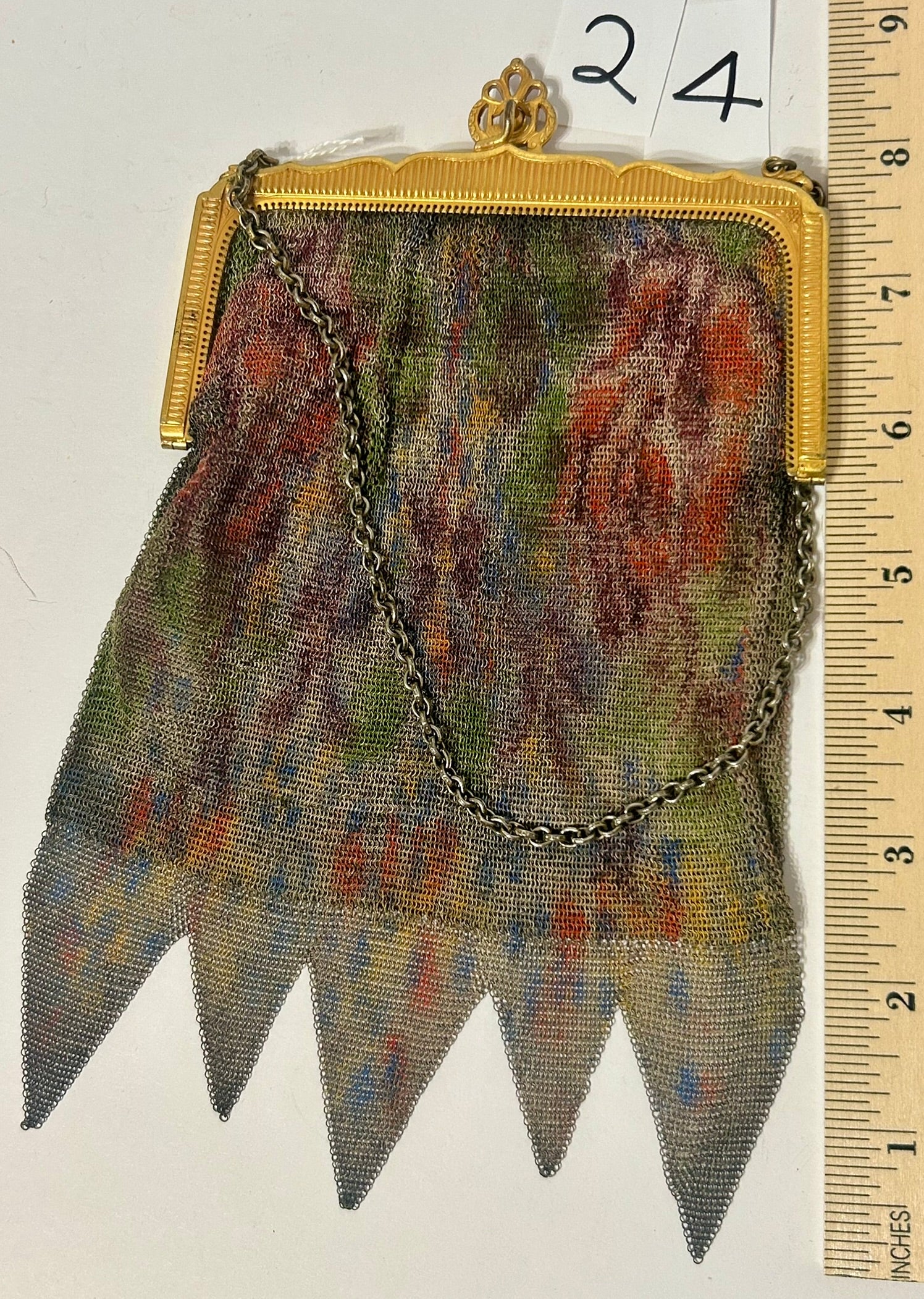 ANTIQUE WHITING AND DAVIS FINE MESH FLORAL DESIGN PURSE 9" LONG. CALL OR TEXT FOR MORE INFORMATION