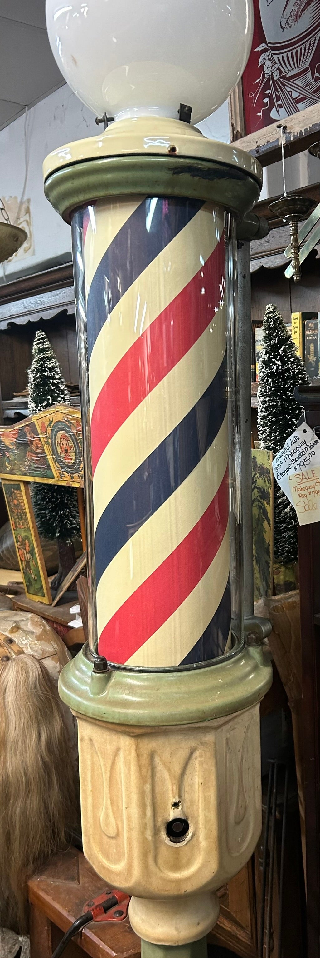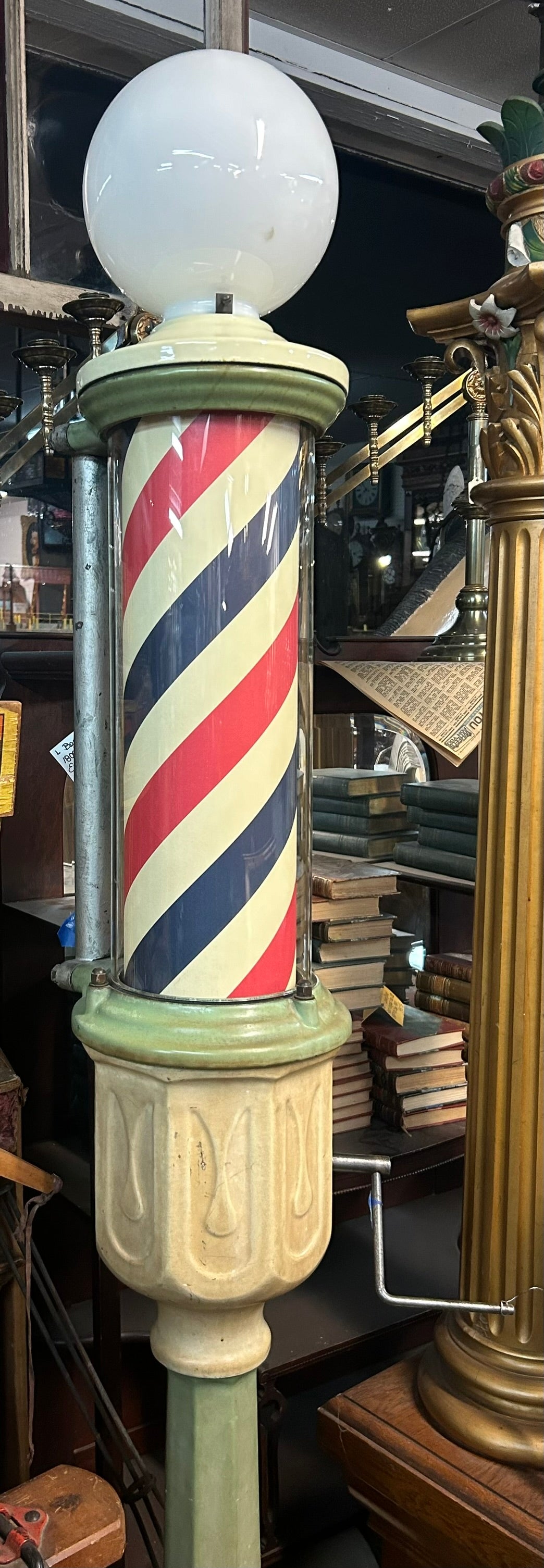 ANTIQUE KEY WIND SCARCE BARBER POLE IN GOOD OVERALL CONDITION, HAS ELECTRIC BULB IN TOP GLOBE, 82" TALL. CALL, TEXT, OR E-MAIL FOR MORE INFORMATION