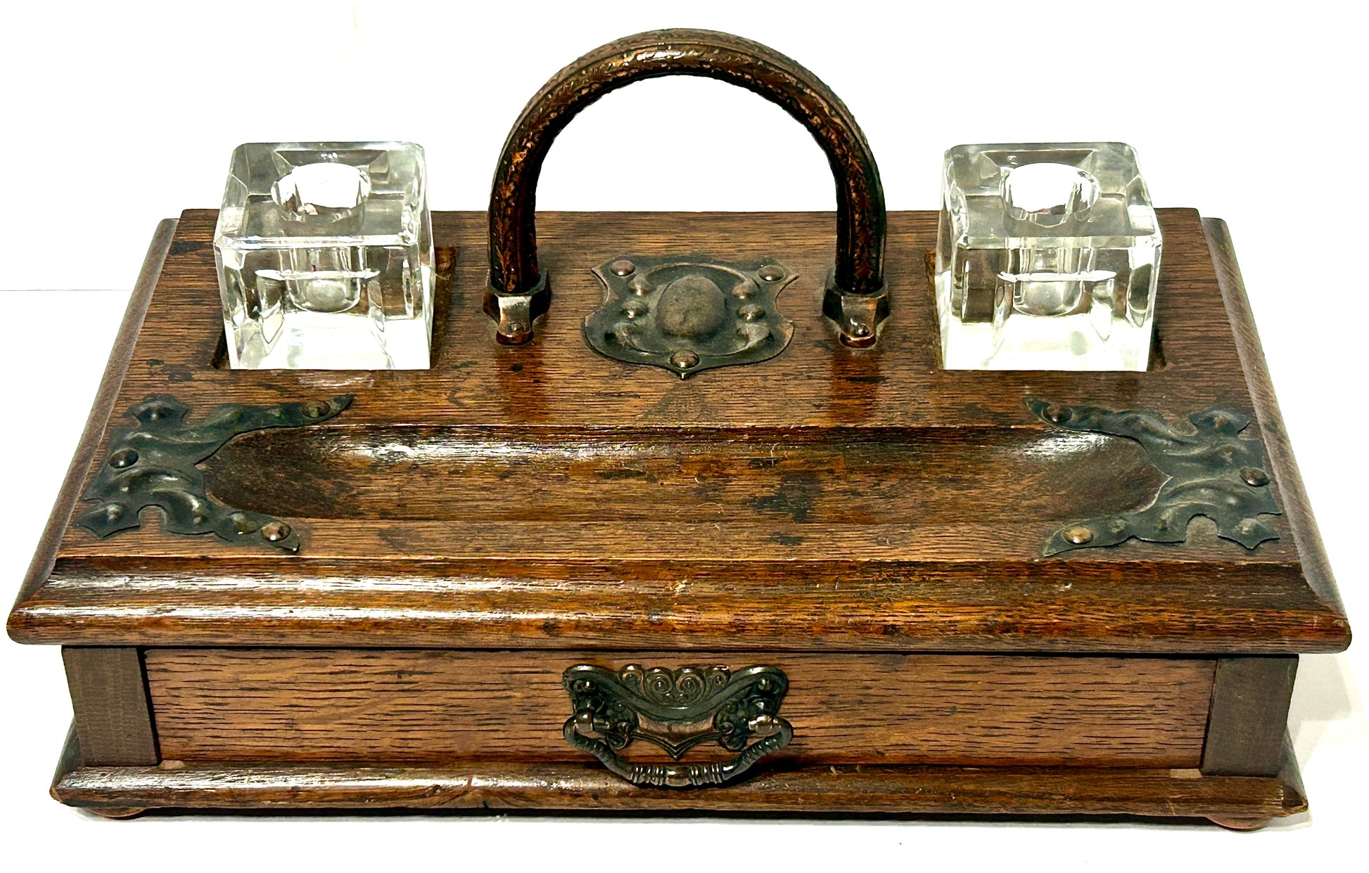 ANTIQUE OAK WOOD DESKTOP INKWELL HOLDER WITH DRAWER 12" WIDE X 6" TALL X 7" DEEP. SHIPPING IS EXTRA COST SO CALL OR TEXT FOR PRICE FOR SHIPPING