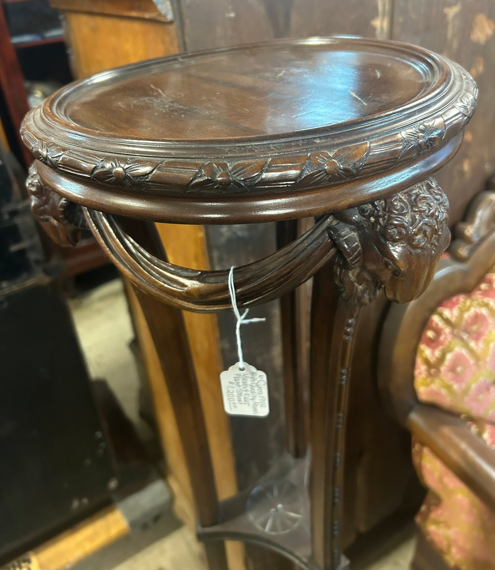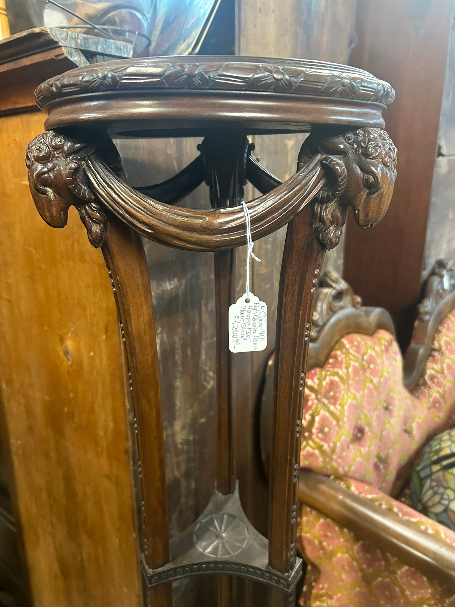 ANTIQUE WOOD TALL STAND WITH RAM'S HEADS AND FEET