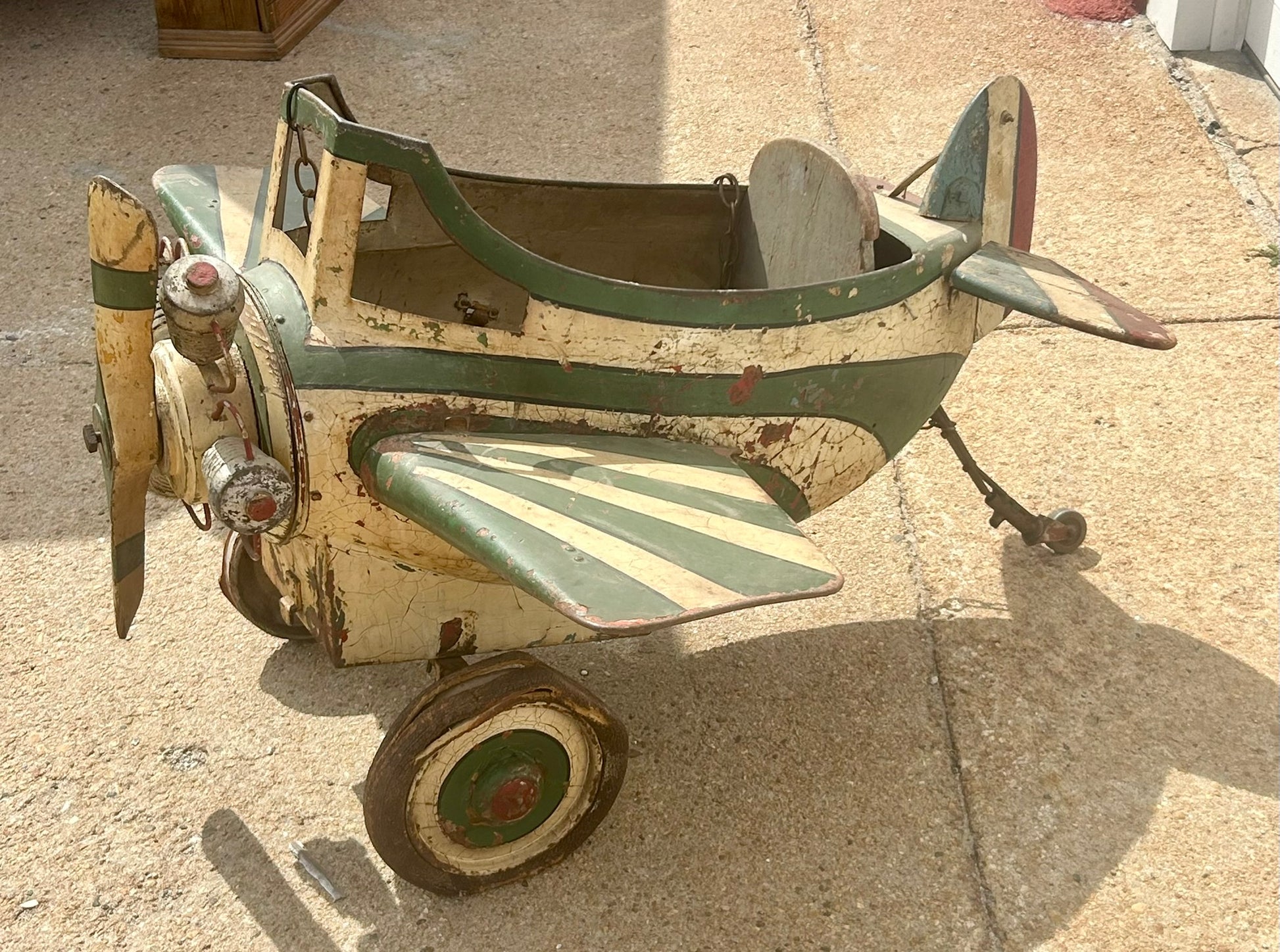ANTIQUE WOOD AND METAL CAROUSEL AIRPLANE WITH ORIGINAL PAINT, THIS IS NOT A PEDAL CAR AND PROBABLY WAS USED FOR A RIDE ON A CAROUSEL, MEASURES 44" WIDE X 41" LONG. CALL, TEXT, OR E-MAIL FOR MORE INFORMATION