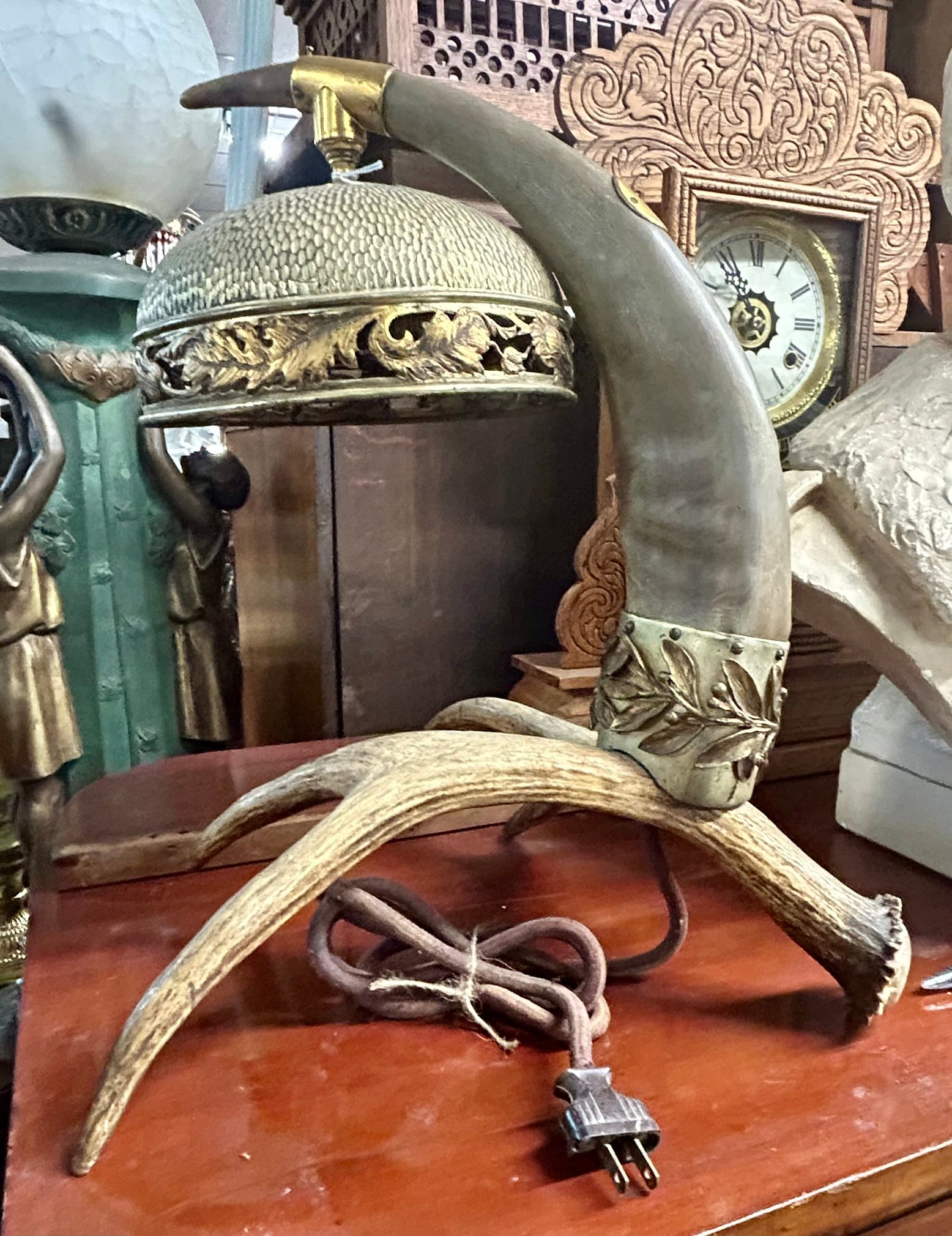 ANTLER LAMP WITH BRASS SHADE 1920'S - 1930'S