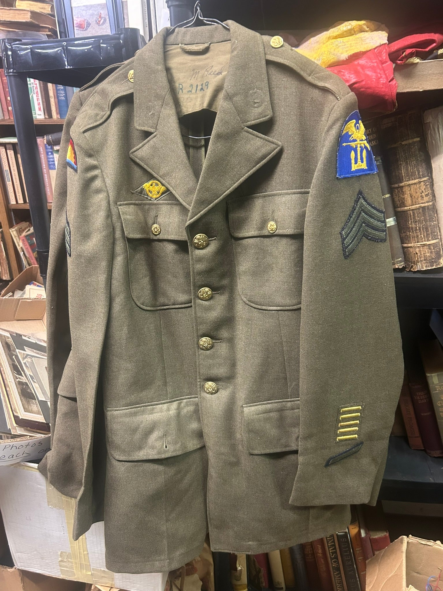 PAIR OF ARMY UNIFORM JACKETS WITH EMBLEMS AND CAPS. CALL OR TEXT FOR MORE INFORMATION