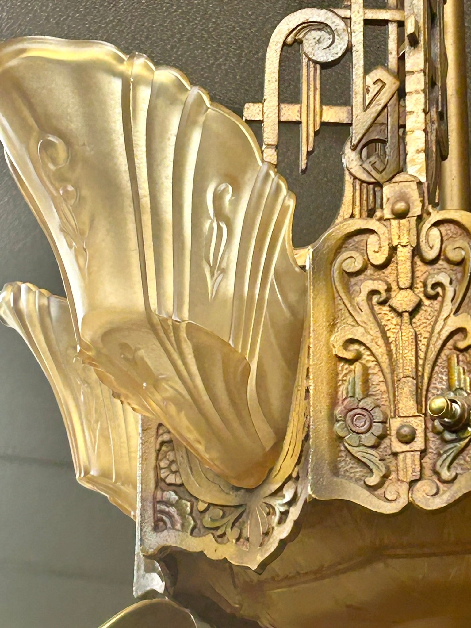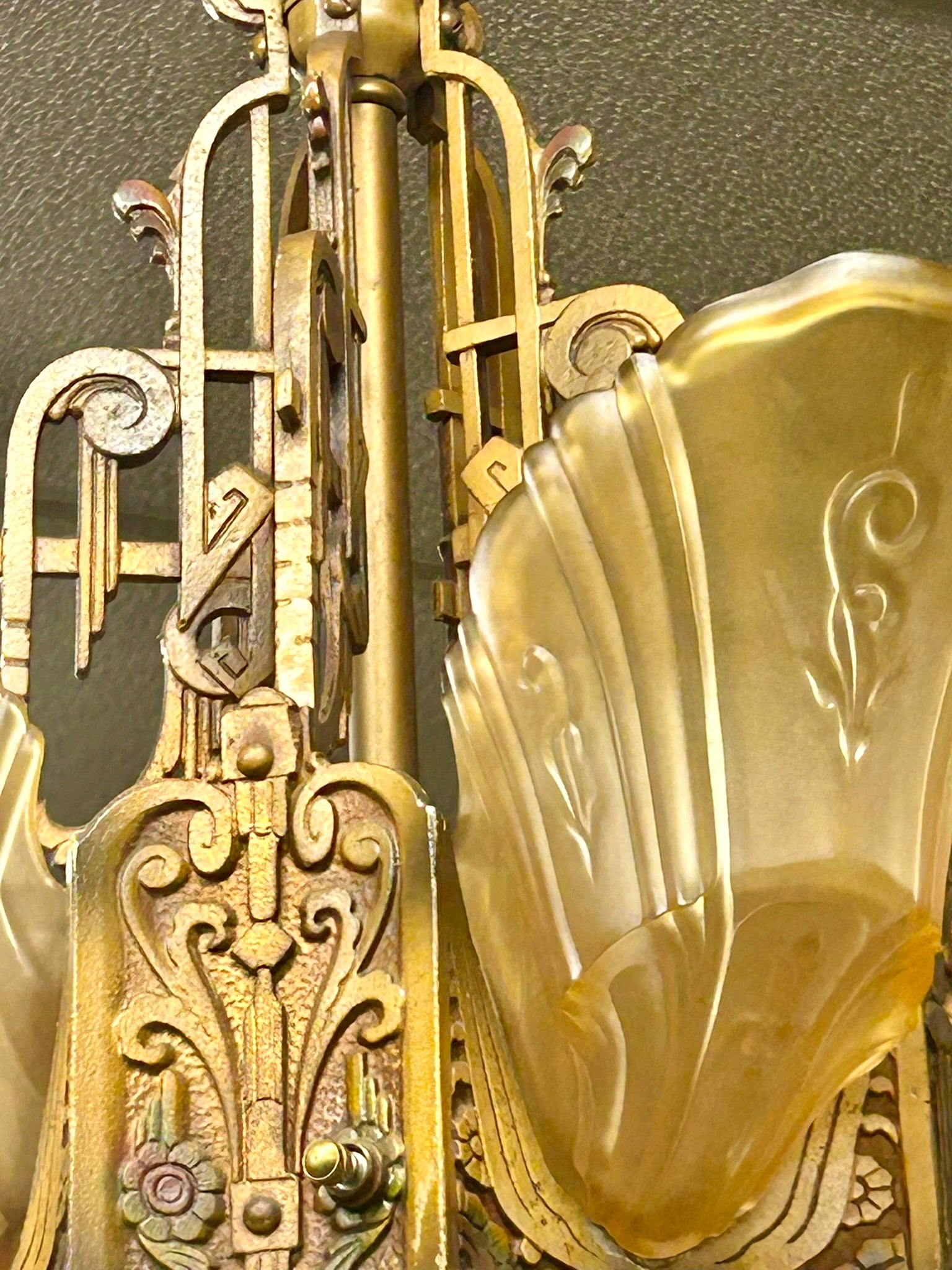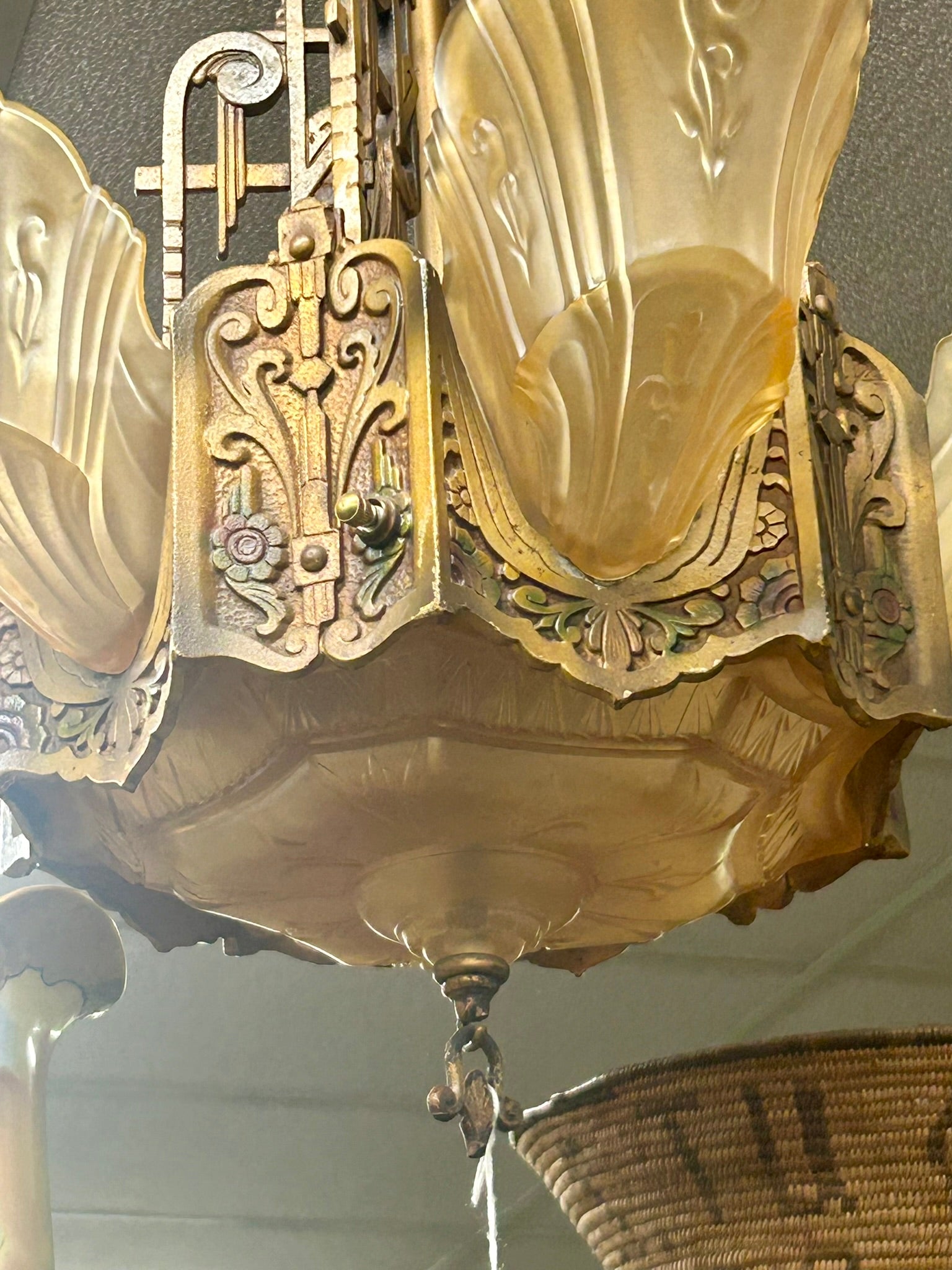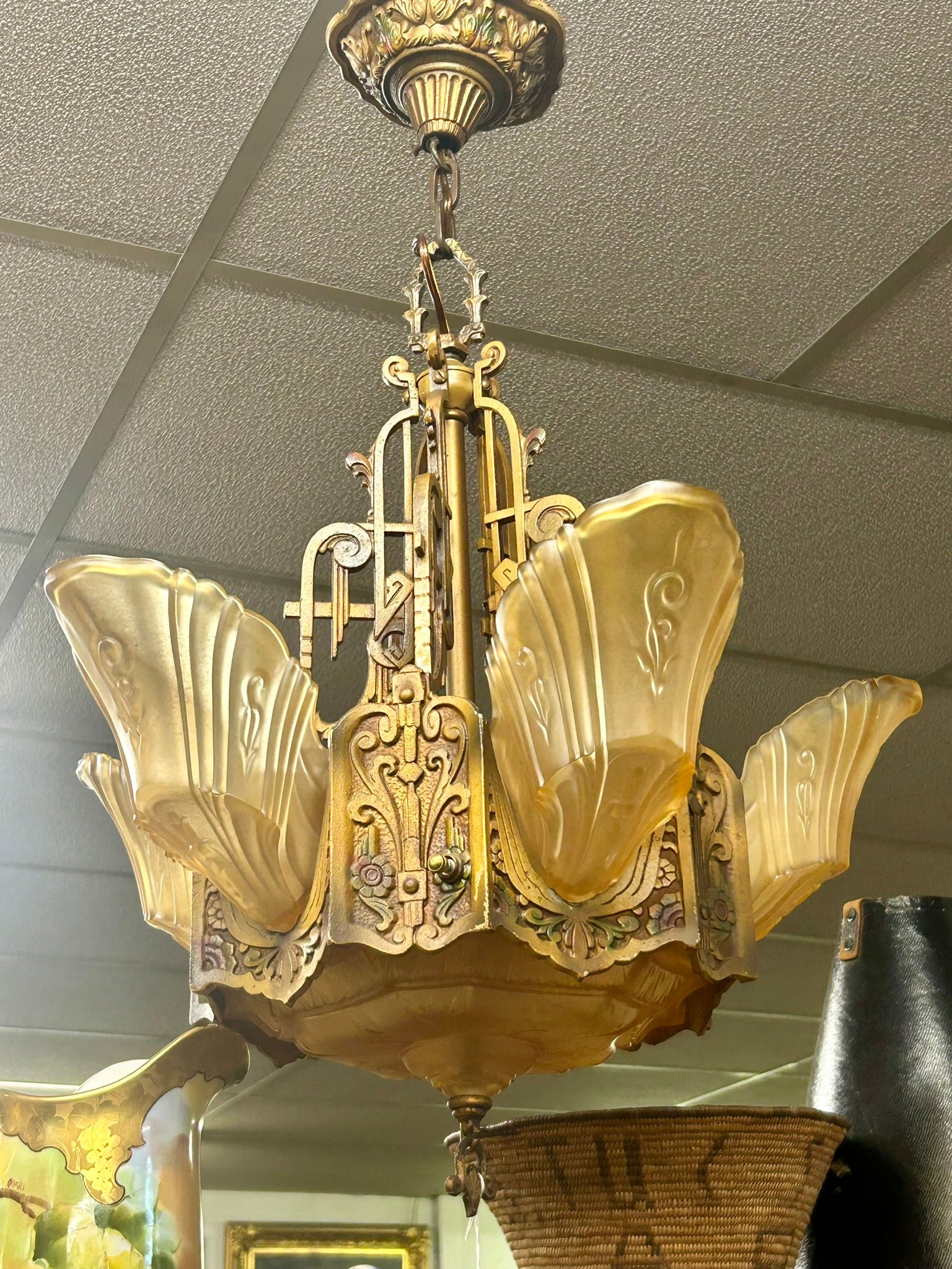 ART DECO CEILING LAMP WITH SLIP IN SHADES AND BOTTOM GLASS AND NICE DECO DESIGN METAL WORK. CALL, TEXT, OR E-MAIL FOR MORE INFORMATION