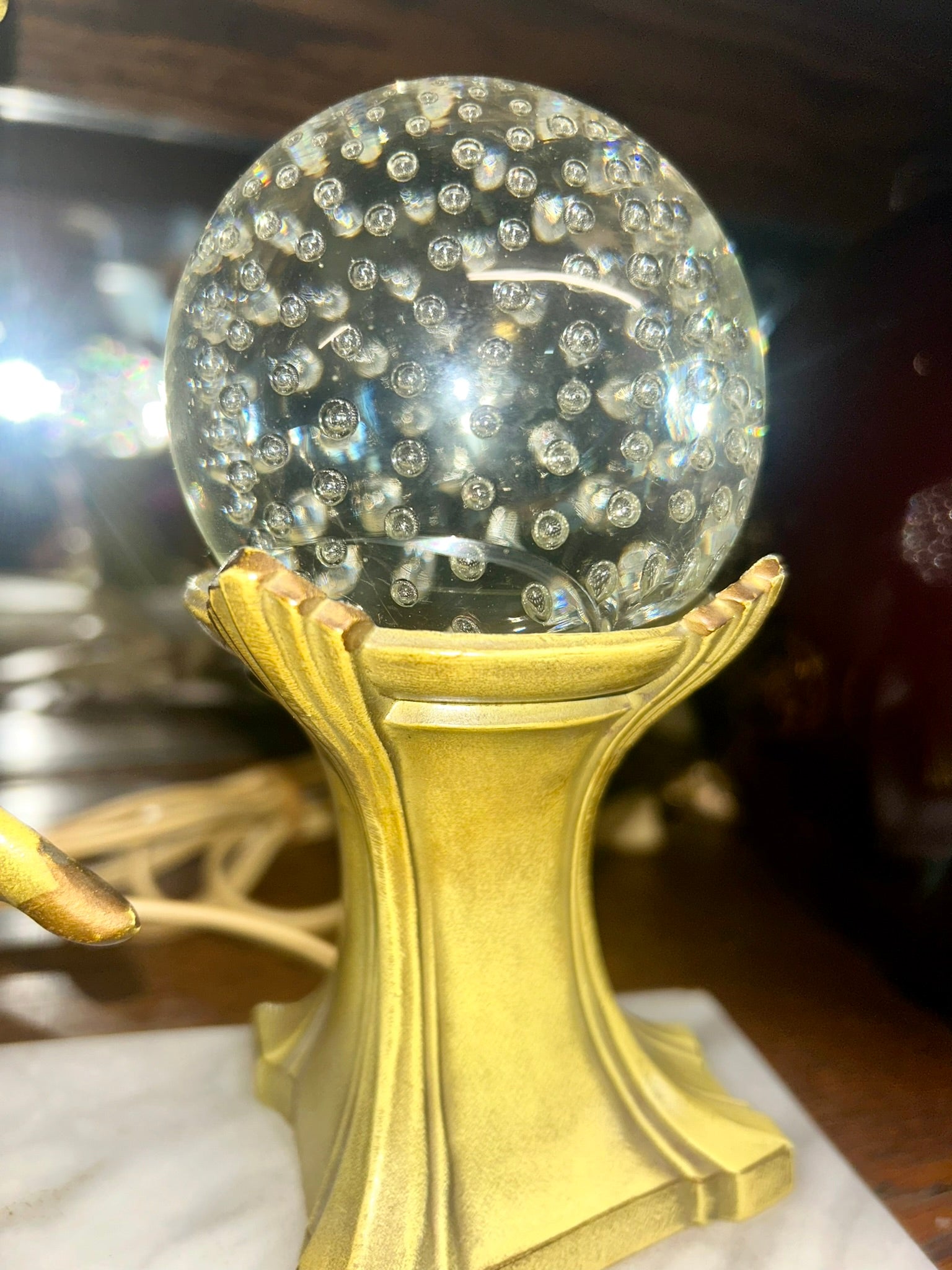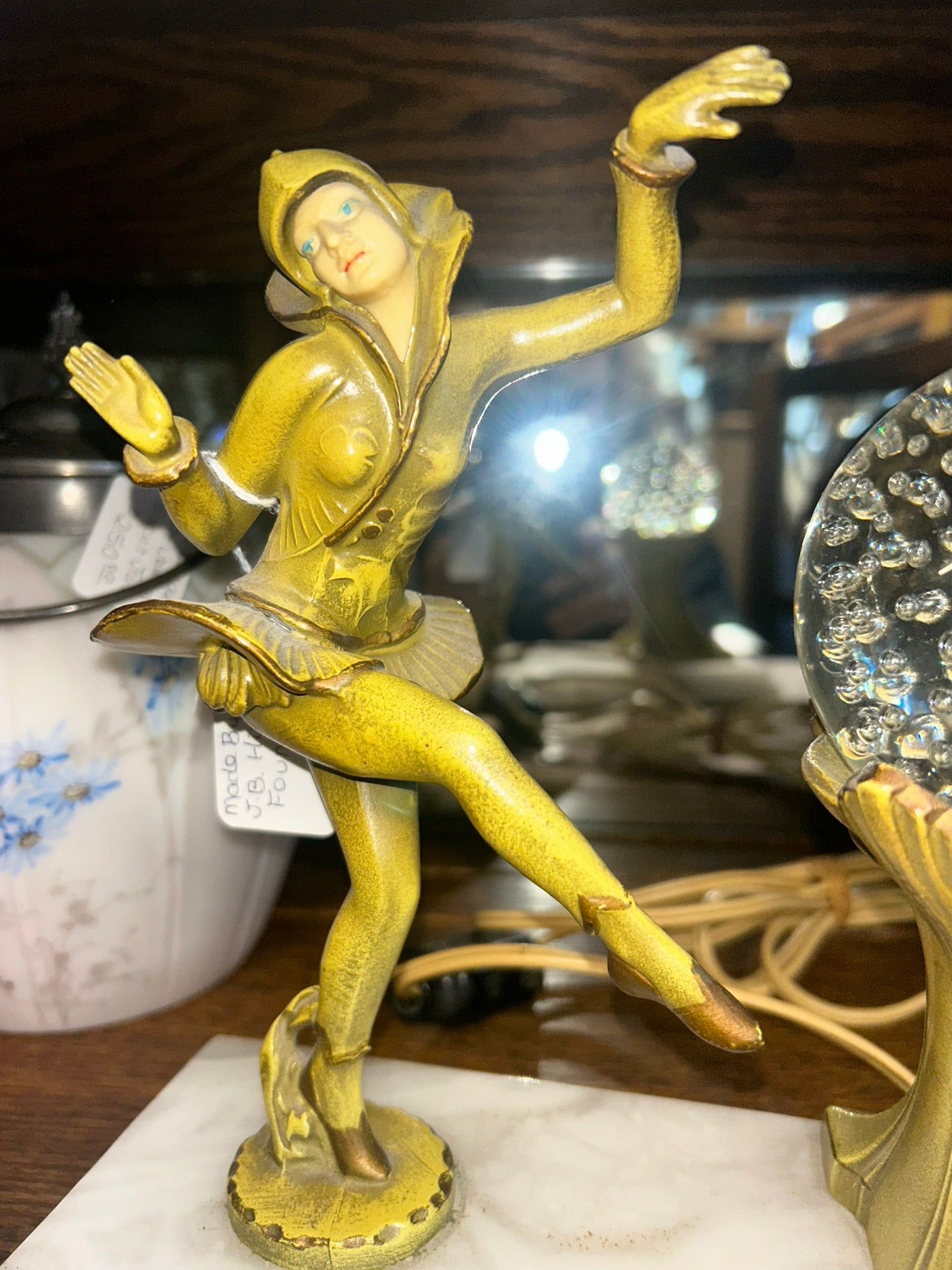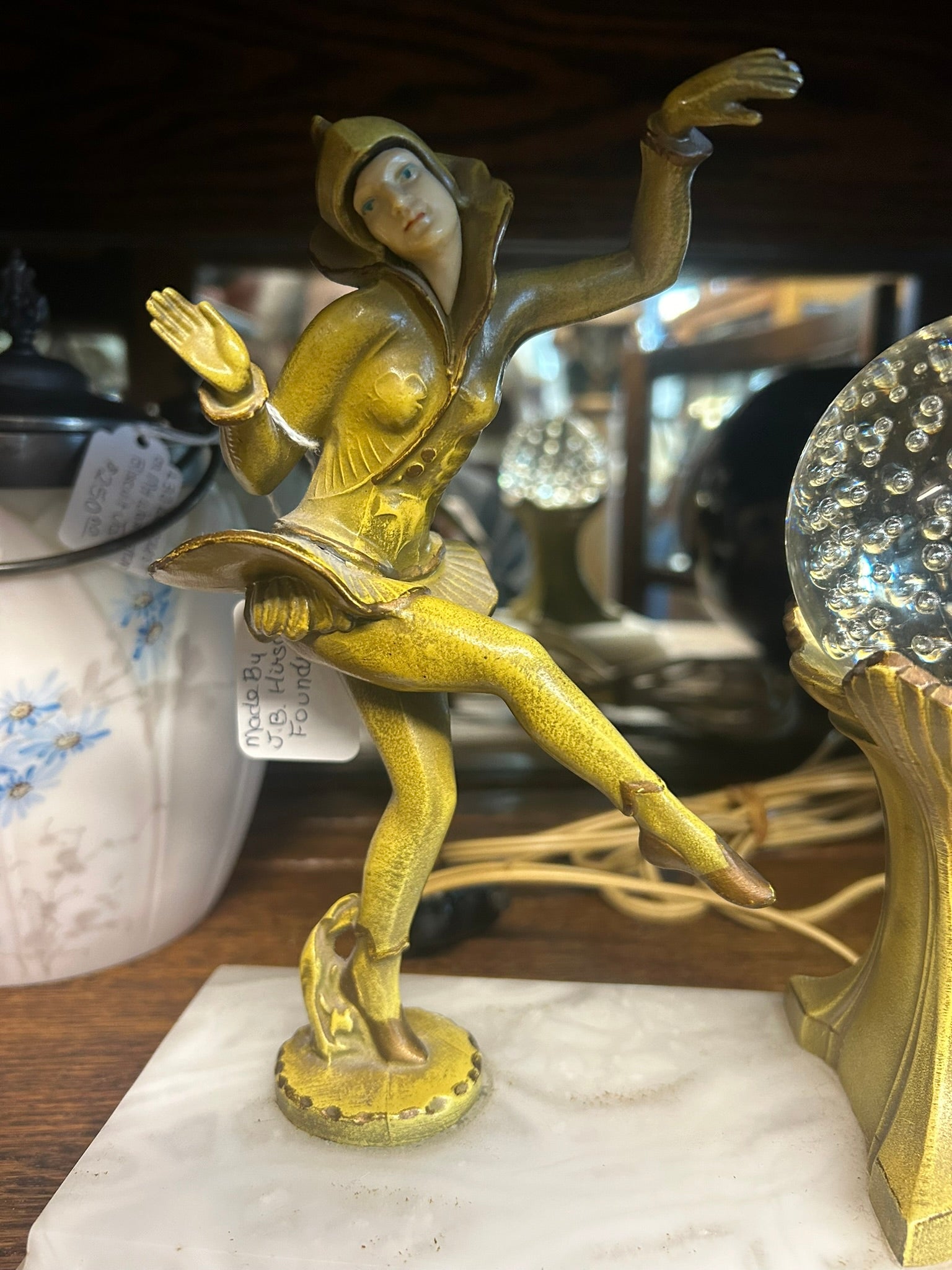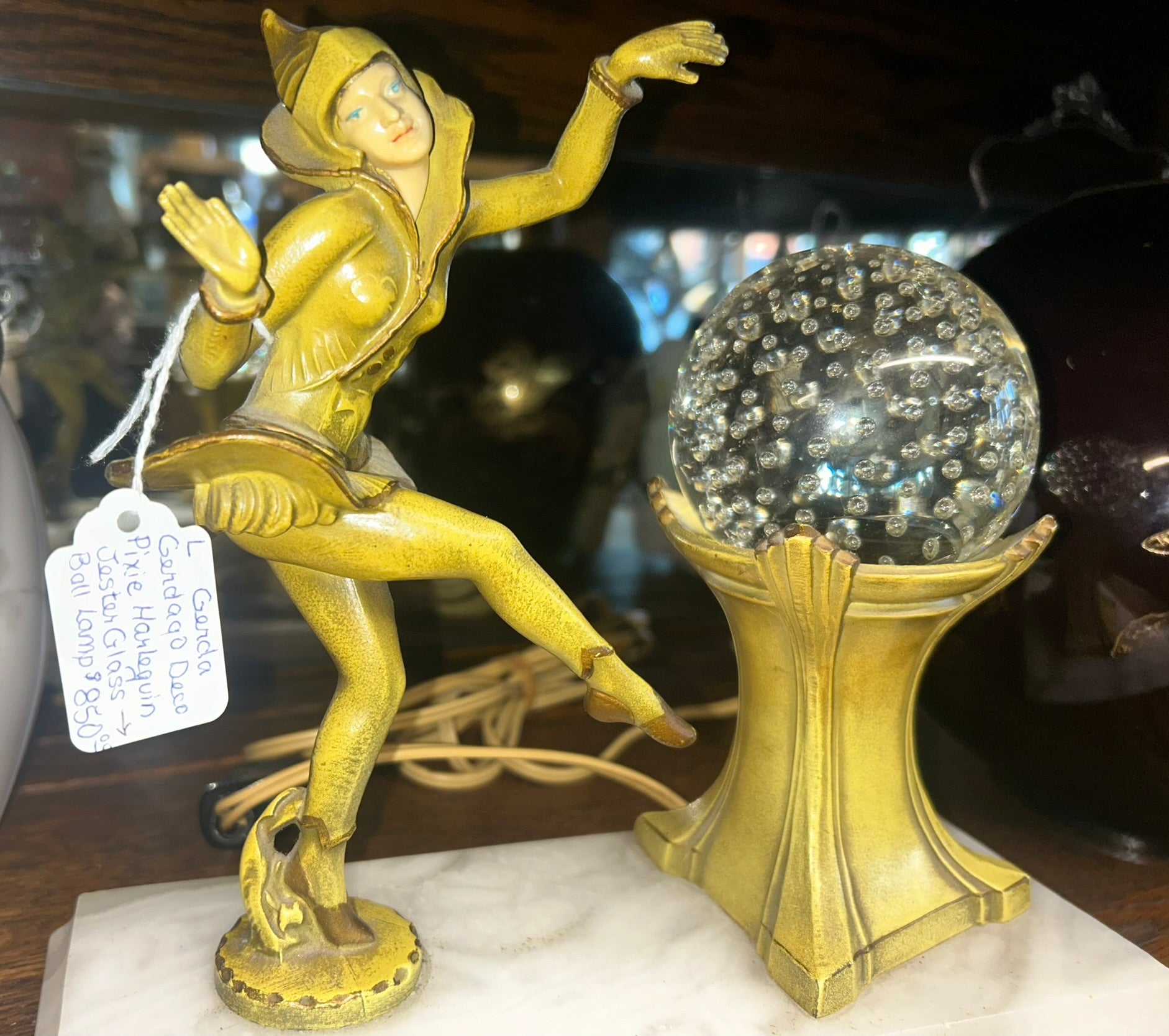 ART DECO HARLEQUIN DECO PIXIE JESTER AND GLASS BALL LAMP BY GERDA GERDAGO 9" TALL. CALL OR TEXT FOR MORE INFORMATION