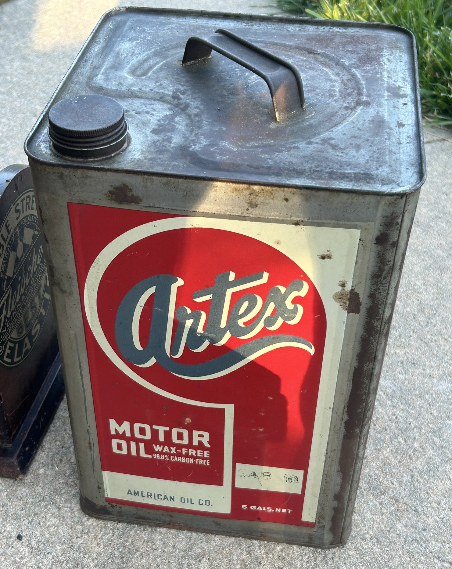 ARTEX MOTOR OIL 5 GALLON ANTIQUE TIN CONTAINER 14" TALL. CALL OR TEXT FOR MORE INFORMATION