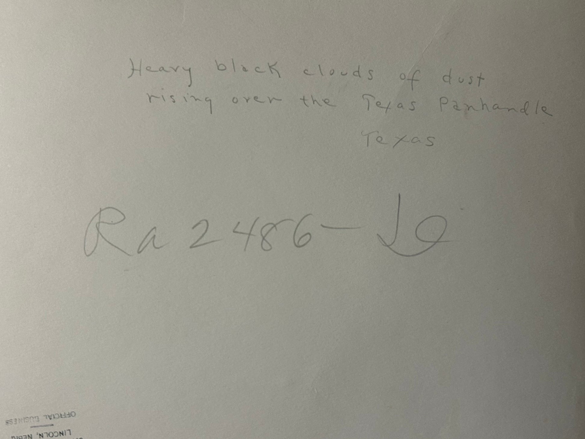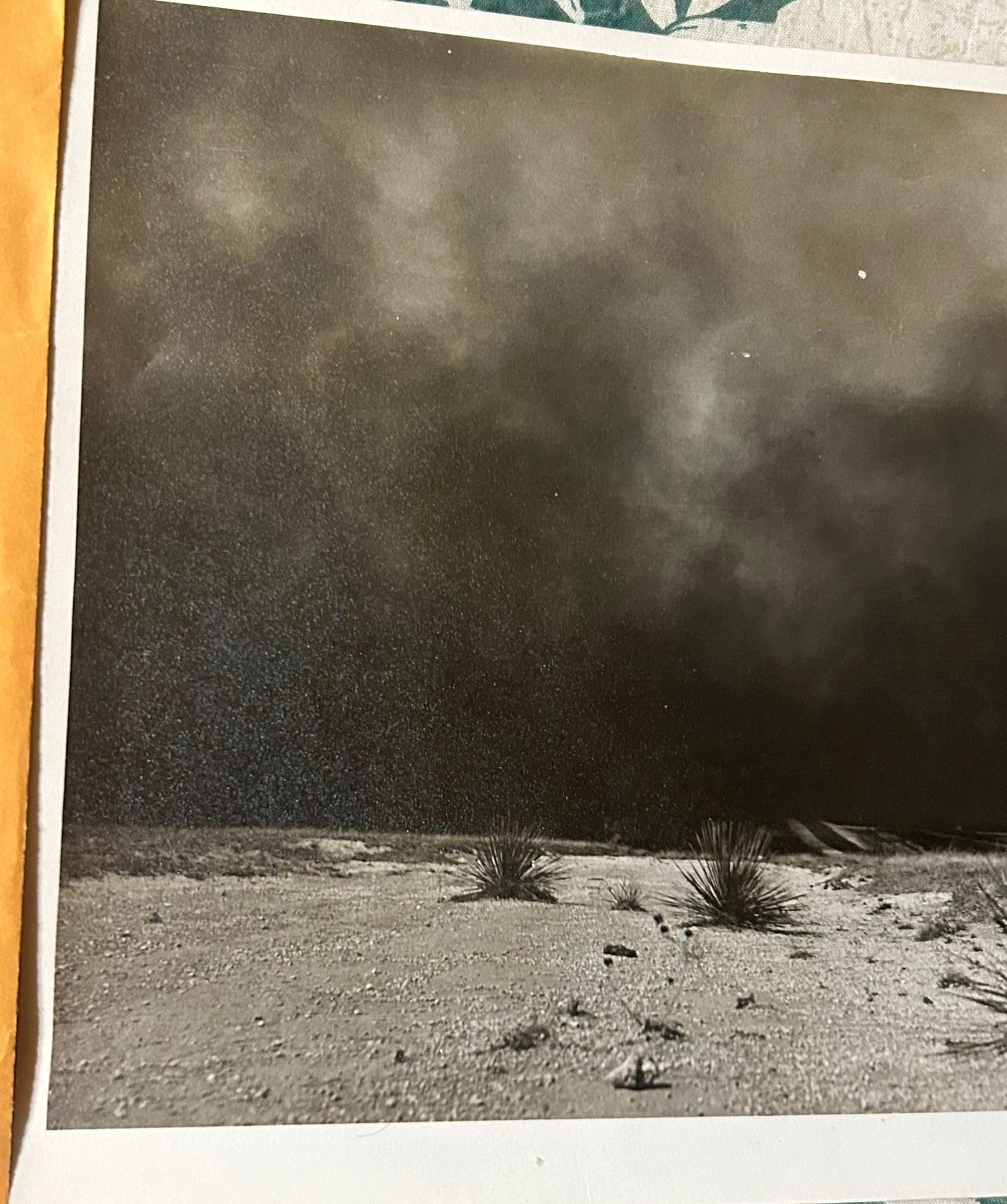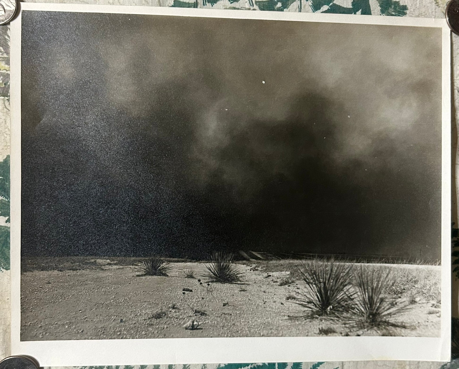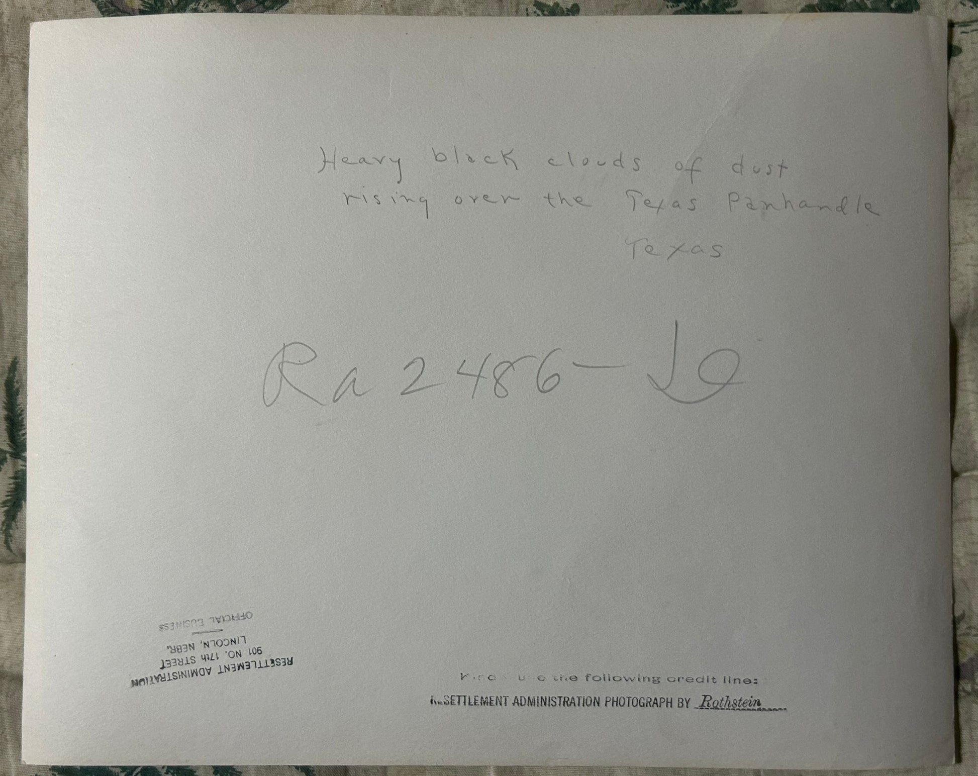 ARTHUR ROTHSTEIN 8" X 10" PHOTOGRAPH OF "HEAVY BLACK CLOUDS OF DUST RISING OVER THE TEXAS PANHANDLE" RESETTLEMENT ADMINISTRATION STAMPS ON BACK. CALL, TEXT, OR E-MAIL FOR MORE INFORMATION
