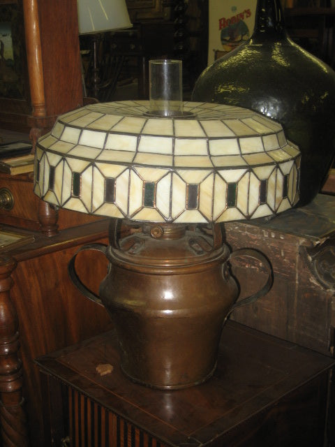 ARTS AND CRAFTS EARLY 1900's HAMMERED COPPER LAMP WITH LEADED SHADE