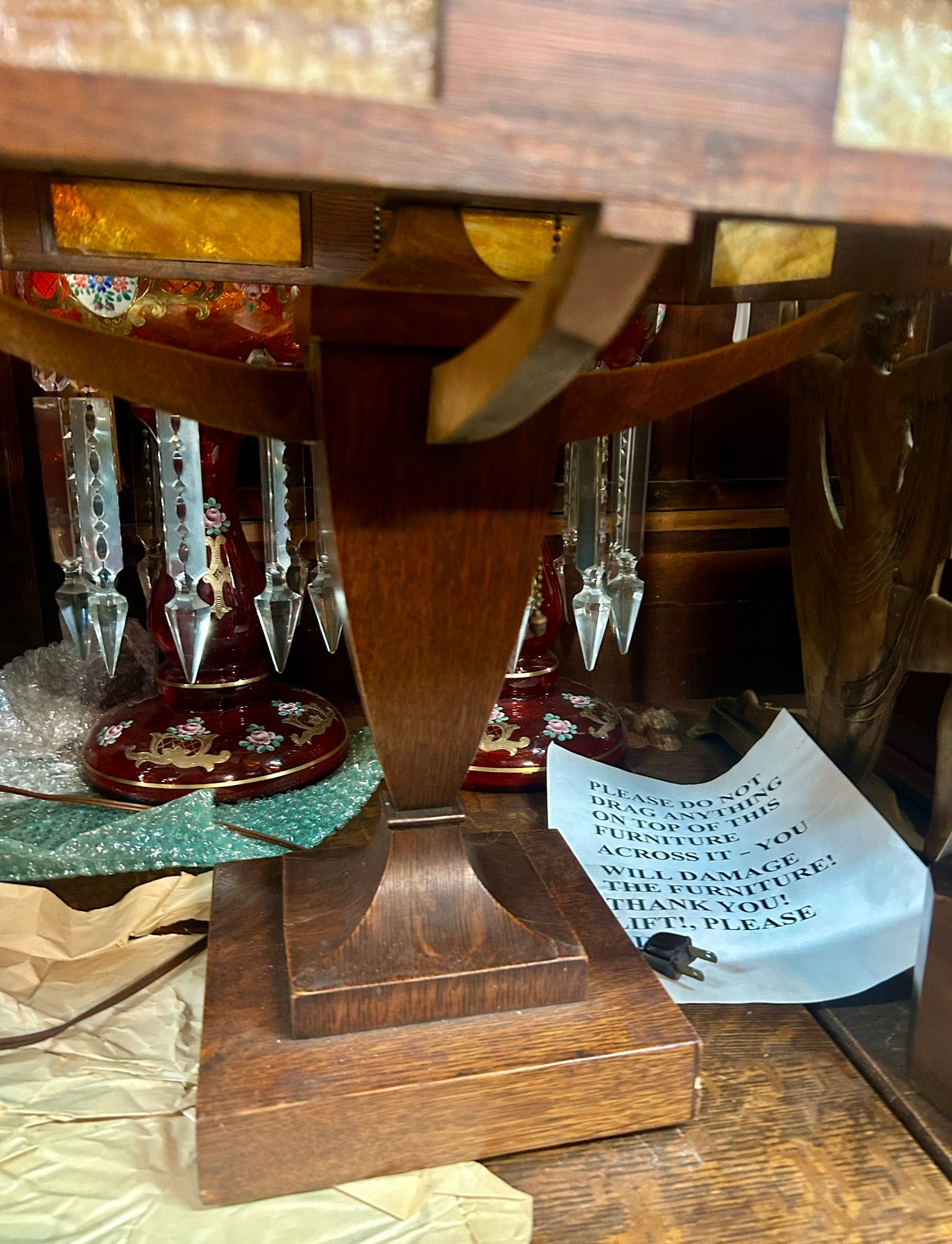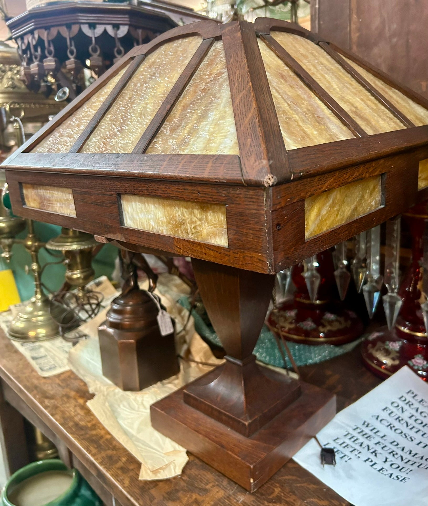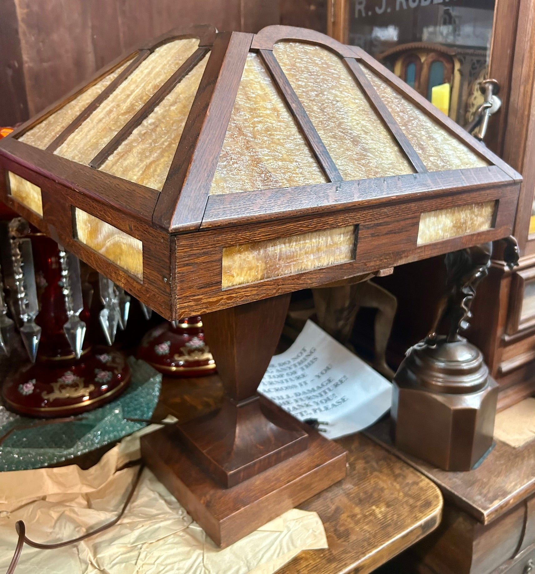 ARTS AND CRAFTS MISSION OAK AND SLAG GLASS TABLE LAMP 23" TALL X 17" WIDE. CALL OR TEXT FOR MORE INFORMATION