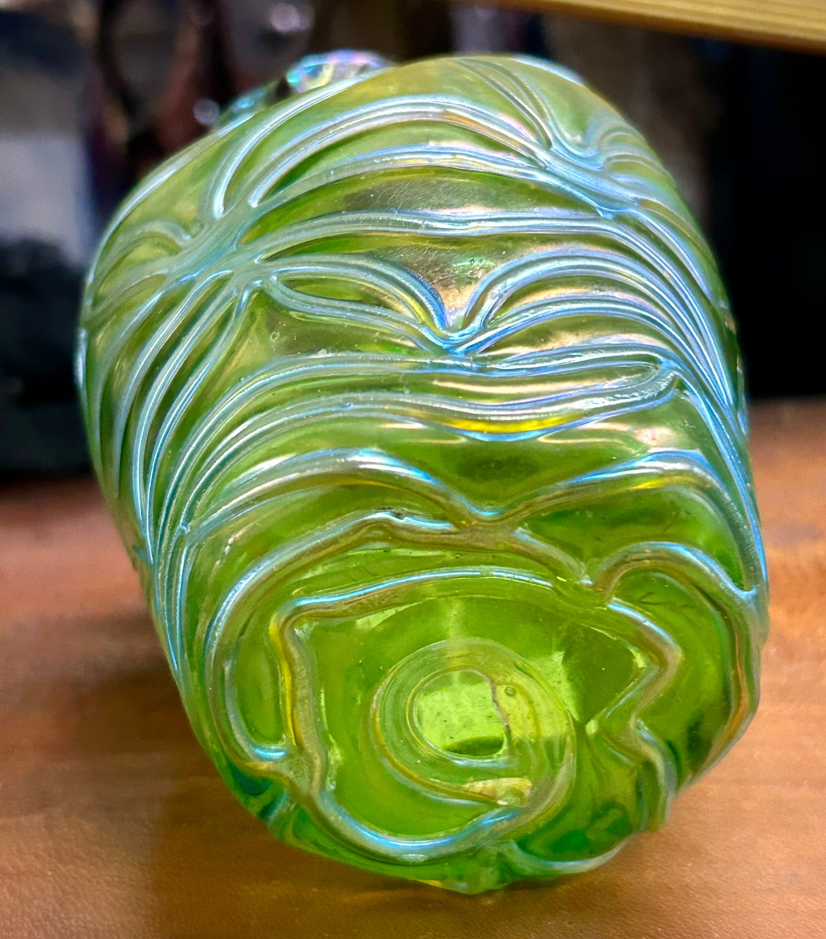 AUSTRIAN GREEN IRIDESCENT ART GLASS VASE 4 1/2" TALL. CALL, TEXT, OR E-MAIL FOR MORE INFORMATION