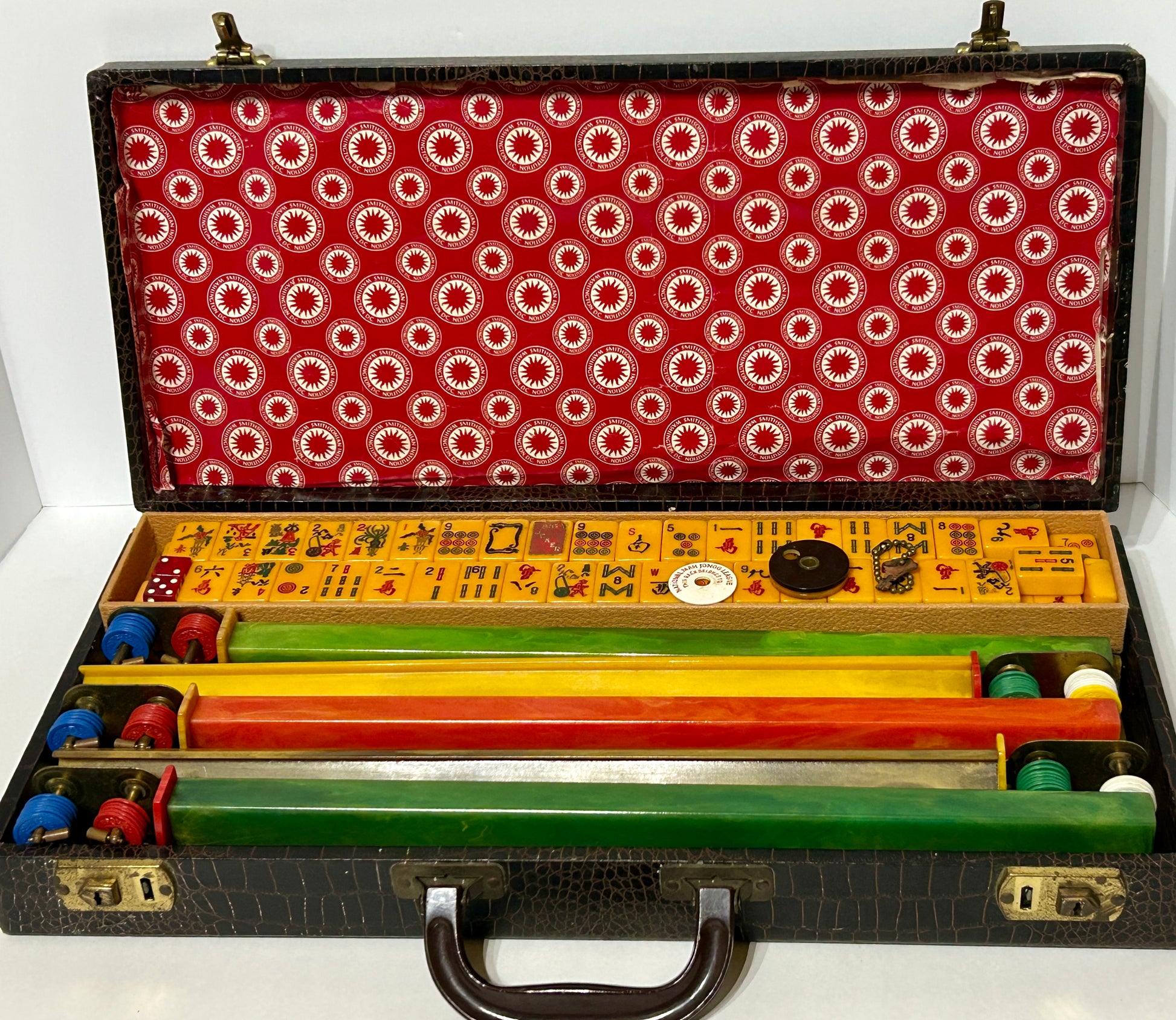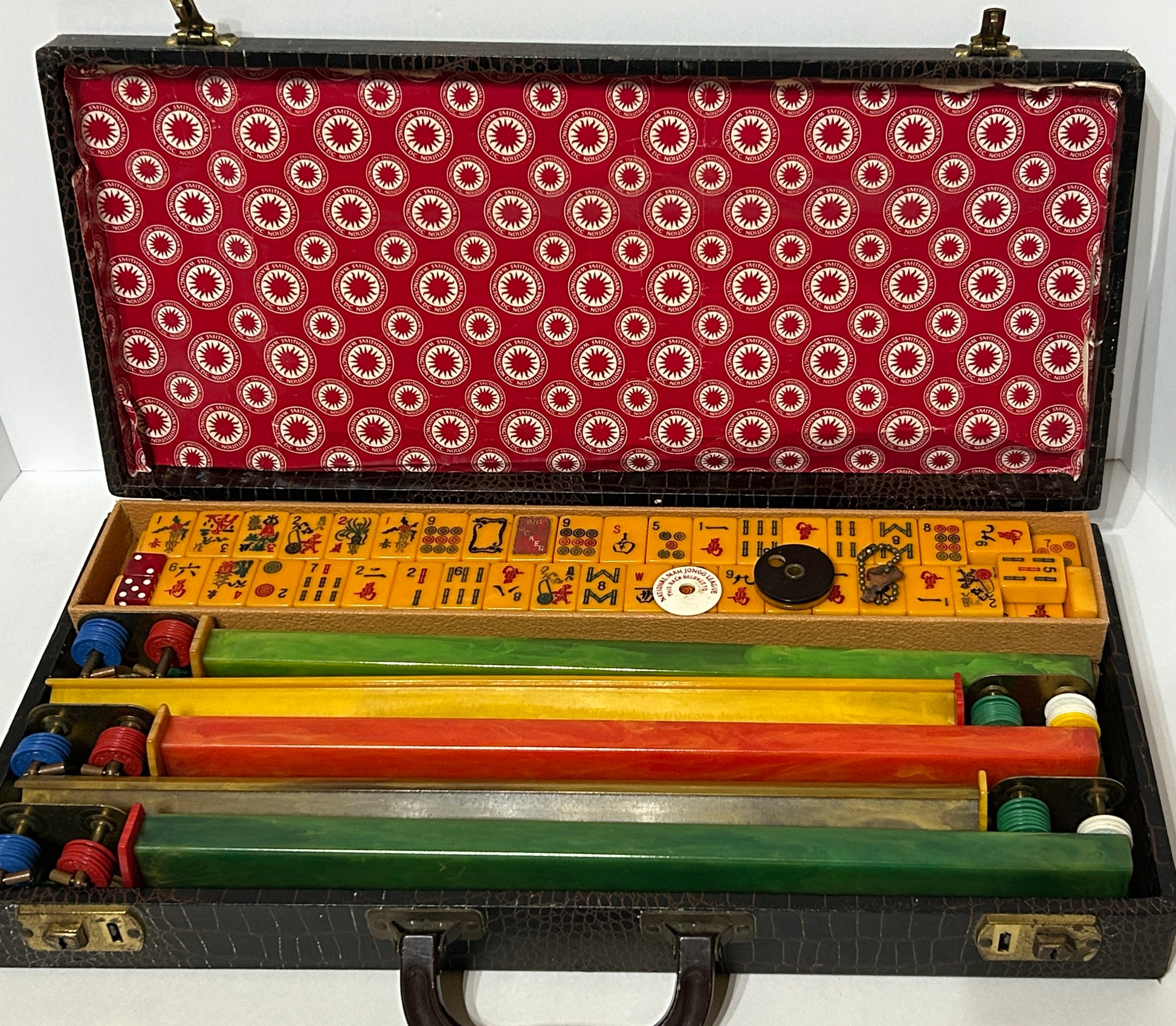 BAKELITE MAHJONG SET IN CASE INCLUDING TILES AND COUNTERS, ETC., 9" X 19 1/2". CALL OR TEXT FOR MORE INFORMATION