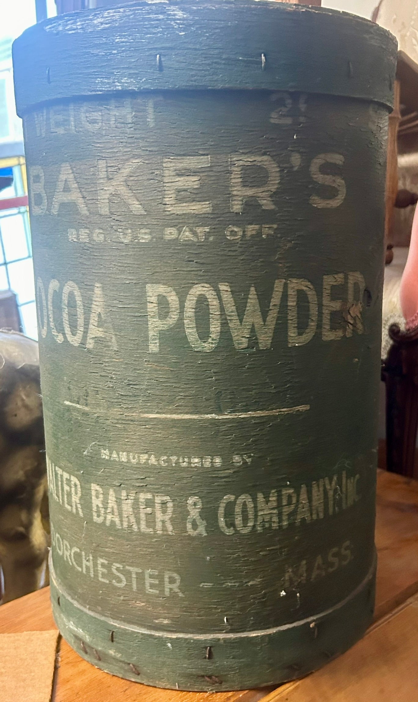 BAKERS COCOA POWDER ANTIQUE WOODEN ADVERTISING CONTAINER 18" X 11". CALL OR TEXT FOR MORE INFORMATION