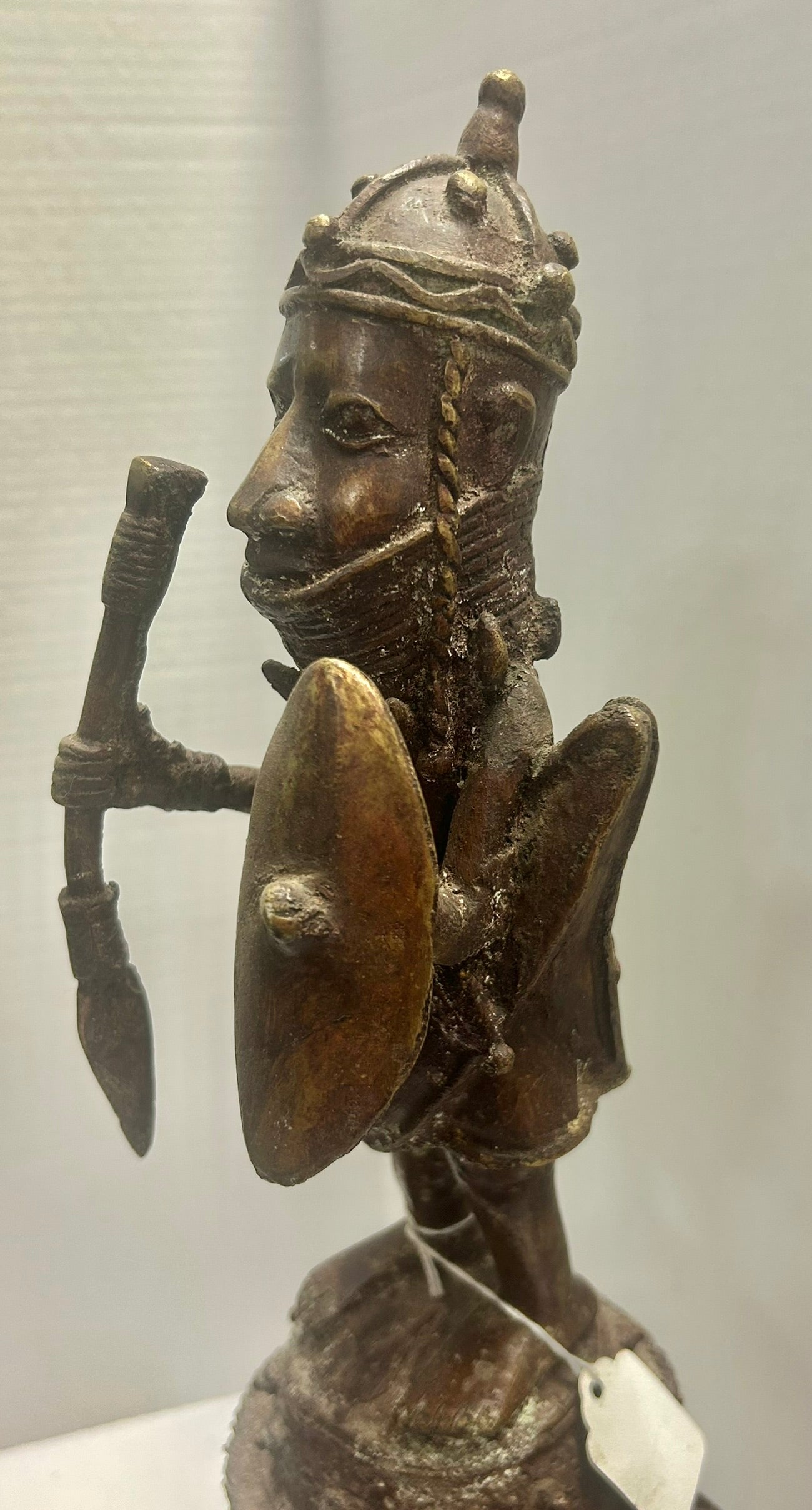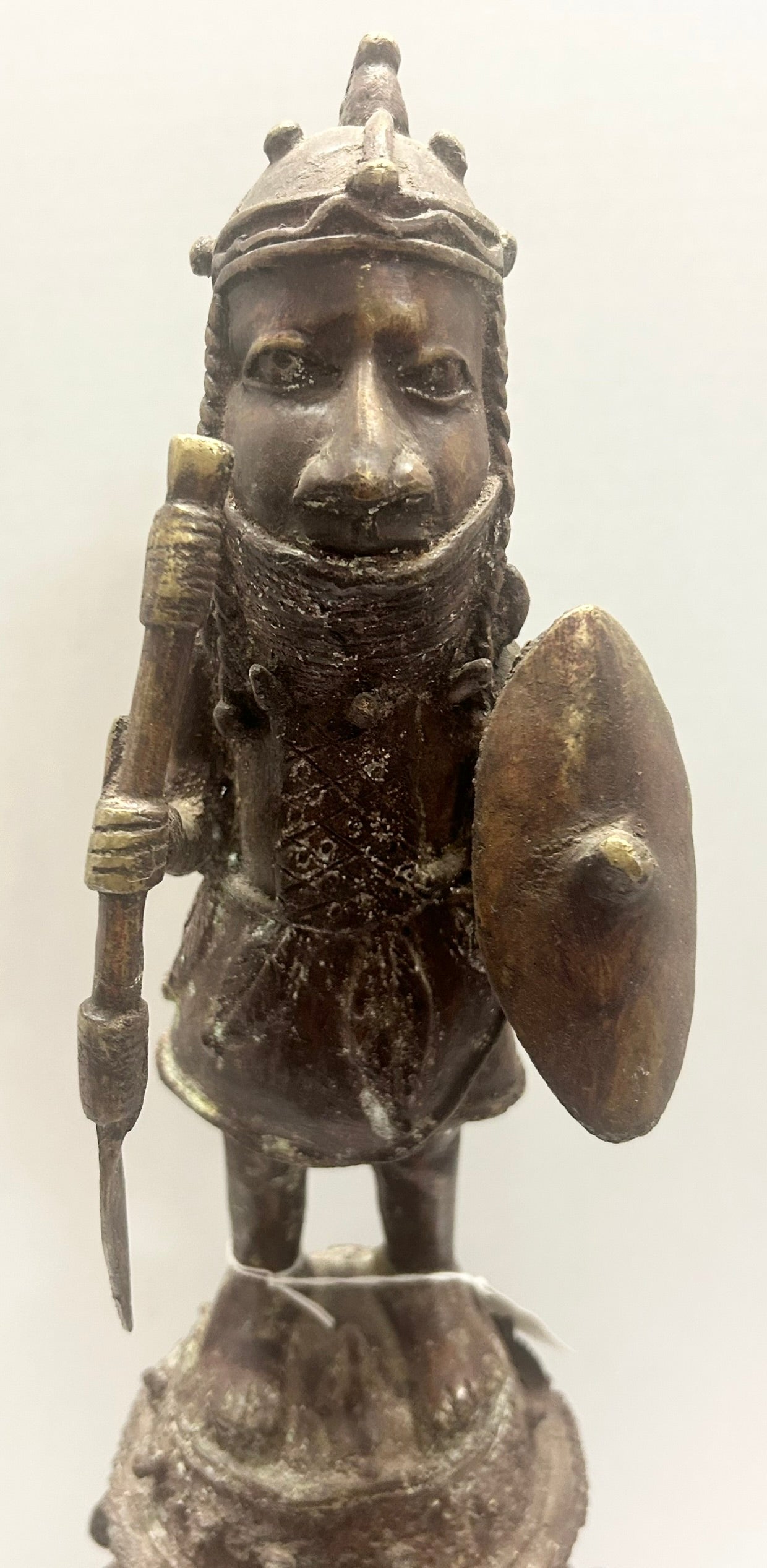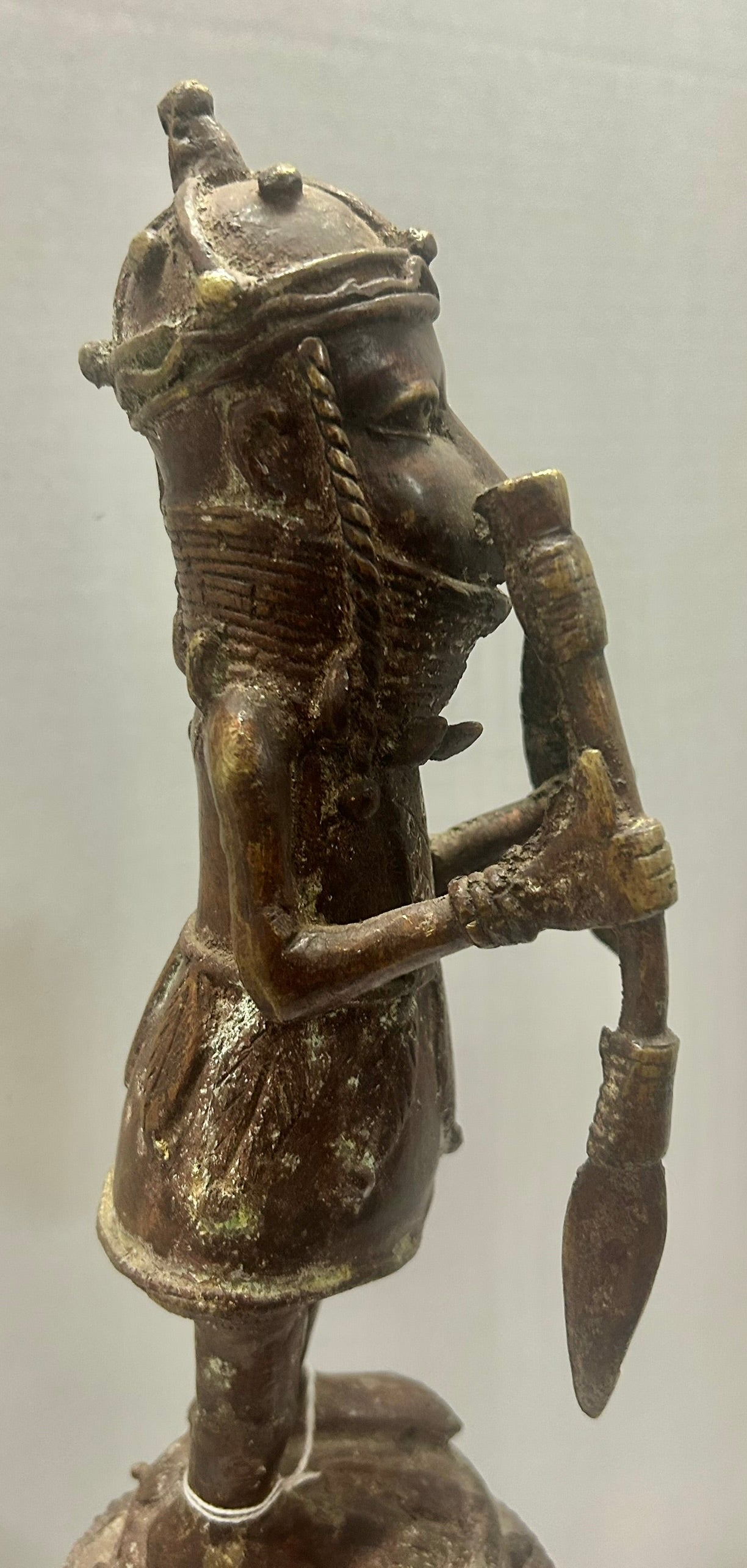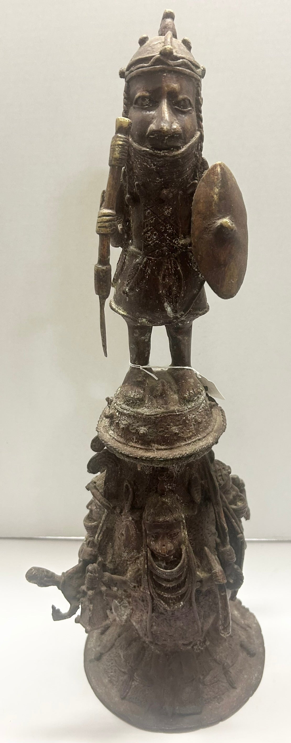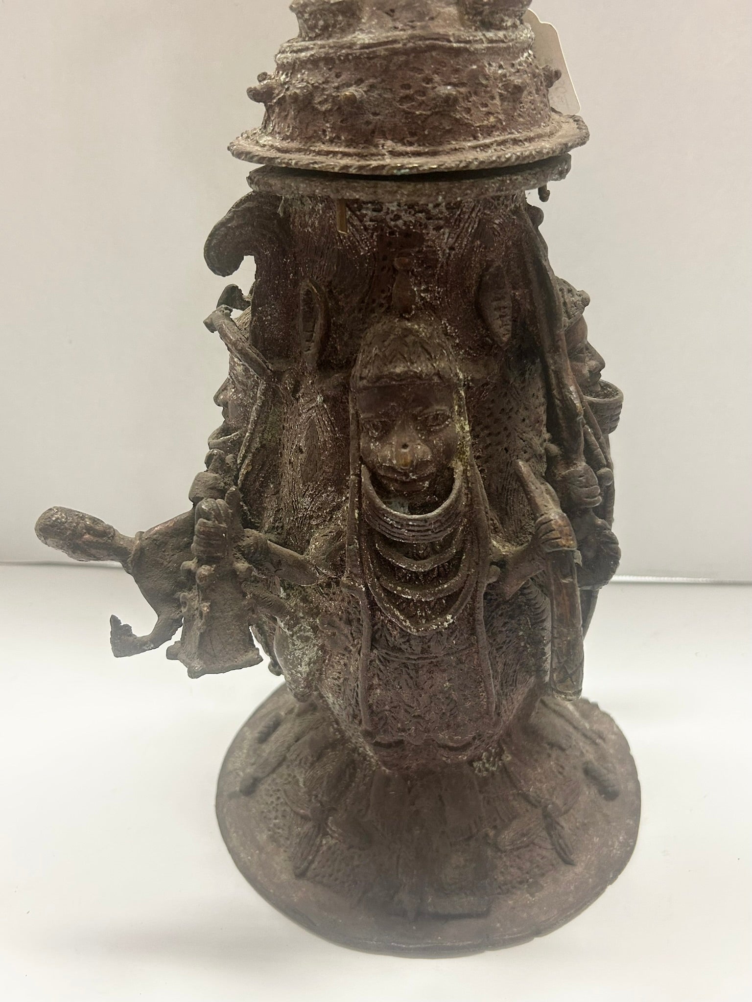 BENIN AFRICAN BRONZE FIGURAL VESSEL 23 1/2" TALL. CALL OR TEXT FOR MORE INFORMATION