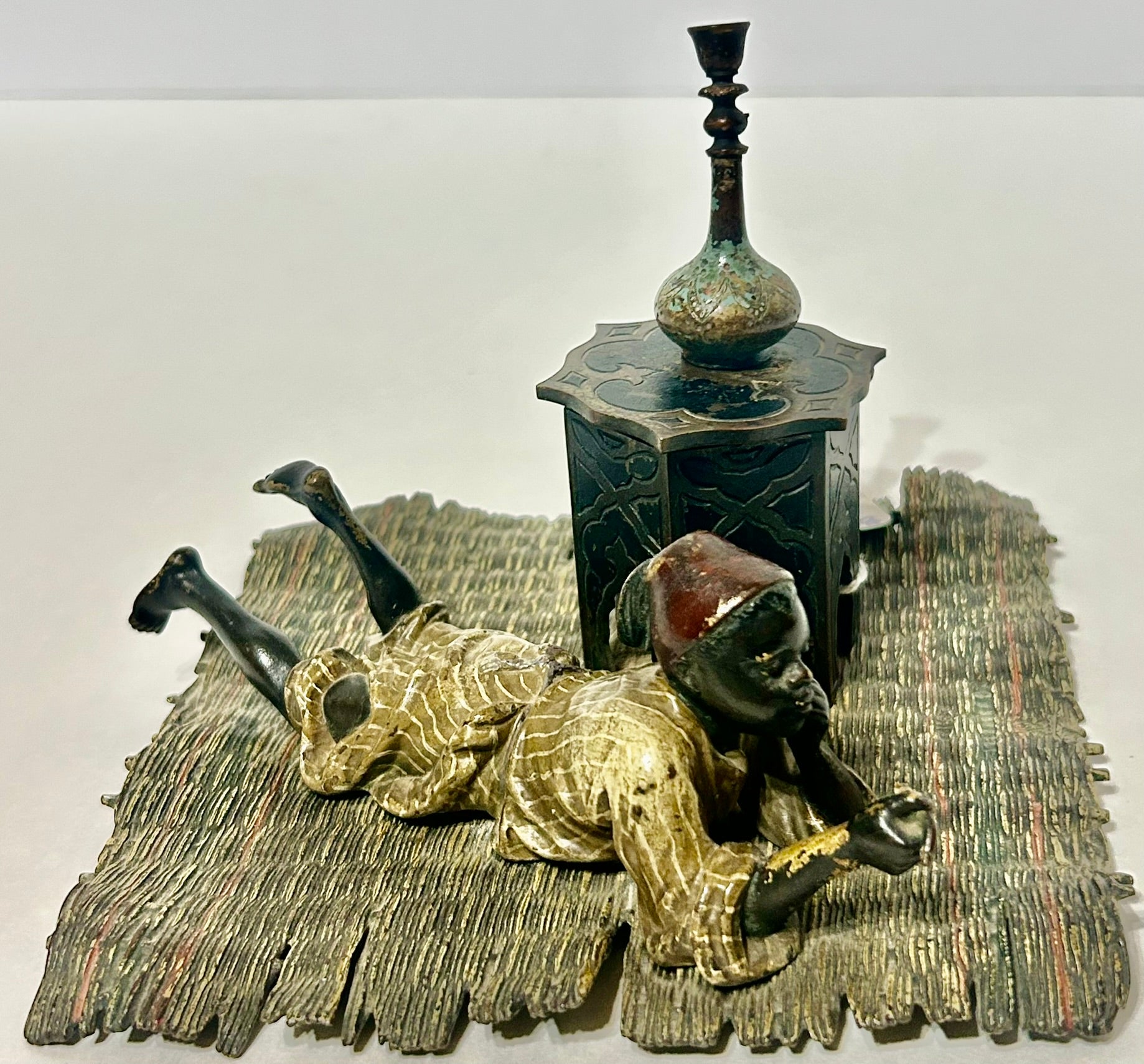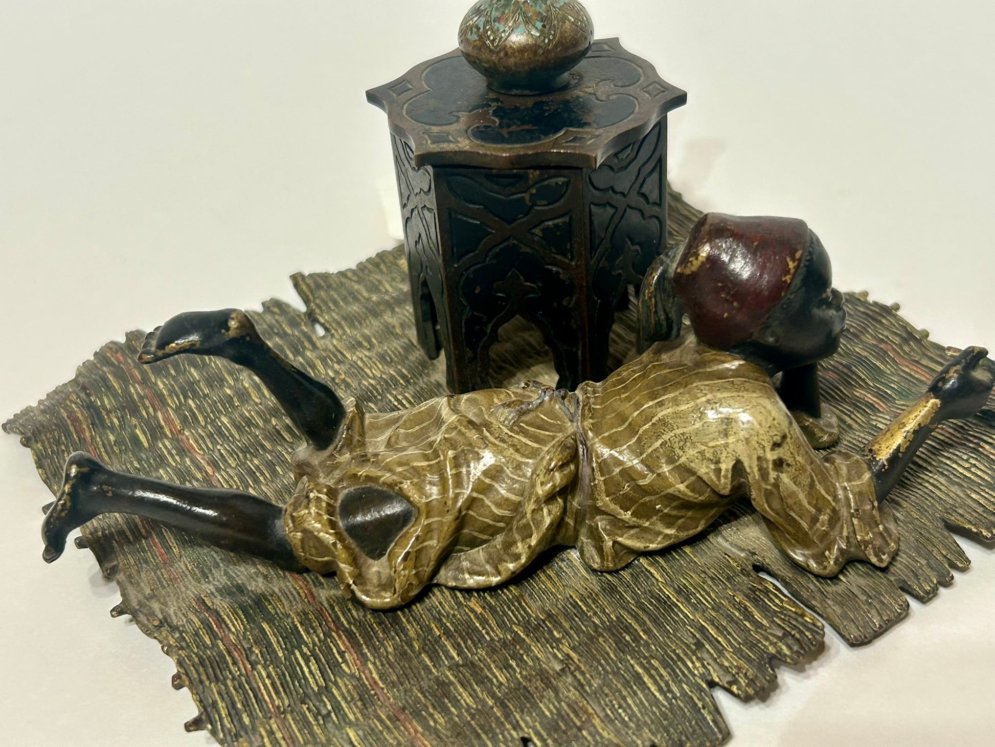 FRANZ BERGMAN VIENNA BRONZE OF BOY ON RUG INKWELL WITH MISSING GLASS INSERT 5" X 5 1/2" X 4 1/2" TALL. CALL OR TEXT FOR MORE INFORMATION