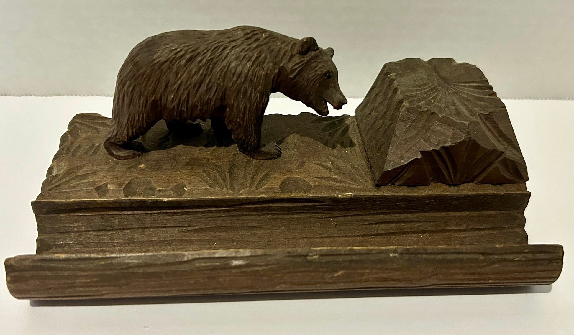 BLACK FOREST CARVED FIGURAL BEAR ANTIQUE INKWELL 7" LONG X 3" TALL. CALL OR TEXT FOR MORE INFORMATION